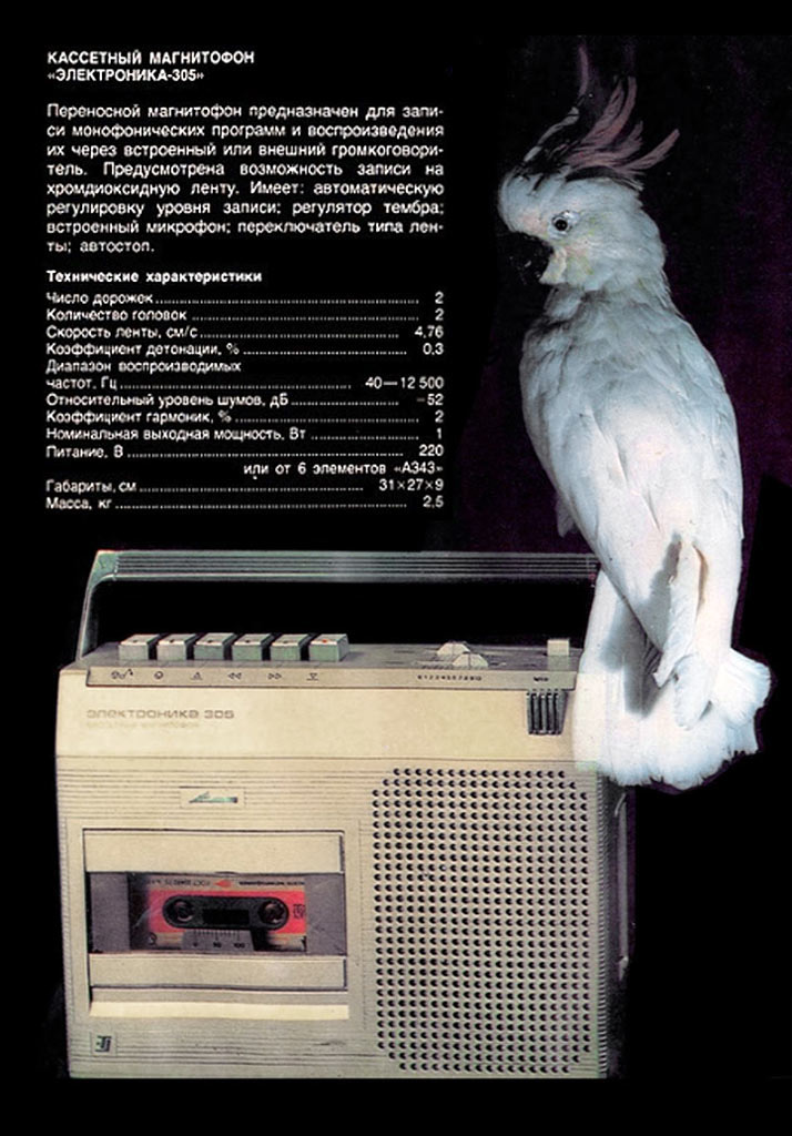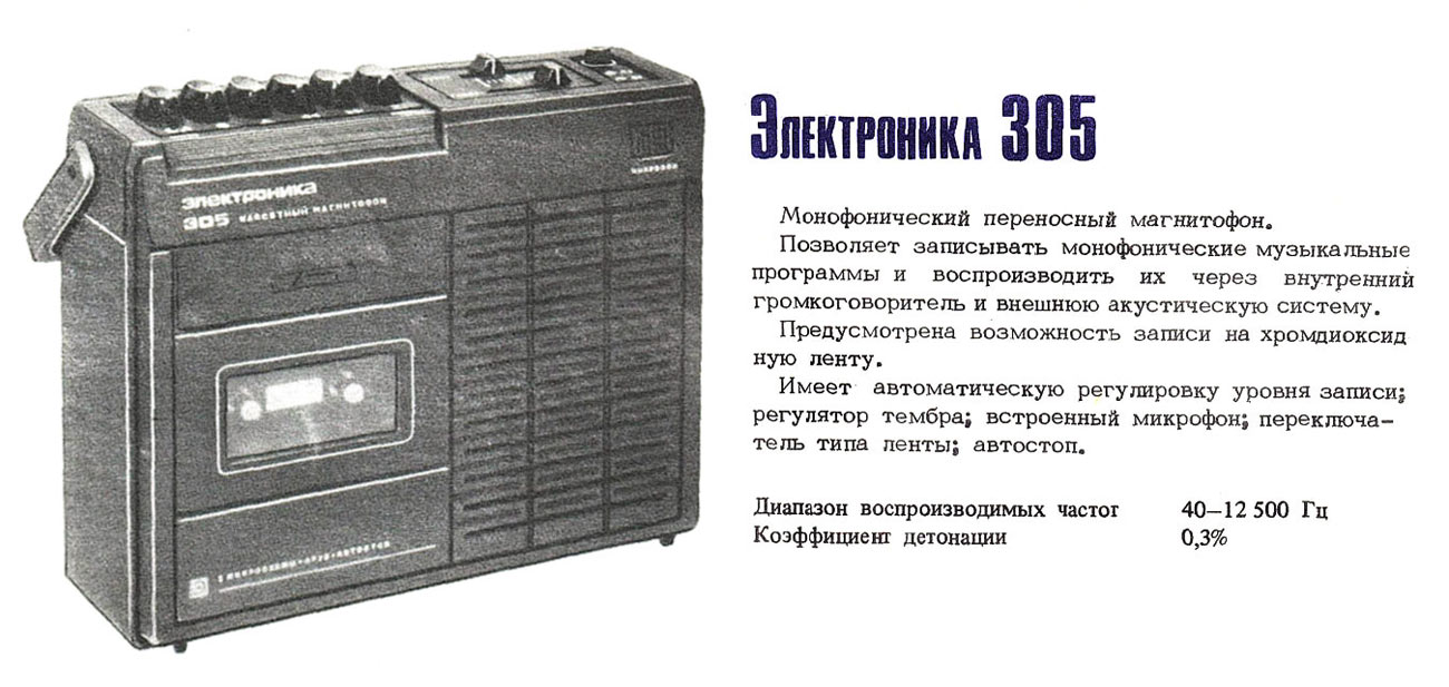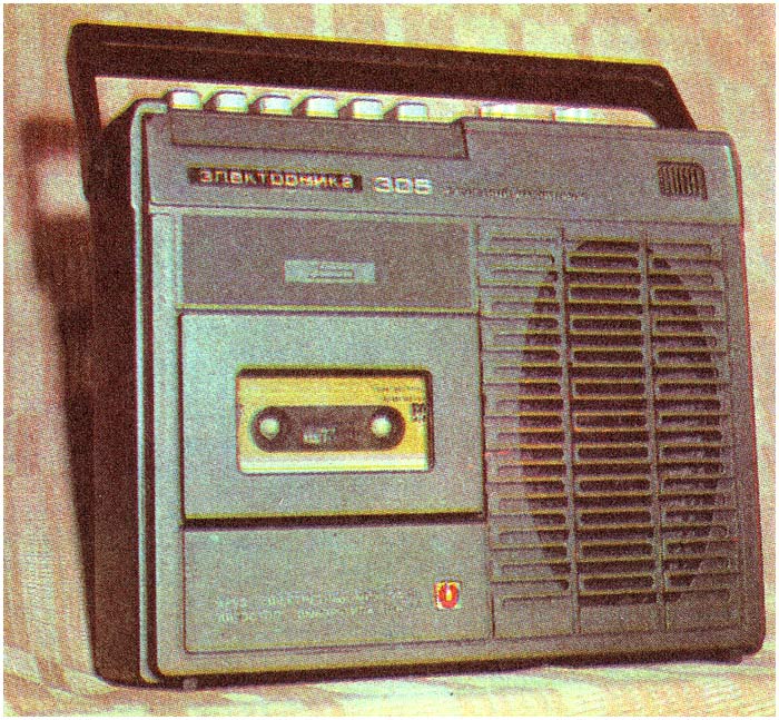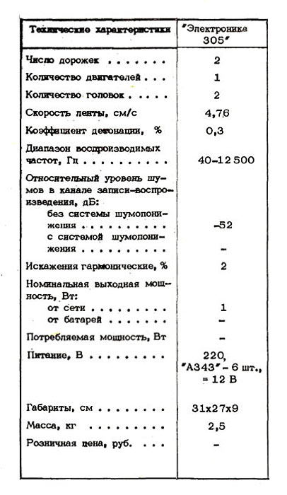 Переносный кассетный магнитофон *Электроника-305* подготовил к выпуску с 1983 года Саратовский завод *Корпус*. Магнитофон предназначен для записи на кассету МК-60 звуковых программ от телевизора и радиоприёмника, другого магнитофона, электропроигрывателя, встроенного электретного микрофона и воспроизведения записанных фонограмм через внутренний громкоговоритель типа 2ГД-40Р или внешнюю АС. В магнитофоне имеется переключатель типа ленты, автостоп, раздельные регуляторы уровня записи и воспроизведения, регулятор тембра по ВЧ световой индикатор включения в электрическую сеть. Имеется кнопка временной остановки ленты, смешивания сигналов с микрофонного и других входов, записи с АРУЗ. Магнитофон питается от сети 220 вольт через выносной блок питания или от 6 элементов 343. Скорость протяжки ленты 4,76 см/с. Коэффициент детонации ЛПМ - ±0,3%. Диапазон частот звука на линейном выходе 40...12500 Гц. Коэффициент гармоник на линейном выходе 4%. Относительный уровень шумов и помех в канале З/В с устройством ШП -50 дБ. Максимальная выходная мощность 2 Вт. Габариты магнитофона - 248х205х75 мм. Масса 2,5 кг. Ориентировочная цена от 150 до 172 рублей. Магнитофон разработан в нескольких вариантах оформления. Нет информации что магнитофон выпускался серийно.