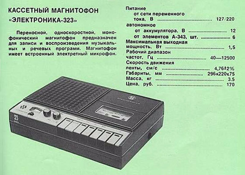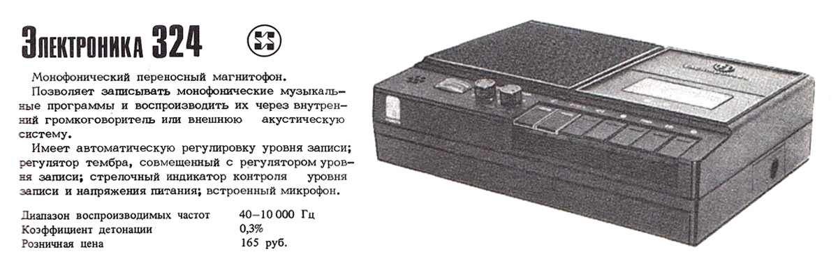 Портативные кассетные магнитофоны *Электроника-323*, *Электроника-323-1*и *Электроника-324*, *Электроника-324-1* с 1981 года (без цифры *1*) и с 1987 года (с цифрой *1*) выпускал Нововоронежский завод *Алиот*. Магнитофоны предназначены для записи и воспроизведения звуковых фонограмм. Встроенный сетевой блок питания, питание от батарей и аккумулятора автомобиля, делает магнитофоны удобными в применении. По схеме и конструкции магнитофоны схожи, отличие в отсутствии встроенного электретного микрофона в магнитофоне **Электроника-324**. С 1987 года выпускались модернизированные магнитофоны **Электроника-323-1** и **Электроника-324-1** кроме оформления не отличаются от базовых. В отдельных сериях модернизированных магнитофонов в предварительные усилители вместо транзисторов ставили микросхему серии К118УН.