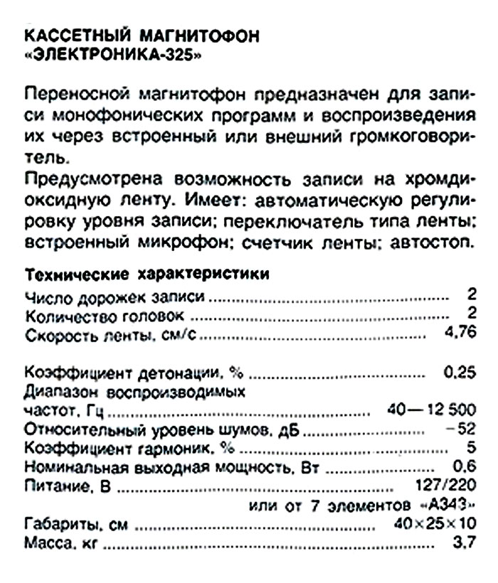 Портативный кассетный магнитофон *Электроника-325* (Электроника МФ-325) разработал и подготовил к выпуску с начала 1985 года Нововоронежский завод *Алиот*. В производство по каким-то причинам магнитофон не запущен, было изготовлено только несколько опытных экземпляров. Описание магнитофона *Электроника-325* и его технические характеристики ниже, в рекламных проспектах.