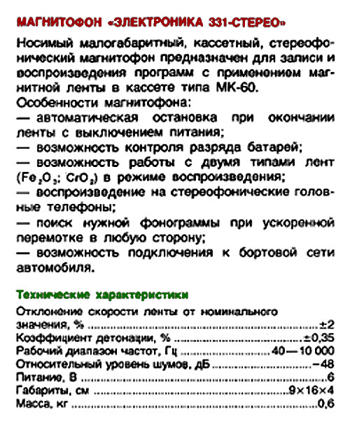 Малогабаритный кассетный магнитофон *Электроника-331-стерео* опытно выпускался с 1986 по 1989 годы Нововоронежским заводом *Алиот*.
