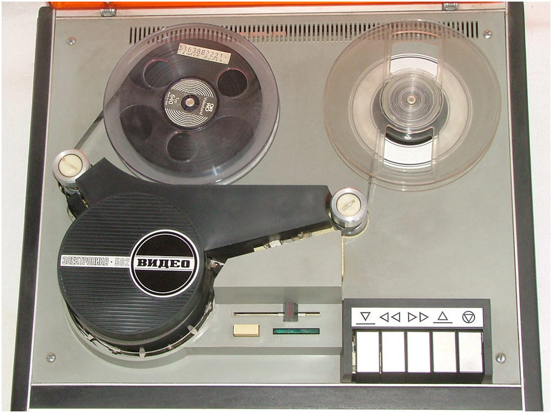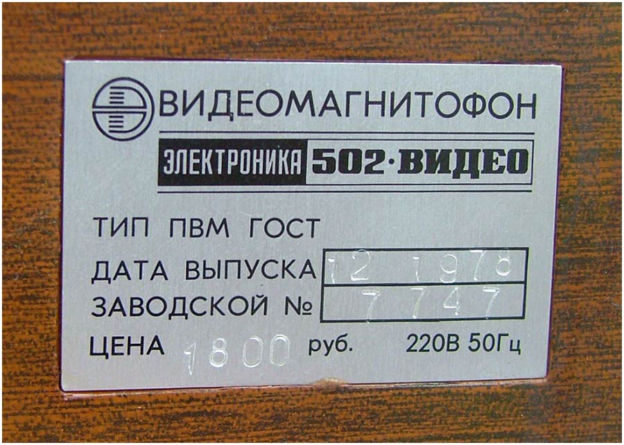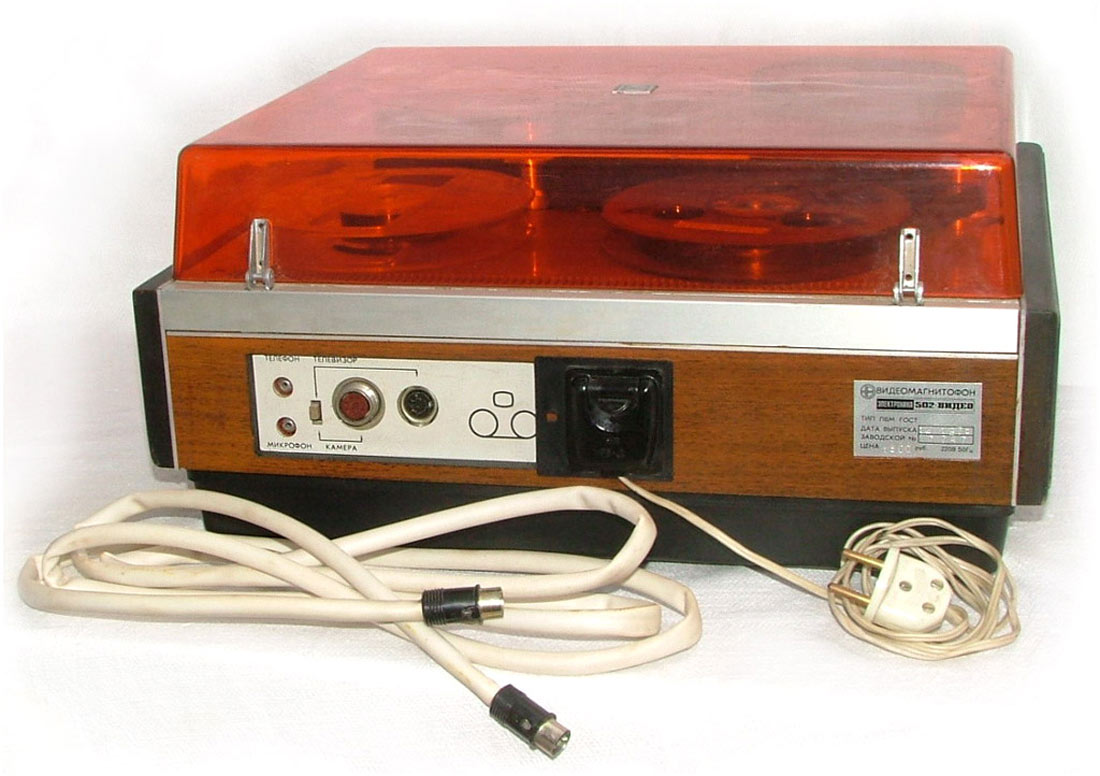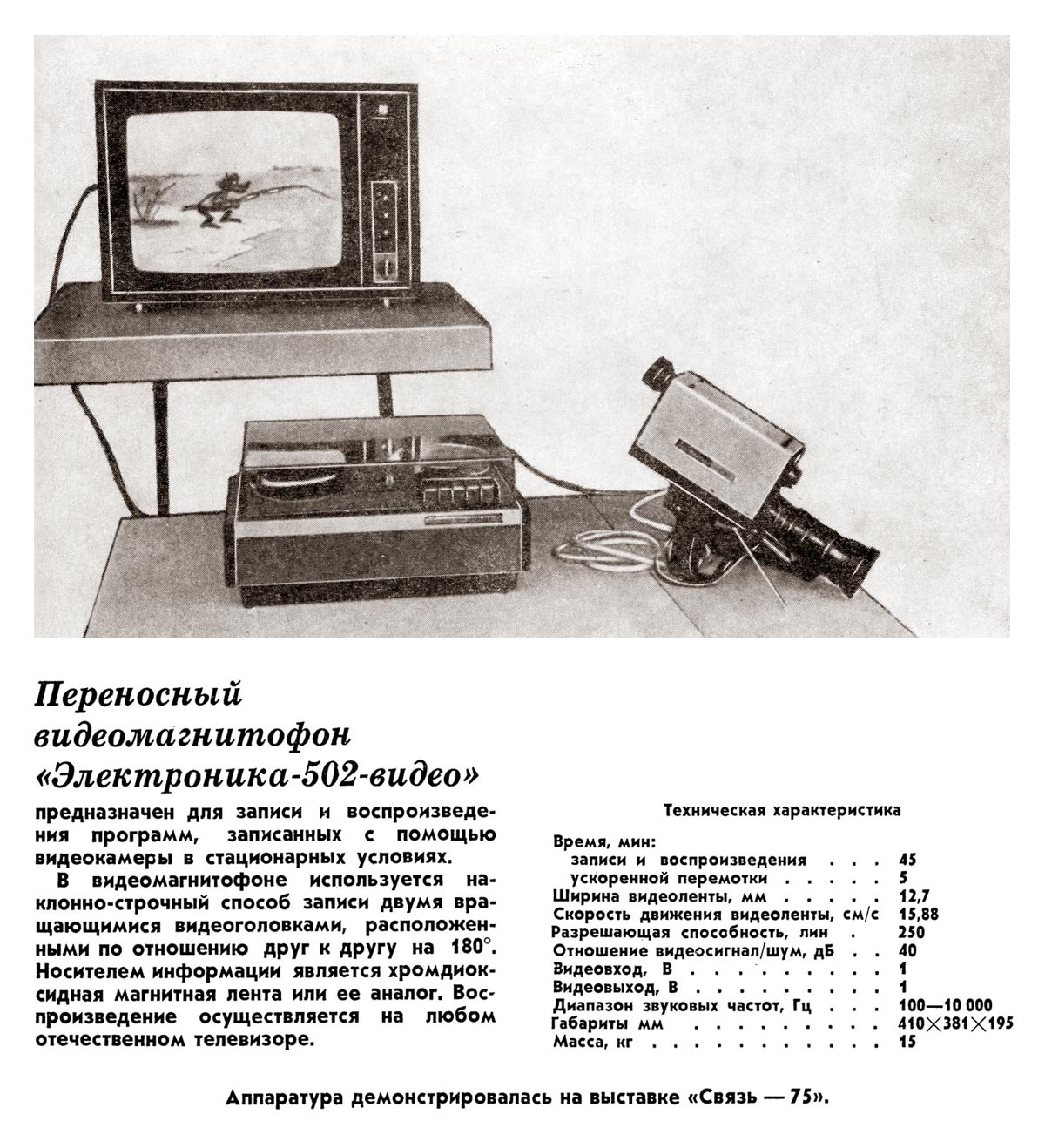 Бытовой катушечный видеомагнитофон *Электроника-502-видео* с 1976 года выпускало Воронежское НПО *Электроника*. Видеомагнитофон **Электроника-502-видео** предназначен для записи видеоинформации и звука на магнитную ленту шириной 12,7 мм и толщиной 27,5 мкм, с их последующим воспроизведением. Видеомагнитофон обеспечивает: запись звуковой и видеоинформации с телевизора не ниже 2 класса или видеокамеры **Электроника-Видео**, запись звука с микрофона, воспроизведение записанного на телевизоре, прослушивание звукового сопровождения на головные телефоны, стирание записанной информации и ускоренную перемотку ленты в любом направлении. Питание от сети переменного тока 127/220 В. Потребляемая мощность 100 Вт. Система звуко и видеозаписи наклонно-строчная, двумя вращающимися видеоголовками, ЧМ-сигнал. Время записи 45 минут, ускоренной перемотки 5 минут. Скорость движения ленты 16,32 см/сек. Разрешающая способность 250 линий. Диапазон воспроизводимых частот звука 100...10000 Гц. Габариты видеомагнитофона - 425х375х202 мм. Масса 15 кг.