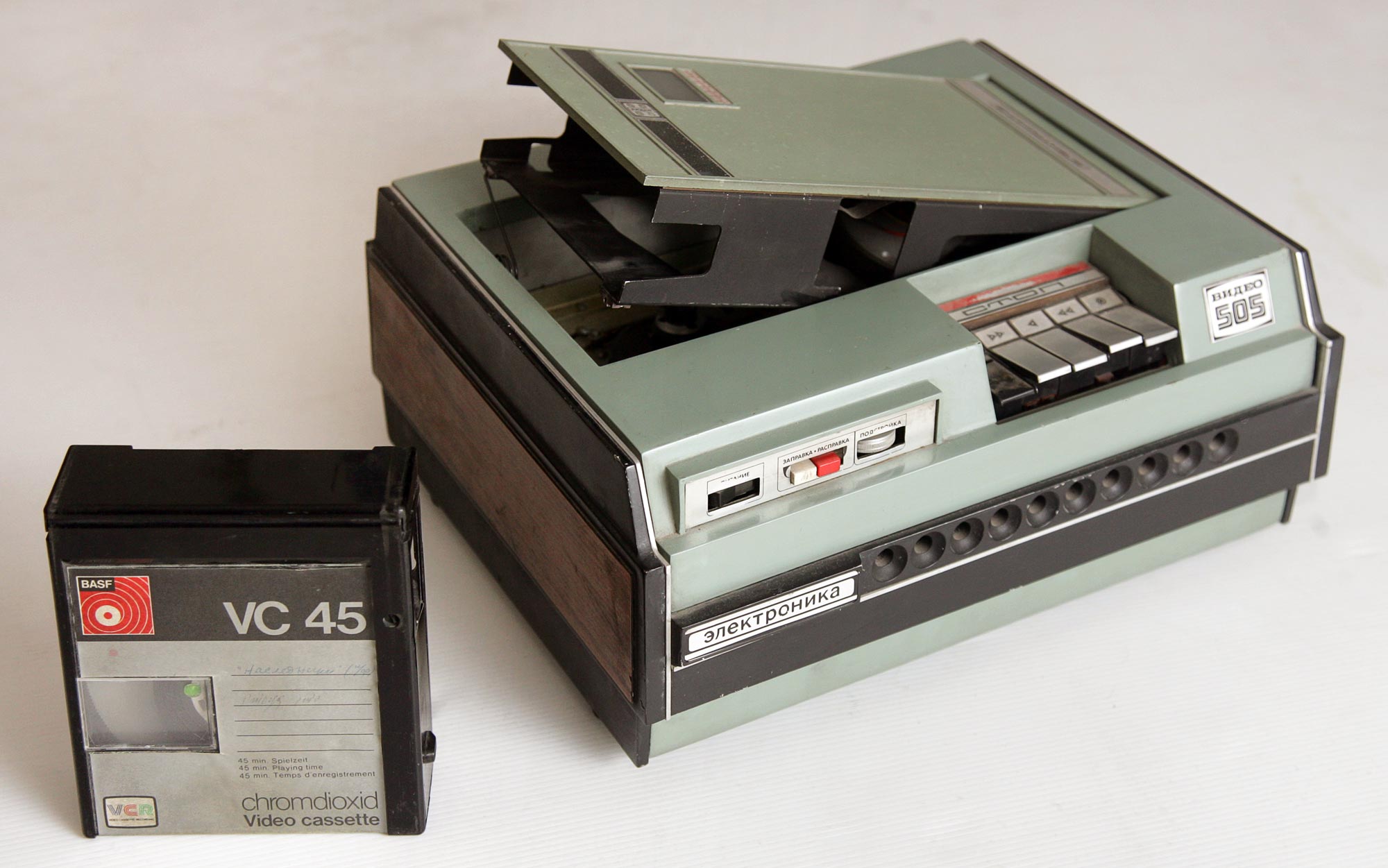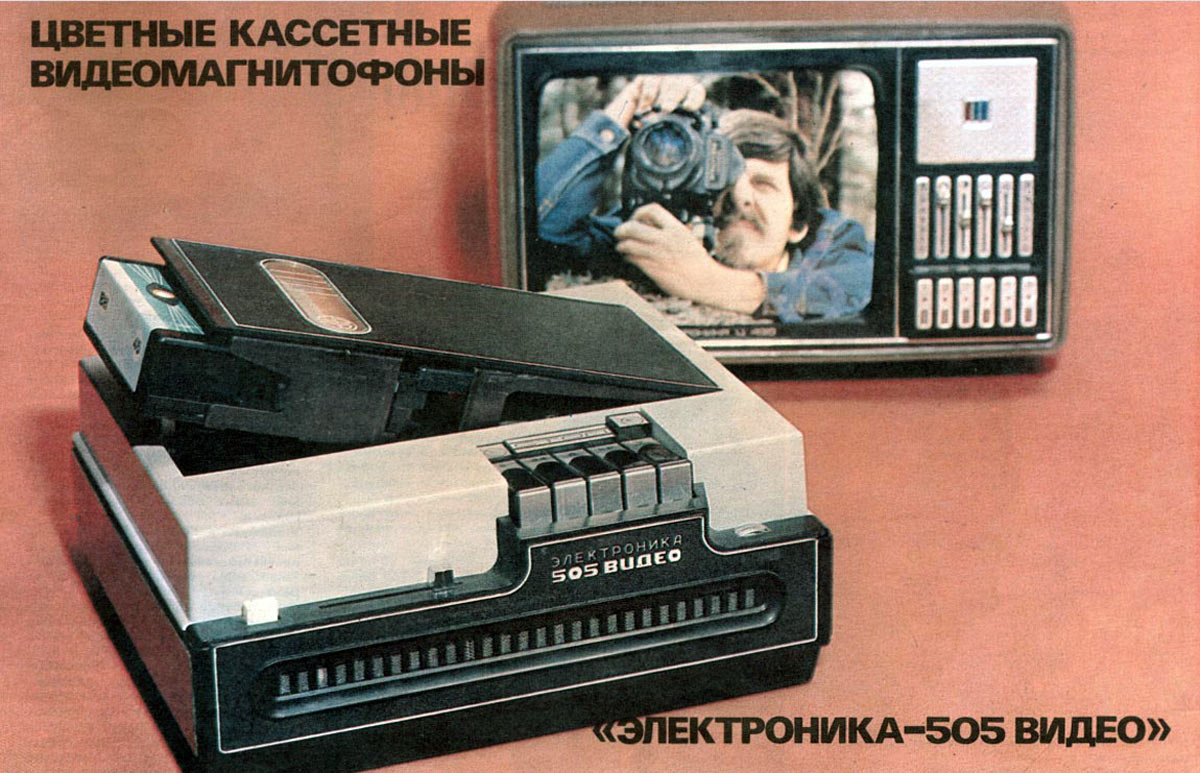 Кассетный видеомагнитофон *Электроника-505-видео* с 1974 года опытно выпускало Воронежское НПО *Электроника*. Он представляет собой транзисторно-интегральный цветной кассетный видеомагнитофон стандарта VCR, с наклонно-строчным способом записи 2-мя видеоголовками. Видеомагнитофон предназначен для записи и воспроизведения цветных и ч/б видеосигналов, а также звукового сопровождения от телевизора с согласующим устройством типа УСЦТ-2. Кроме того, аппарат позволяет производить запись ч/б видеоинформации и звукового сопровождения от видеокамеры. Питается ВМ от сети переменного тока через внешний блок питания или от аккумуляторов. Скорость протяжки ленты 14,29 см/с. Разрешающая способность по горизонтали в канале яркости 250, цветности 200 линий. Отношение сигнал/помеха в канале изображения 40 дБ, звукового сопровождения 38 дБ. Диапазон частот канала звука 80...10000 Гц. Коэффициент детонации ± 0,3 %. Потребляемая мощность 30 Вт. Габариты модели - 318x269x132 мм, блока питания - 119x247x90 мм. Масса модели - 10 кг, блока питания - 3 кг. Цена аппарата - 2500 рублей. Разработка и первые выпуски видеомагнитофонов имели оформление как на основном изображении, а немного позднее уже привычное всем оформление. Предположительно в 1977 году документация по видеомагнитофону была передана Раменскому приборостроительному заводу, на котором с 1979 года видеомагнитофон выпускался под наименованием *Сатурн-505-видео*.