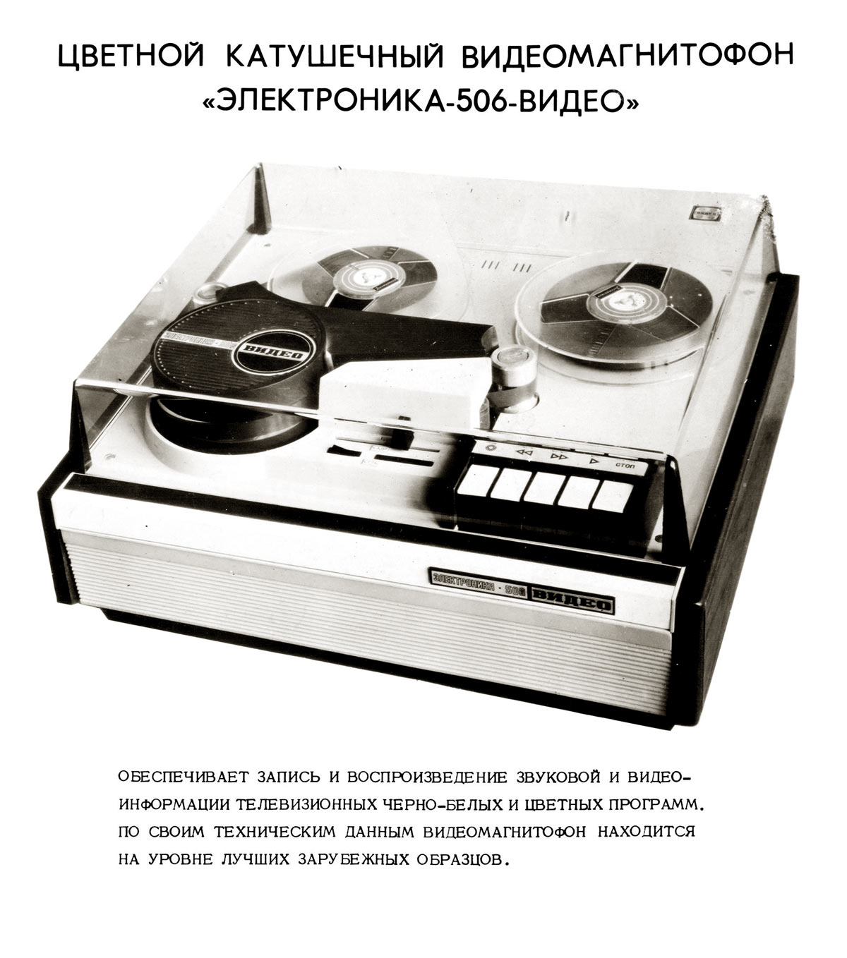 Цветной катушечный видеомагнитофон *Электроника-506-Видео* разработан в 1976 году Воронежским ПТО *Электроника*. ВМ разработан на основе ч/б ВМ *Электроники-502-Видео*, при этом уже может записывать цветное изображение по системе *СЕКАМ*. Видеомагнитофон **Электроника-506-видео** обеспечивает: запись звуковой и видеоинформации с телевизора и видеокамеры, а так же воспроизведение этой информации на телевизоре, прослушивание звукового сопровождения на головные телефоны, стирание записей и ускоренную перемотку ленты в любом направлении. Питание от сети переменного тока 127 или 220 вольт. Потребляемая мощность 100 Вт. Система видеозаписи наклонно-строчная, двумя вращающимися видеоголовками, ЧМ-сигнал. Время записи 45 минут, перемотки ~ 5 минут. Скорость движения ленты 16,32 см/сек. Разрешающая способность 220 линий. Диапазон частот звука 100...10000 Гц. Габариты ВМ- 420х340х195 мм. Вес 15 кг.