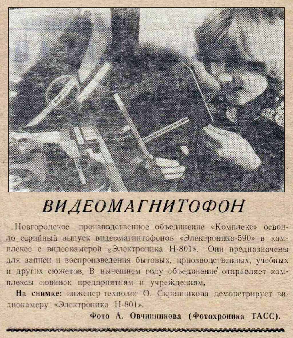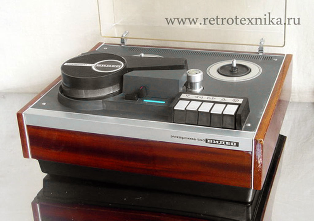 Катушечный видеомагнитофон *Электроника-590-видео* с середины 1978 года выпускал Новгородский завод *Спектр*. Видеомагнитофон предназначен для записи чёрно-белой видеоинформации и звукового сопровождения на специальную магнитную ленту, с последующим воспроизведением. Видеомагнитофон обеспечивает запись звуковой и видеоинформации с телевизора и видеокамеры; запись звука с микрофона или другого источника; воспроизведение записи на телевизоре; прослушивание звукового сопровождения на головные телефоны; стирание ранее уже записанной информации, перемотку магнитной ленты в любом направлении. Электропитание аппарата осуществляется от сети переменного тока напряжением - 220 В ± 10%. Потребляемая мощность не более 90 Вт. Параметры телевизионного изображения - 625 строк, 50 полей. Способ записи изображения наклонно-строчный двумя вращающимися видеоголовками, ЧМ сигнал. Носитель информации хромдиоксидная магнитная лента или ее аналог. Ширина магнитной ленты 12,7 мм. Время записи или воспроизведения не менее 45 минут, при длине ленты около 450 метров. Время ускоренной перемотки не более 5 минут. Скорость движения ленты - 16,32 см/с. Разрешающая способность - 250 линий. Отношение видеосигнал-шум 40 дБ. Диапазон рабочих звуковых частот 100...10000 Гц. Относительный уровень помех звукового канала 33 дБ. Габариты модели - 422x367x198 мм. Масса 15 кг. Рабочее расположение видеомагнитофона *Электроника-590-видео* только горизонтальное.