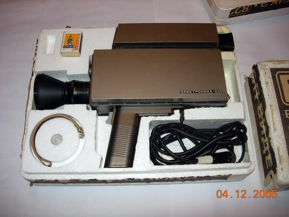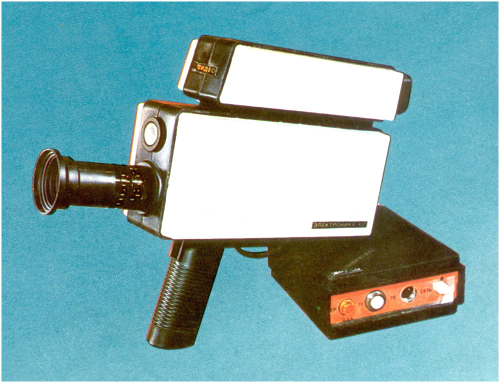 Бытовая видеокамера *Электроника-821* выпускалась с 1985 года. Видеокамера *Электроника-821* формирует сигналы ч/б телевизионного изображения и звукового сопровождения для записи их на бытовые видеомагнитофоны с контролем качества изображения на встроенном видоискателе. Для записи звуковых сигналов используется электретный микрофон, встроенный в лицевую панель камеры. Технические характеристики: Передающая трубка типа видикон ЛИ437-1. Стандарт разложения изображения чересстрочный: строк 625, полей 50. Размах выходного полного ТВ сигнала (нагрузка 75 Ом) 7 В. Разрешающая способность по горизонтали в центре 400 линий, в углах 300 линий. Диапазон освещенности при бесподстроечной работе 50...5000 лк. Напряжение источника питания постоянного тока 12 В. Диапазон частот канала звукового сопровождения - 100...10000 Гц. Потребляемая мощность от источника питания 8 Вт. Габаритные размеры видеокамеры (без объектива) - 294x83x286 мм. Масса 2,1 кг. Цена 870 рублей. С 1986 года выпускалась усовершенствованная видеокамера *Электроника-822* по конструкции и техническим параметрам практически не отличающаяся от вышеописанной.