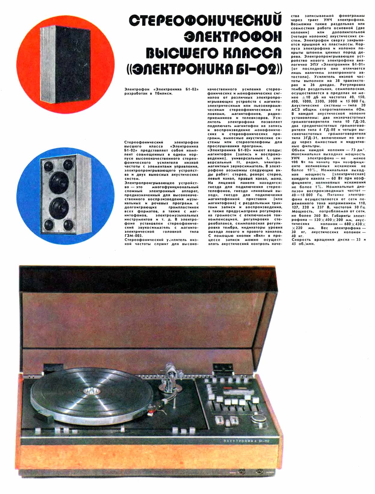 Электрофон *Электроника Б1-02* в 1976 году опытно выпустил Казанский завод радиокомпонентов. ЭФ разработан на базе электроакустической системы **Электроника-Б1-01** и состоит из размещенных в одном корпусе стереофонического усилителя, электропроигрывающего устройства и двух выносных АС. В отличие от ЭАС **Электроники-Б1-01**, в усилителе НЧ используется семиполосный темброблок с раздельной регулировкой тембра на частотах: 40, 150, 400, 1000, 2500, 5000 и 15000 Гц в диапазоне +10/-10 дБ. ЭПУ как и в базовом электрофоне, но имеет электронный автостоп. В электрофоне используются две выносные акустические системы 20АС-3, в каждой из которых установлены громкоговорители: 2 НЧ 10ГД-30, 2 СЧ 4ГД-8Е и 4 ВЧ 3ГД-31. Номинальная выходная мощность электрофона 2х60 Вт при КНИ - 1%. Диапазон воспроизводимых частот 40...18000 Гц. Коэффициент детонации ЭПУ 0,1%. Габариты ЭФ 620х405х200 мм, одной АС - 680х430х220 мм, масса соответственно 20 и 40 кг.