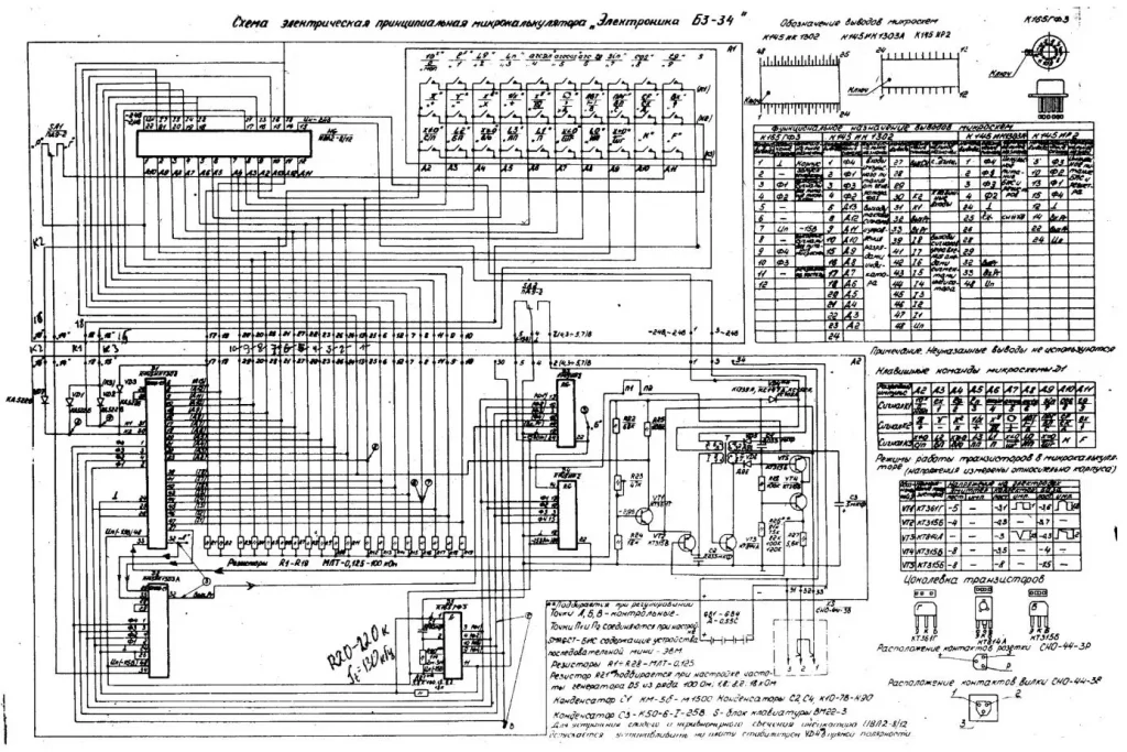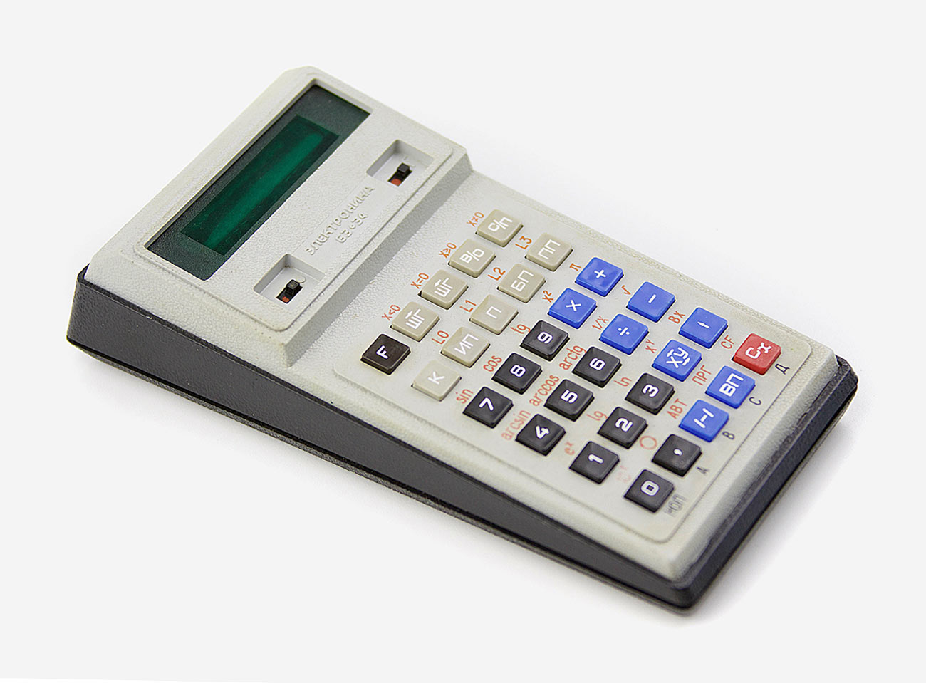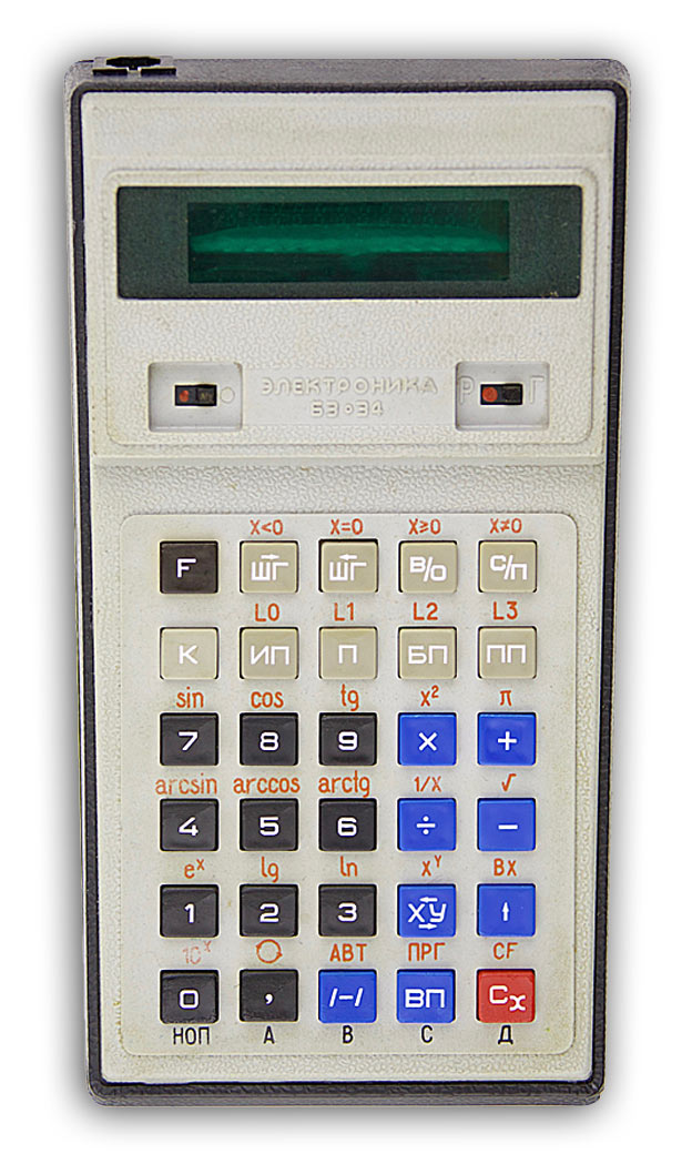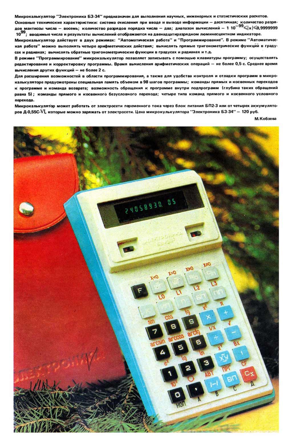 Микрокалькулятор *Электроника Б3-34* выпускался с 1980 года Светловодским заводом *Калькулятор* (Кировоградская область. Украина). *Электроника Б3-34* - программируемый микрокалькулятор с обратной записью для проведения инженерных и научных расчётов. Программируемый микрокалькулятор «Электроника Б3-34» относится ко второму поколению советских программируемых калькуляторов, предназначен для выполнения многократно повторяющихся сложных математических расчетов при решении широкого спектра задач. Выпускался в Украинской ССР на заводе «Калькулятор» в городе Светловодск Кировоградской области. В продаже появился в 1980 году по цене 85 рублей. Калькулятор быстро приобрёл необычайную популярность, благодаря ему программированием на микрокалькуляторах заинтересовались многие научно-популярные журналы того времени. Выпускались книги, посвященные как «серьезному» программированию на Б3-34, так и «развлекательному» — занимательные фокусы, применение калькулятора в быту и в школе, простейшие логические игры (предлагающие игрокам угадать число, «задуманное» калькулятором и т. д.). Демонстрационные стенды, выполненные в виде большого Б3-34, использовались на уроках программирования в школе. Микрокалькулятор позволяет выполнять вычисления тригонометрических функций, умеет работать в радианах или градусах (для этого предусмотрен отдельный переключатель). Память калькулятора составляет 14 регистров. Количество выполняемых автоматических операций — 51. Для составления и автоматизации процесса отладки программ в калькуляторе предусмотрены команды организации циклов, обращения к подпрограммам, пошаговый режим выполнения и просмотра программ с отображением кодов последних трех шагов на индикаторе. Для экономии места разработчики сильно упростили микрокод при обработке ошибок и различных нестандартных ситуаций, что породило множество недокументированных возможностей: например, если в моделях поздних выпусков переключатель «градусы-радианы» поставить в среднее положение, то калькулятор будет считать тригонометрические функции в градах.Множество прочих неожиданных и трудно предсказуемых недокументированных возможностей были объектами регулярных любительских исследований и публикаций в известных журналах; некоторые из них даже использовались в играх и прочих программах, например, в журнале «Наука и Жизнь» (№ 6, 1988 г.) описан эксперимент Н. Смирнова из Челябинска, который подключил к калькулятору Б3-34 внешний тактовый генератор с частотой 200 кГц вместо внутреннего с частотой 120 кГц, в результате чего быстродействие калькулятора увеличилось в 1,8 раза, при этом удвоилась и потребляемая мощность. Для отображения результатов работы программы используется 12-разрядный вакуумный катодолюминесцентный индикатор. Числа могут быть представлены как с естественной, так и с плавающей запятой. Автономное питание калькулятора осуществляется от четырех аккумуляторов типа Д-0,55с или от блока питания типа БП2-3. Время непрерывной работы без замены источников питания составляет от двух до четырех часов.Габаритные размеры модели: 185✕100✕46 мм.Вес калькулятора: 0,39 кг.