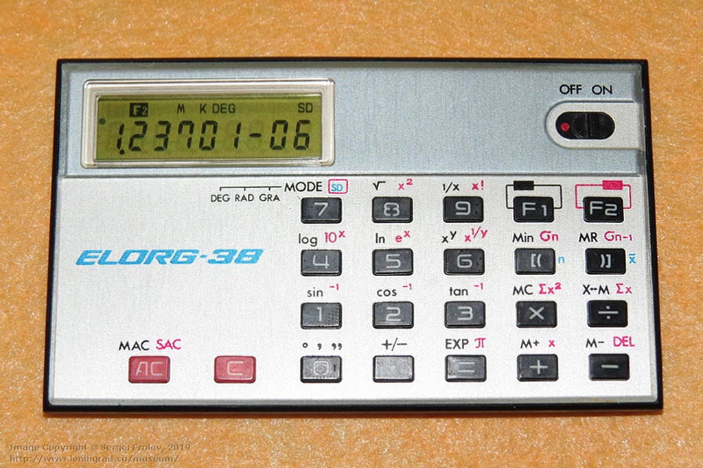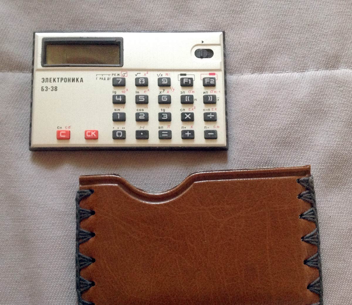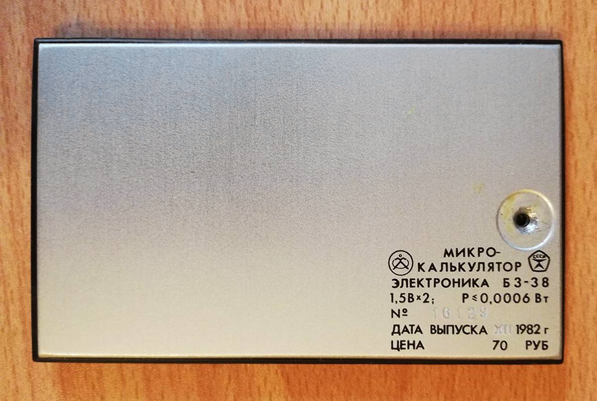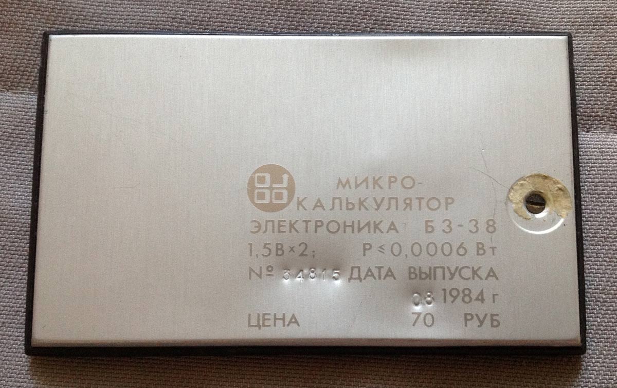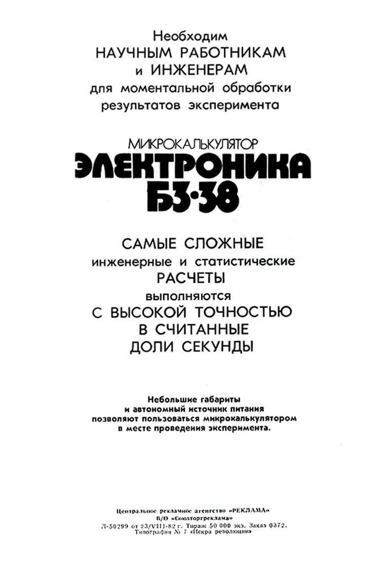 Микрокалькулятор *Электроника Б3-38* 8-разрядный инженерный микрокалькулятор. Питание: 2 элемента типа СЦ-32, выпускался с 1982 года несколькими предприятиями страны. Предназначен для выполнения инженерных и научно-технических расчетов. Калькулятор "Электроника Б3-38", является сверхминиатюрным (91х55х5,5 мм) и одним из самых точных отечественных микрокалькуляторов для выполнения сложных математических расчетов, в том числе широкого спектра элементарных специализированных функций для статистических расчетов. Рекомендован для использования учащимися старших классов и учителями средней школы.Позволяет выполнять: четыре арифметических действия;цепные повторяющиеся операции;изменение знака числа;действия с константой;вычисления с применением скобок;вычисления степенных, показательных, логарифмических, тригонометрических функций (прямых и обратных);представление аргумента в радианах, градусах, градах;преобразование градусов, минут и секунд в доли градуса;вычисления статистических функций;вычисление n!;вызов числа ?;работу с регистром памяти: запись, сложение, вычитание. Характерной особенностью калькулятора является наличие двух клавиш совмещенной функции (F1 и F2), что позволяет использовать клавиши для выполнения трех операций.Формат представления чисел – с естественной и плавающей запятой. Диапазон представления чисел с плавающей запятой +- 1*10-99 до 9,99*10+99.Разрядность чисел 6+2. Тип индикатора – жидкокристаллический. Разрядность числа - 8. Тип индикатора - жидкокристаллический. Питание - 2 элемента СЦ-30. Габариты МК - 55 x 91 x 5,5 мм. Масса 50 гр. Экспортный вариант МК именовался как *Elorg-38*.