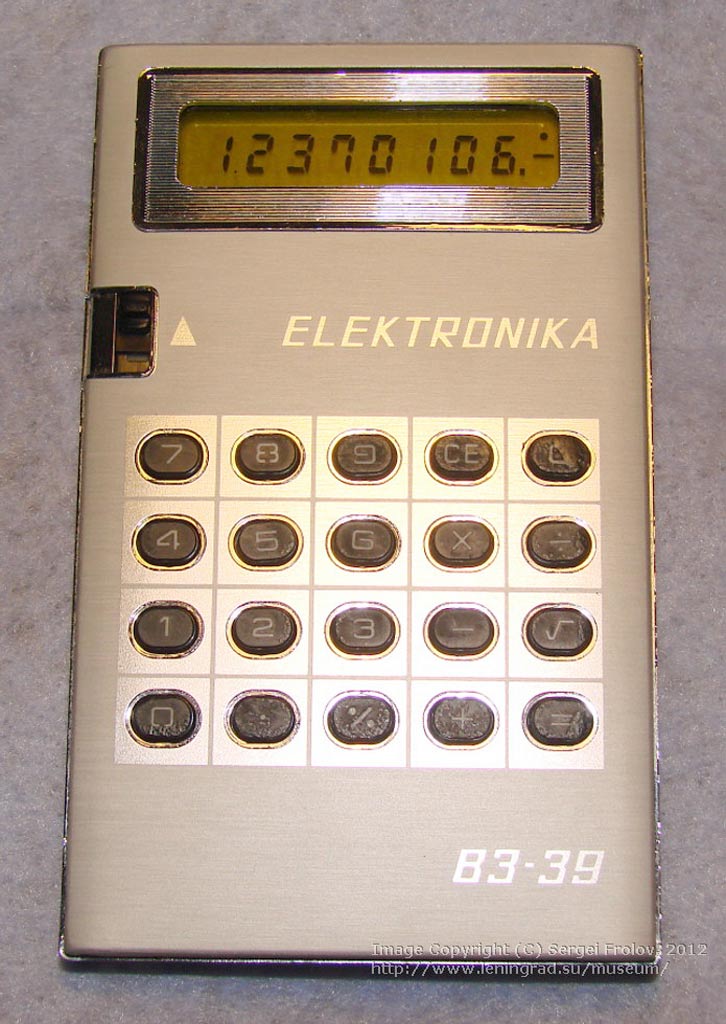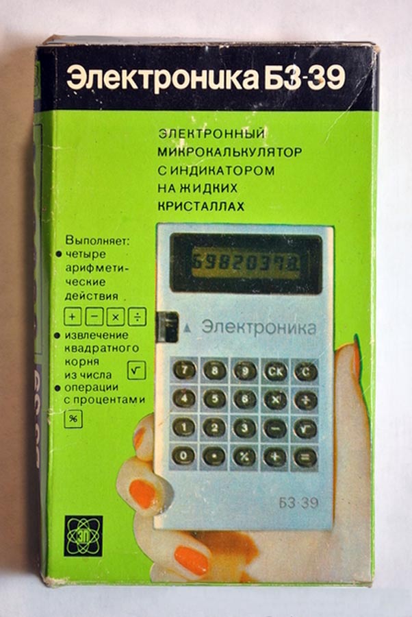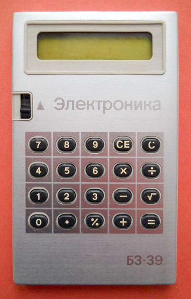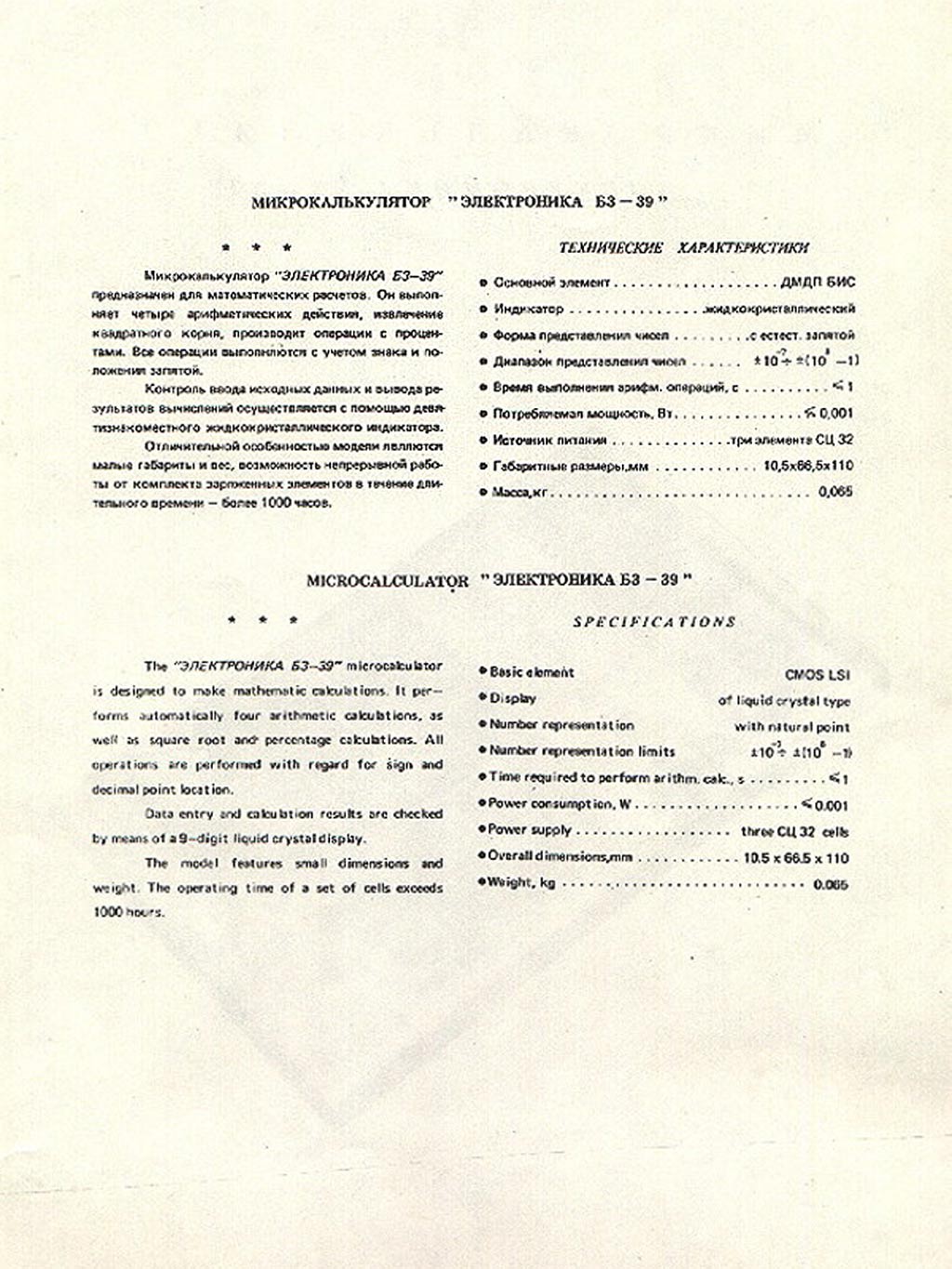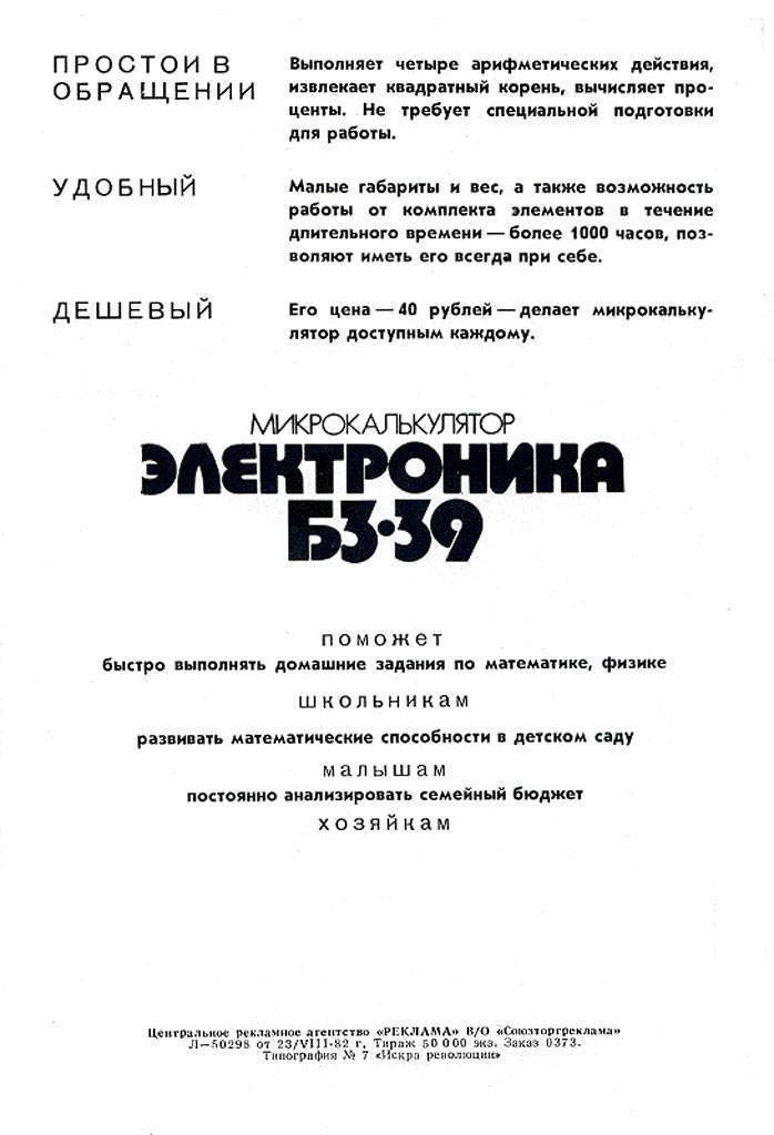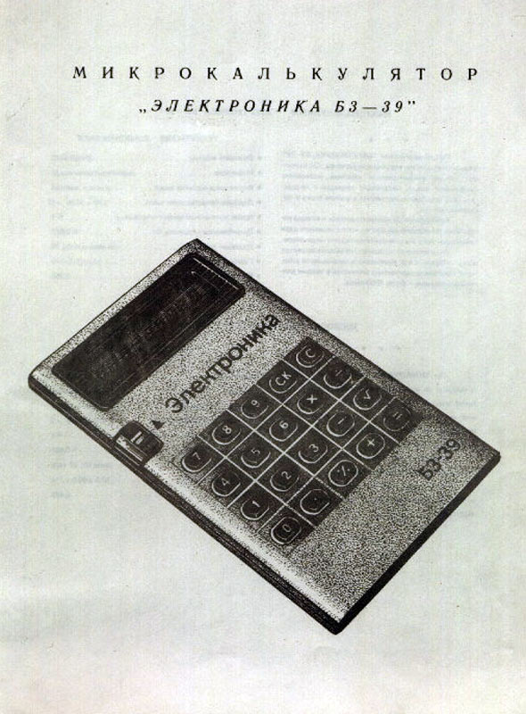 Микрокалькулятор *Электроника Б3-39* выпускался с 1979 году на Зеленоградском заводе *Ангстрем*. Микрокалькулятор "Электроника БЗ-39" является усовершенствованной моделью микрокалькулятора "Электроника БЗ-30", служит для проведения простых расчетов, а также рекомендован для использования учащимися начальных классов средних школ и профессионально-технических училищ. В калькуляторе использовали новую низкопороговую схему, за счет которой потребляемая мощность резко уменьшилась и составила всего один милливатт. Калькулятор служит для проведения простых расчетов, имеет отдельную клавишу для извлечения квадратного корня. Рекомендован для использования учащимися начальных классов средних школ и профессионально-технических училищ. В калькуляторе используется восьмиразрядный жидкокристаллический индикатор. Питание микрокалькулятора осуществляется от трех элементов типа СЦ-32. Форма представления чисел — естественная. Диапазон представляемых чисел ±107 +(108—1). Тип индикатора — жидкокристаллический. Время непрерывной работы от одного комплекта источника питания составляет 800 ч. Габаритные размеры модели 110х66,5х10,5 мм. Масса МК - 65 грамм. Цена 40/45 руб.