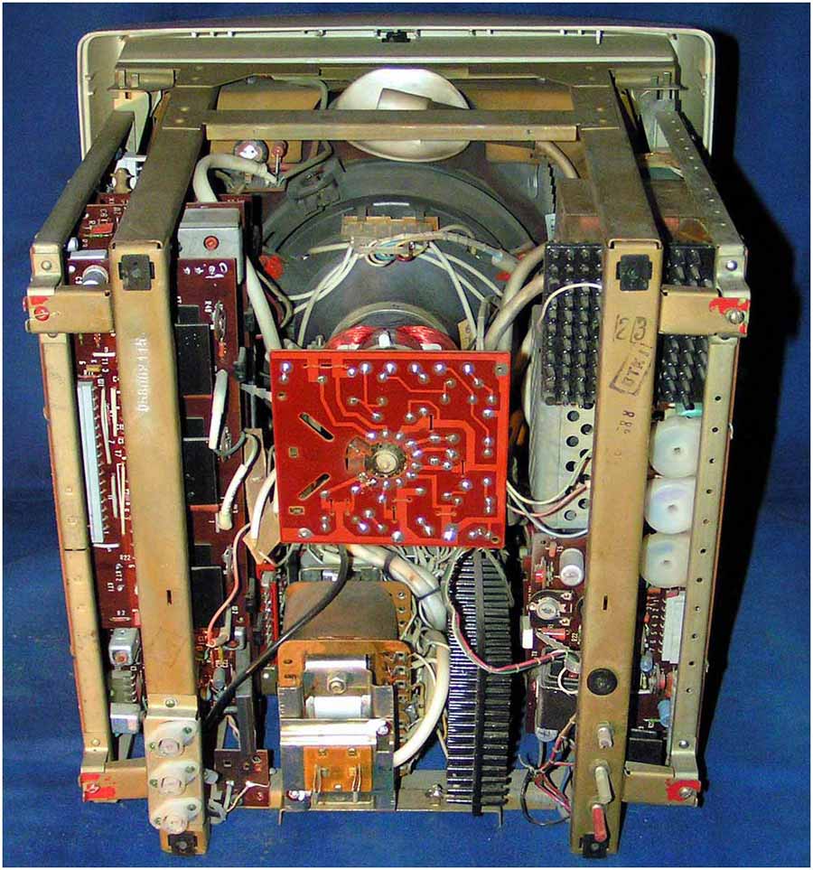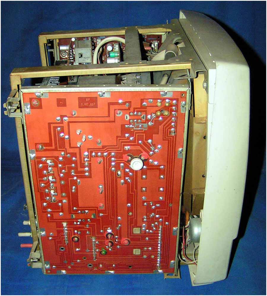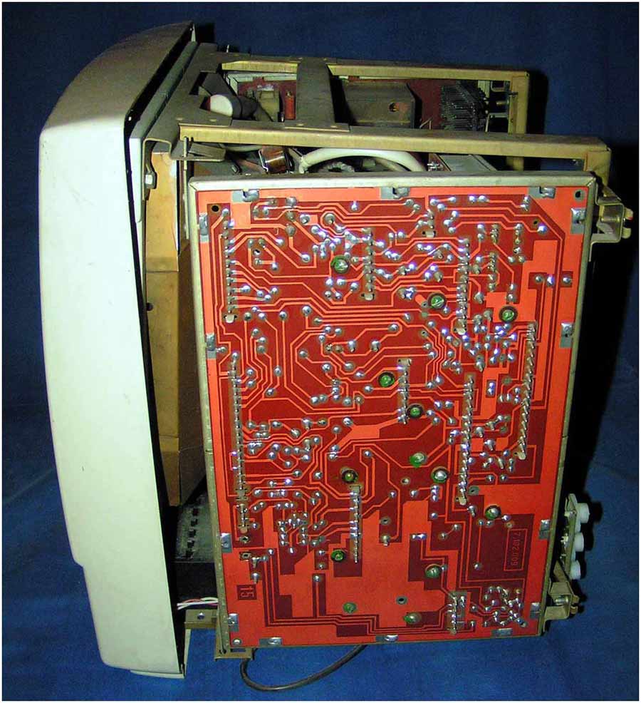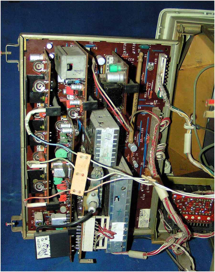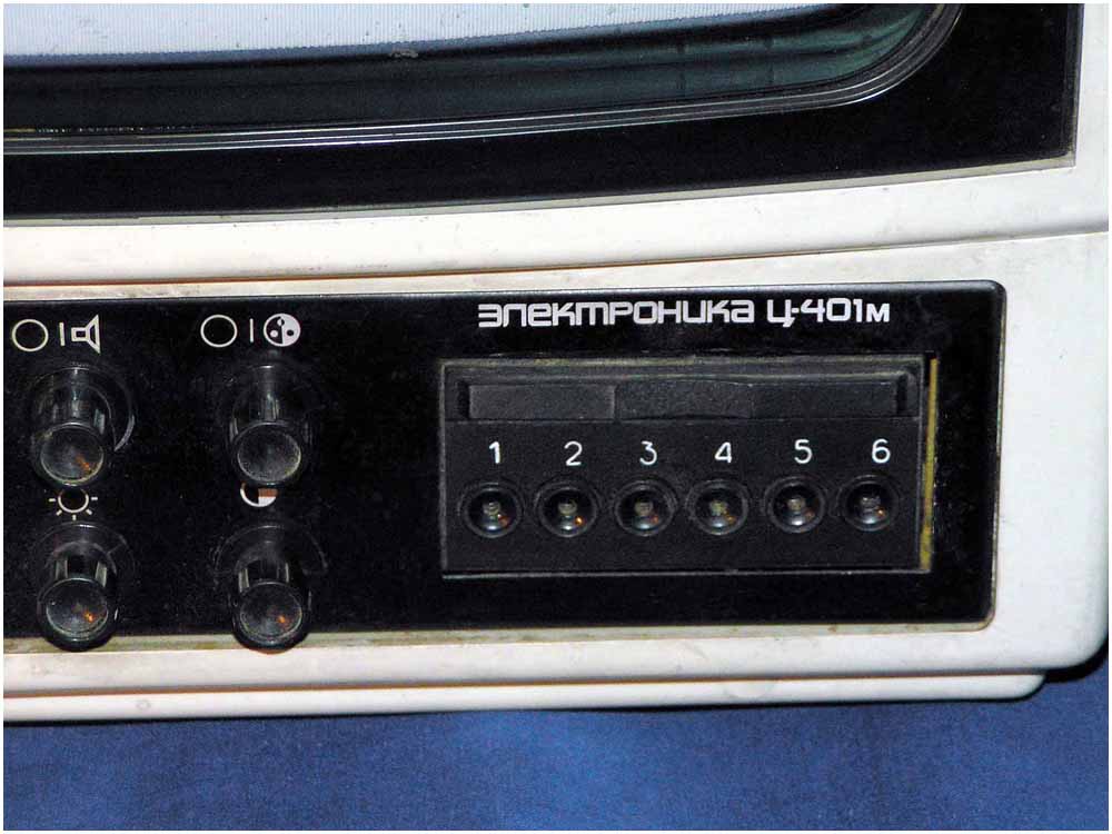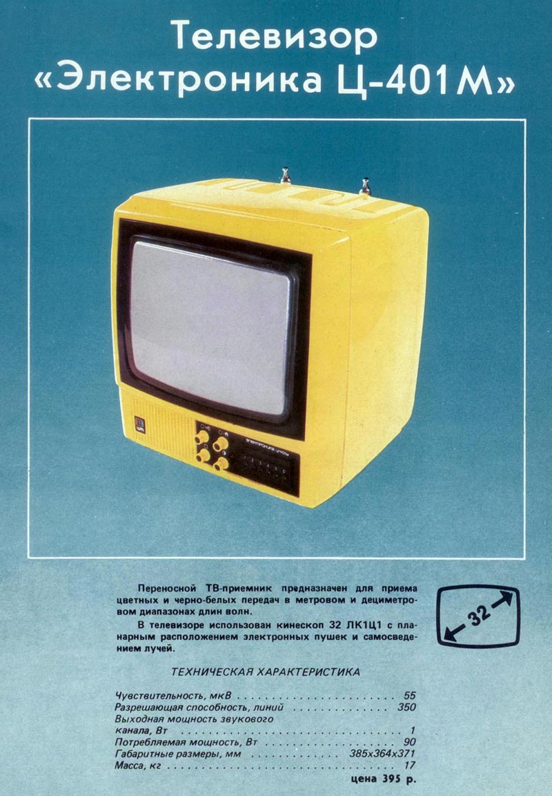 Телевизионный приёмник цветного изображения *Электроника Ц-401М* с I-кв 1984 года выпускал Московский электроламповый завод (МЭЛЗ). Модель **Электроника Ц-401М** - это переносной полупроводниковый телевизионный приёмник, выполненный с применением интегральных схем, выпускался в настольном оформлении с различными цветовыми вариантами отделки корпуса и передней панели. Для переноса в корпусе телевизора предусмотрена ручка. В модели примёнен кинескоп 32ЛК1Ц-1, с размером диагонали 32 см и углом отклонения электронного луча 90°. Телевизор обеспечивает приём телепередач цветного и ч/б изображения на любом из 12 каналов; прослушивание звукового сопровождения на головные телефоны с отключенной АС. В ТВ имеется АПЧГ, что обеспечивает переключение программ без регулировки. АРУ обеспечивает устойчивый сигнал. Влияние помех минимально благодаря АПЧ и Ф. Размер изображения - 182x244 мм. Чувствительность, ограниченная синхронизацией в МВ диапазоне - 55 мкВ, в ДМВ - 90 мкВ. Разрешающая способность: по горизонтали 300, по вертикали 350 линий. Номинальная выходная мощность канала звукового сопровождения 0,5 Вт. Диапазон воспроизводимых частот по звуковому давлению 250...7100 Гц. Телевизор питается от сети переменного тока напряжением 220 В. Колебания напряжения сети не должны превышать +5 -10% от номинального. Потребляемая мощность 95 Вт. Габариты телевизора 385x364x371 мм. Масса 17 кг.