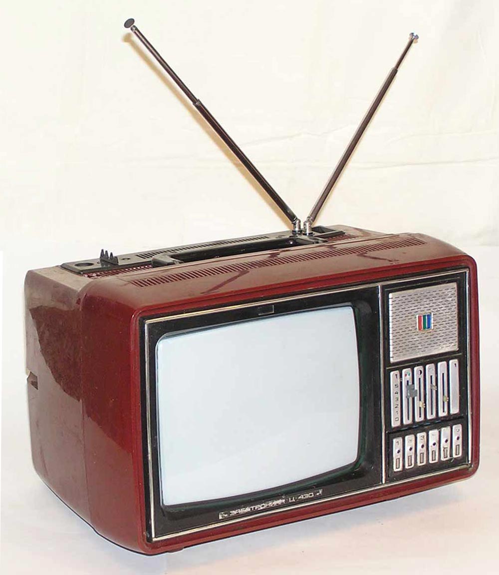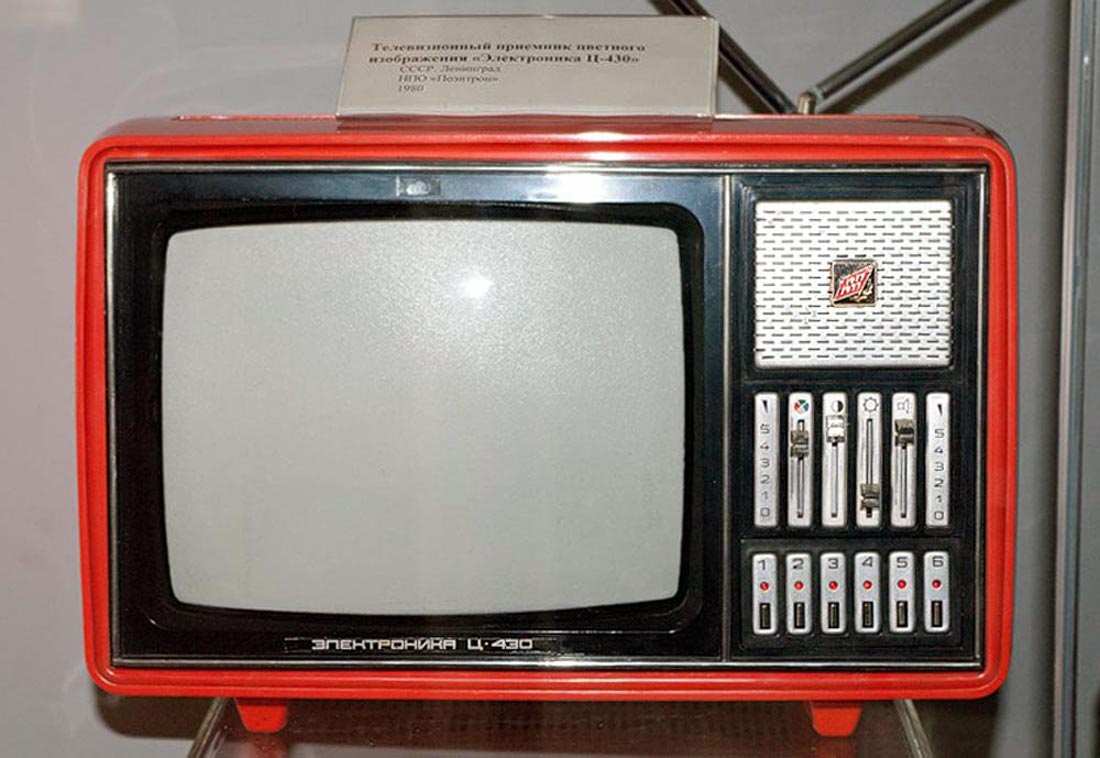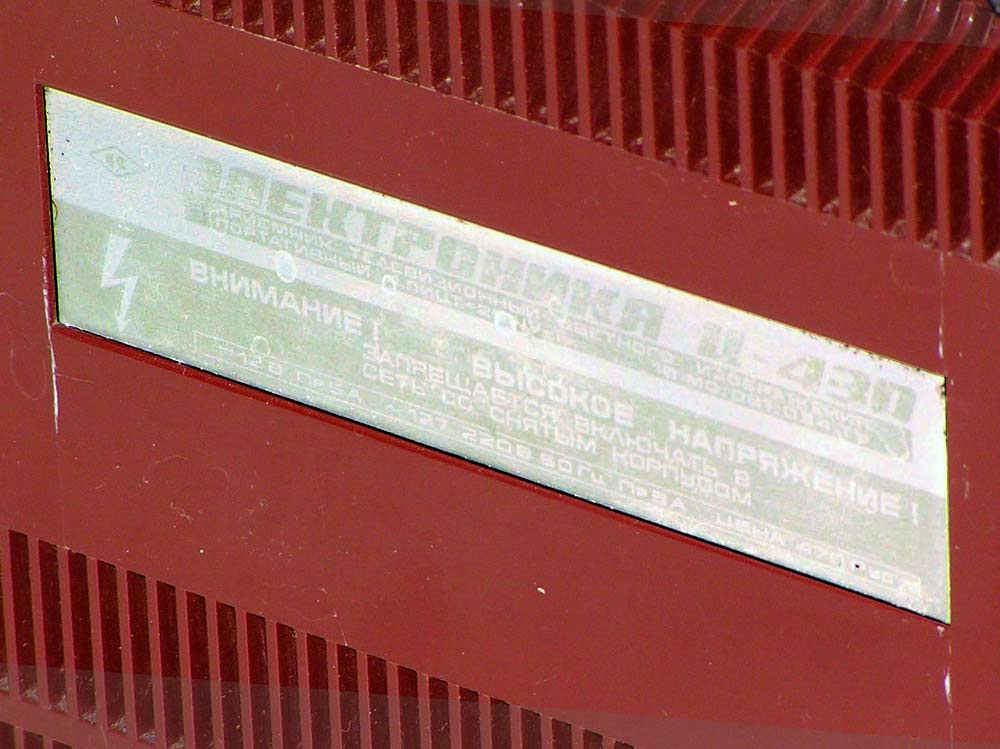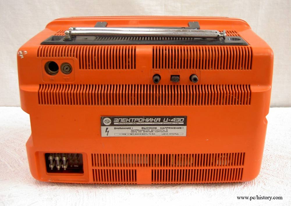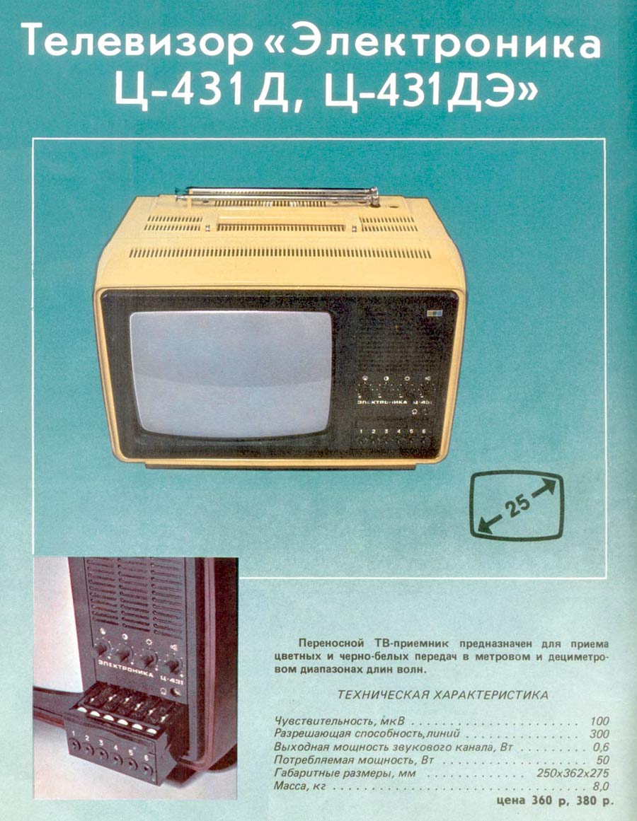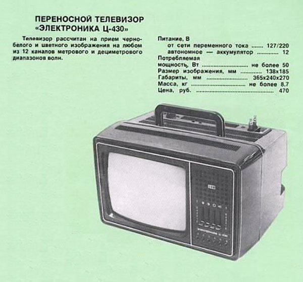 Телевизионный приёмник цветного изображения *Электроника Ц-430/Д* с 1977 года выпускали конденсаторный завод *Мезон* и НПО *Позитрон* в Ленинграде. Переносной телевизор цветного изображения **Электроника Ц-430/Д** предназначен для приёма программ на любом из 12 каналов в МВ диапазоне, а модель с индексом **Д** и на любом из каналов ДМВ диапазона. ТВ выпускались в корпусе из ударопрочного полистирола с разными вариантами оформления. В телевизоре применен кинескоп 25ЛК2Ц. Питание от сети переменного тока с напряжением 176...243 В или от источника постоянного тока напряжением 11...14,5 В. Есть возможность прослушивания звукового сопровождения на головные телефоны с отключенной АС, записи или воспроизведения изображения бытовыми отечественными видеомагнитофонами. В модели имеется системы АПЧГ, АРУ, АПЧ и Ф. Схема предусматривает автоматическое размагничивание экрана и маски кинескопа при включении. В блоке питания применена электронная схема защиты, автоматически отключающая телевизор от сети при возникновении перегрузок и включающая, при их прекращении. Чувствительность в диапазоне МВ 55 мкВ, ДМВ 200 мкВ. Разрешающая способность 250 линий. Максимальная выходная мощность 0,6 Вт. Диапазон воспроизводимых частот канала звукового сопровождения 315...6300 Гц. Потребляемая от сети мощность 50 Вт. Габариты телевизора - 362х245х275 мм. Его масса 8,7 кг. С 1980 года НПО *Позитрон* выпускал телевизор *Электроника Ц-431/Д* по схеме и конструкции аналогичный описанному, но отличающийся другим оформлением.