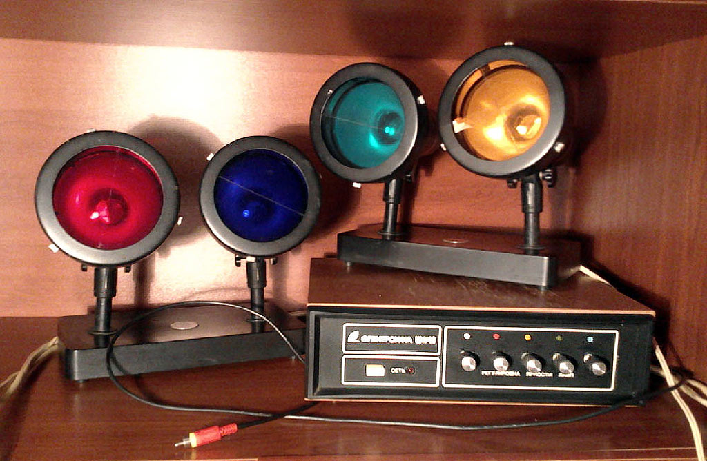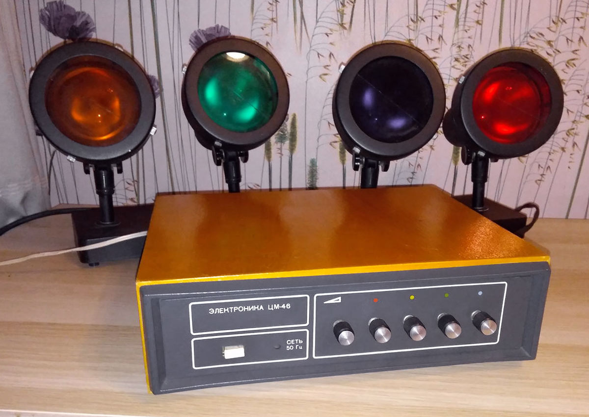 Устройство цветового сопровождения музыки *Электроника ЦМ-46* выпускало с 1984 года Саратовское ПО *Радуга*. Количество каналов 4. Мощность лампы на канал не более 100 Вт. Габариты блока управления - 253х314х100 мм. Габариты одного светильника - 300х232х235 мм. Масса установки 10 кг.