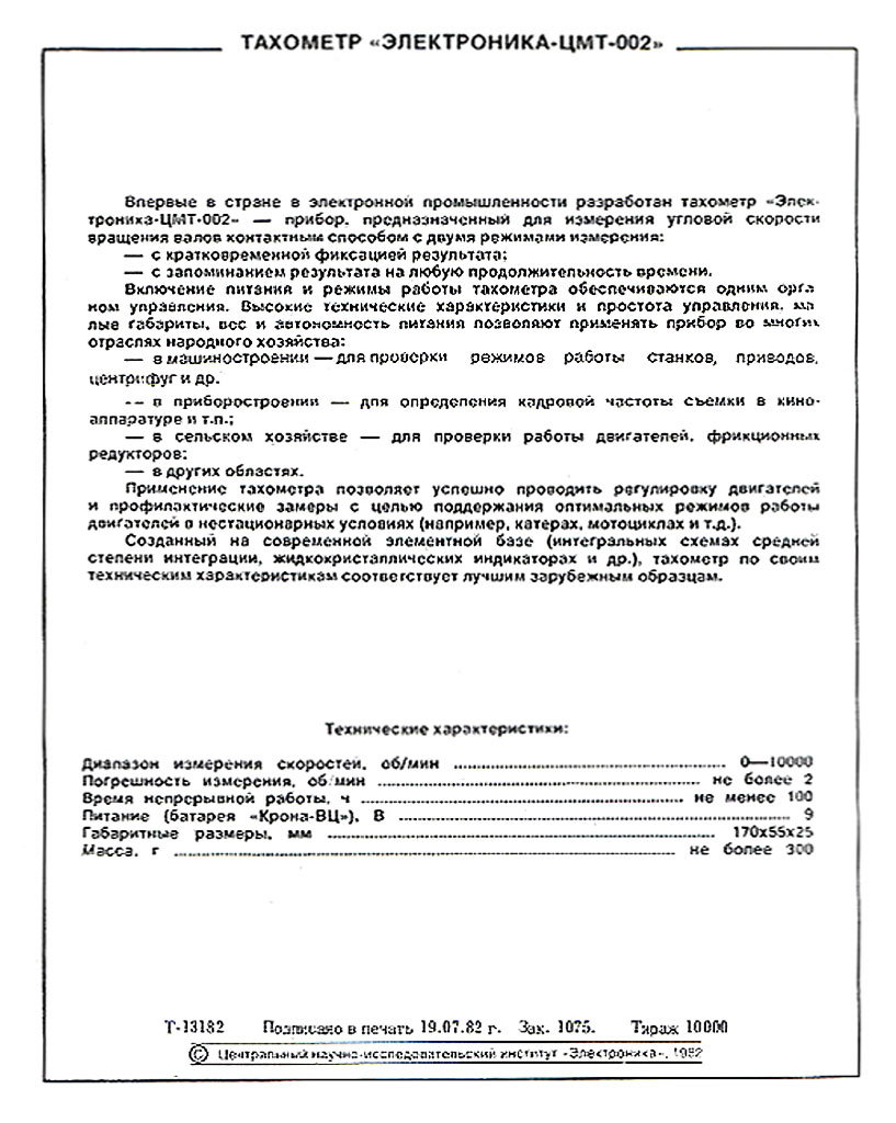 -Автомобильный тахометр *Электроника ЦМТ-002* выпускался с 1982 года ЦНИИ *Электроника*.