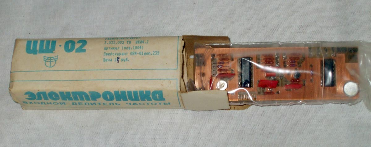 Радиоконструктор *Электроника ЦШ-02* (Входной делитель частоты) с 1990 года выпускал Ульяновский радиоламповый завод. РК *ЦШ-02* предназначен для изготовления узла делителя частоты входного высокочастотного сигнала в цифровых шкалах, частотомерах или других радиолюбительских устройствах. Рекомендуется использовать конструктор для расширения возможностей цифровой шкалы частотомера **Электроника ЦШ-01**. Радиоконструктор обеспечивает следующие параметры: Коэффициент деления частоты 10. Диапазон входных частот 0,1...180 МГц. Амплитуда входного сигнала 1...5 В. Амплитуда выходного сигнала 1,2 В. Питание 5,15 В. Потребляемый ток около 0,15 А.