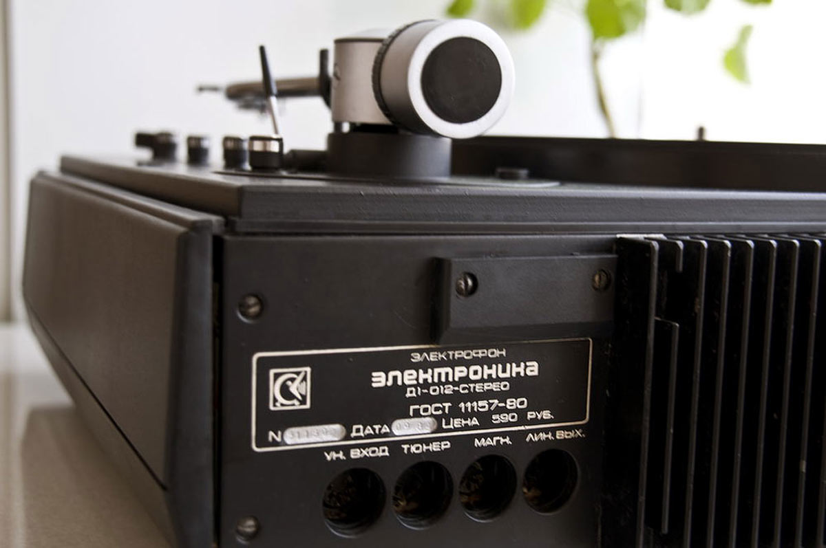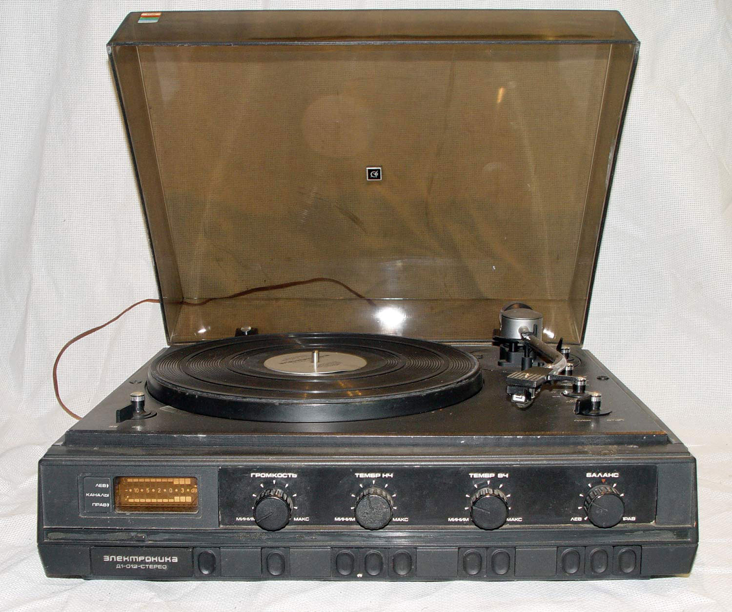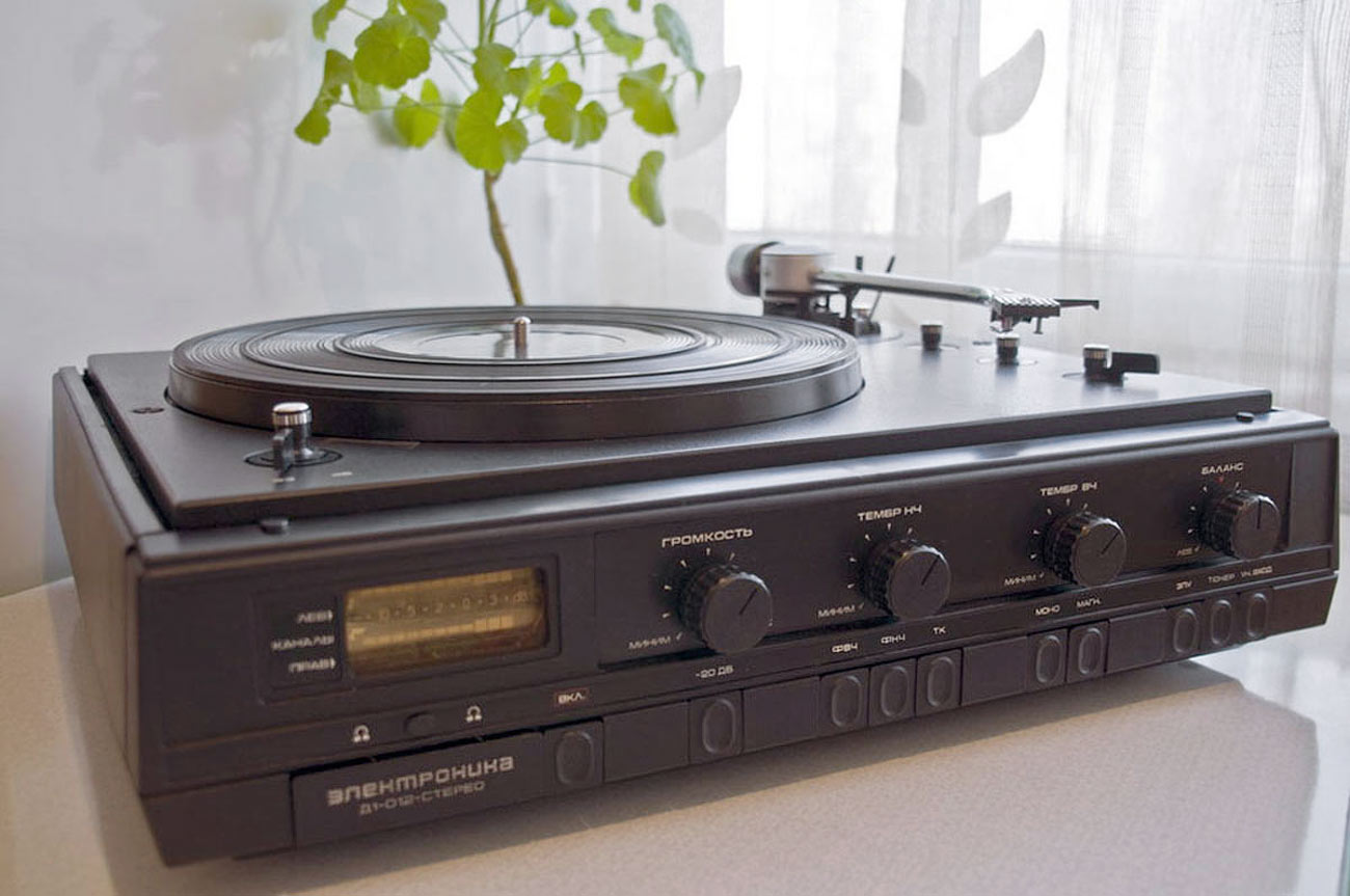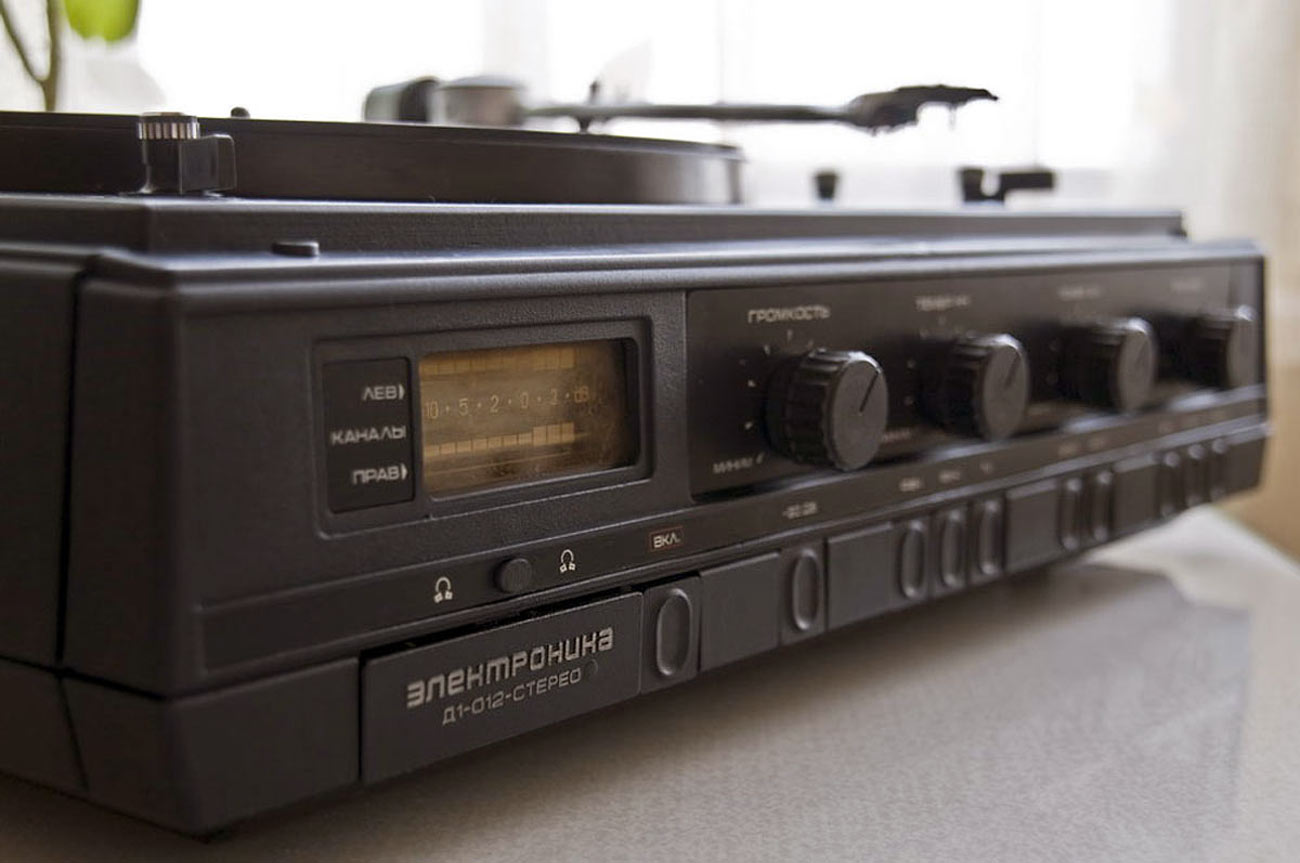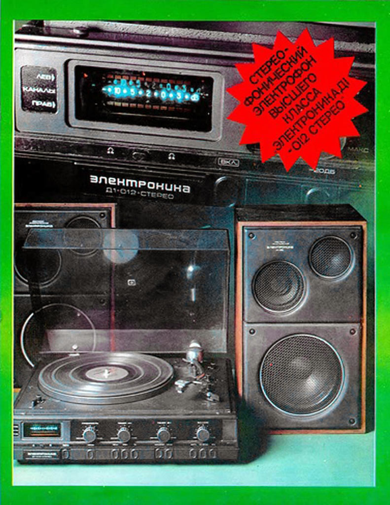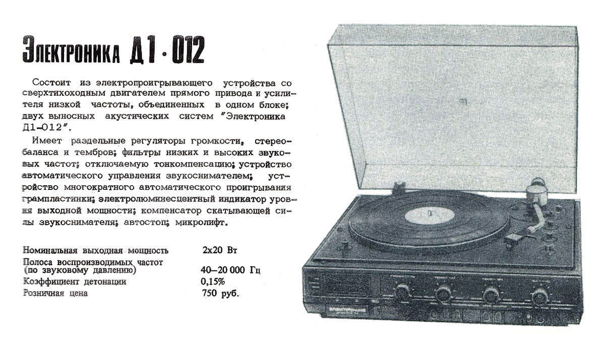 Электрофон сетевой транзисторный *Электроника Д1-012-стерео* с 1980 года выпускал Казанский завод радиокомпонентов. Электрофон высшего класса **Электроника-Д1-012-стерео** предназначен для воспроизведения моно или стерео пластинок, воспроизведения сигналов с магнитофона и тюнера. Электрофон собран на базе проигрывателя **Электроника Д1-011**. Он состоит из трёх блоков: электропроигрывателя с усилителем и 2-х АС 25AC-2. Электрофон имеет автоматическое и ручное управление, подстройку скорости; ручной микролифт, регулировку прижима звукоснимателя; регулируемый компенсатор скатывающей силы. Усилитель НЧ имеет плавную регулировку громкости и тембров; фиксированное уменьшение уровня громкости на 20 дБ; тонкомпенсацию; включение ФНЧ. Акустическое воспроизведение обеспечивается трёхполосными АС или стереотелефонами. Номинальная выходная мощность 2х20 Вт. Диапазон рабочих частот 20...20000 Гц. Коэффициент детонации 0,15%. Уровень фона -66 дБ. Потребляемая мощность 100 Вт. Размеры электрофона 490х425х190 мм. Вес 25 кг.