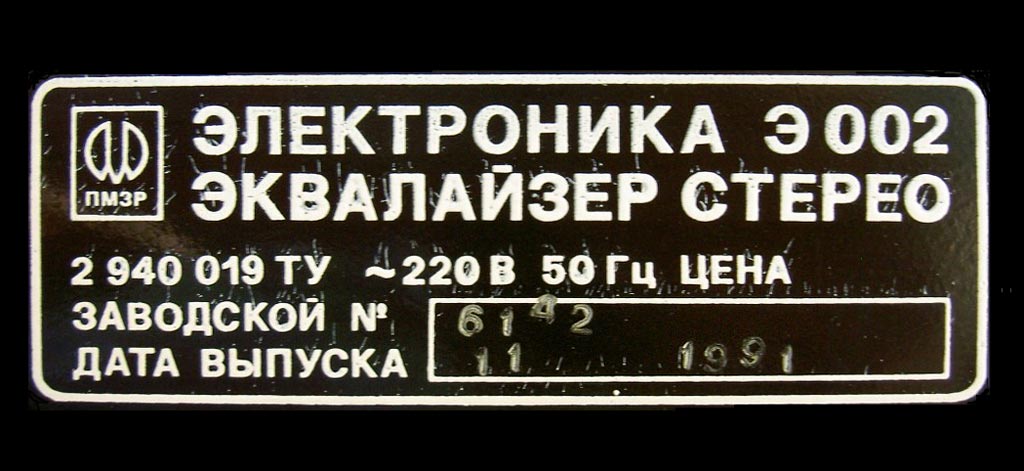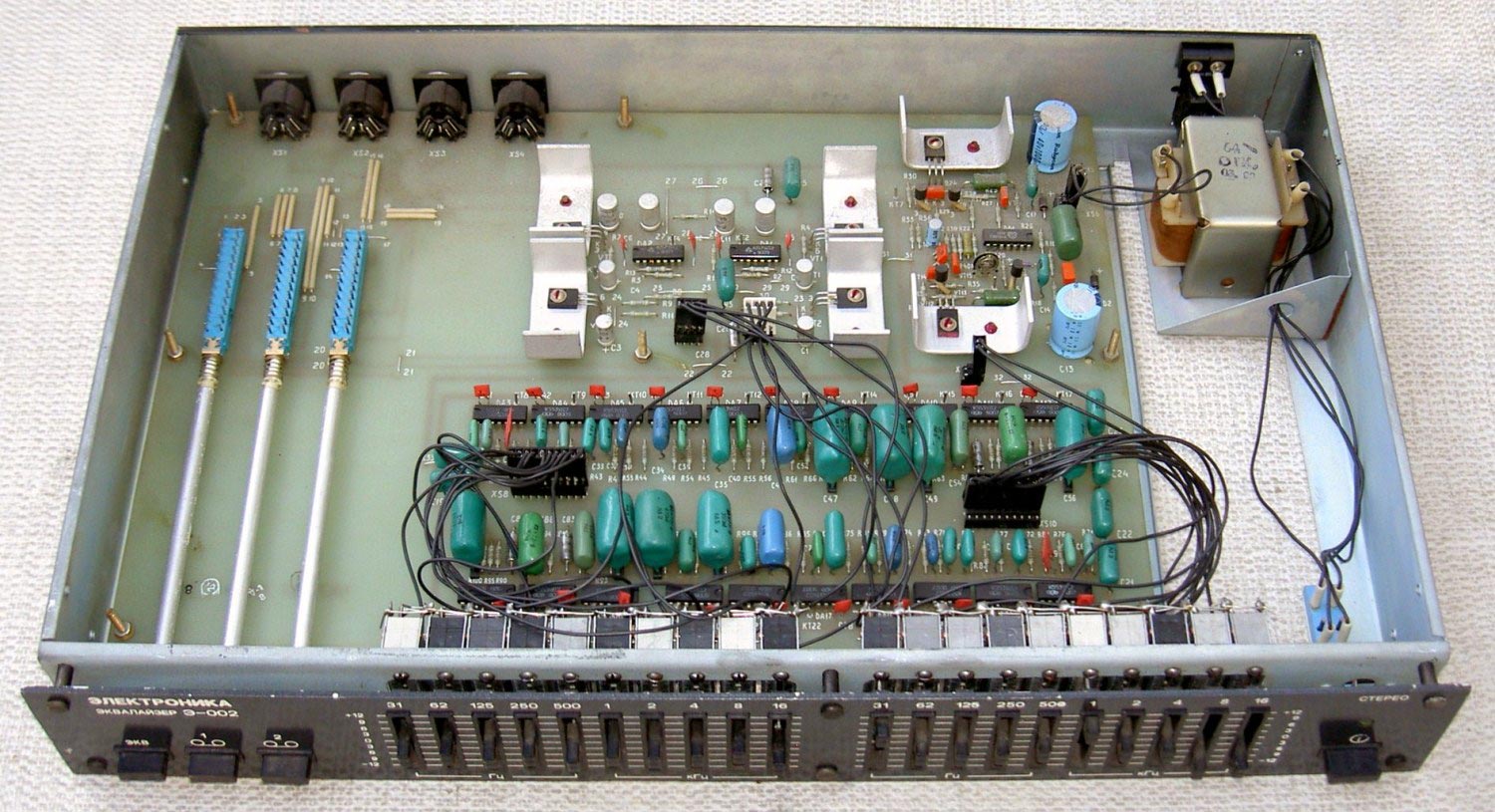 Стереофонический эквалайзер *Электроника Э-002-стерео* выцпускался с 1990 года Первым Московским заводом радиодеталей. Эквалайзер предназначен для оперативной коррекции АЧХ звуковоспроизводящих трактов бытовой звуковоспроизводящей аппаратуры. Диапазон рабочих частот 20...25000 Гц. Число полос регулирования 2х10. Потребляемая мощность 10 Вт. Габариты эквалайзера 430х295х67 мм. Его масса 5 кг.
