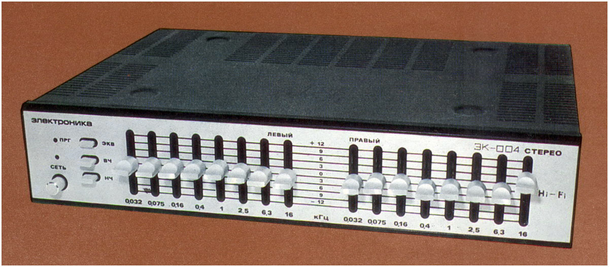 Графической эквалайзер *Электроника ЭК-004-стерео* выпускался с начала 1985 года. Графический эквалайзер *Электроника ЭК-004-стерео* позволяет корректировать нелинейность АЧХ электроакустического тракта звуковоспроизводящей радиоаппаратуры. Технические характеристики: Диапазон воспроизводимых частот 20...35000 Гц. Суммарный КНИ на частотах 40...16000 Гц - 0,02%. Отношение сигнал/шум 98 дБ. Количество регулируемых полос по каждому каналу 8. Диапазон регулировки АЧХ не менее ±72 дБ. Габаритные размеры эквалайзера 460x350х100 мм. Его масса не более 3,2 кг.