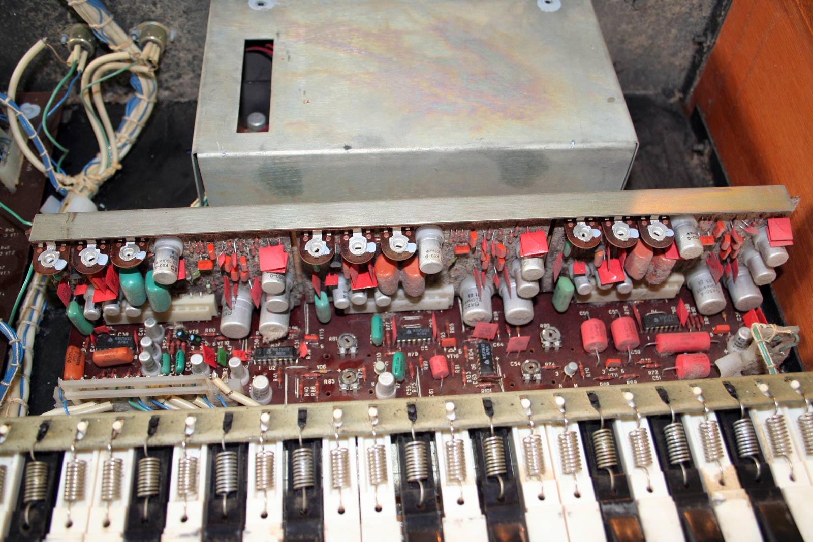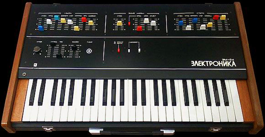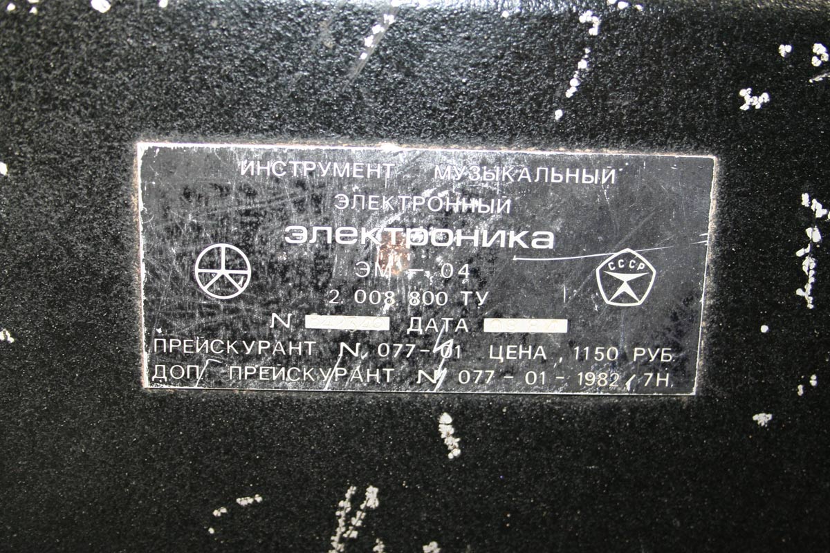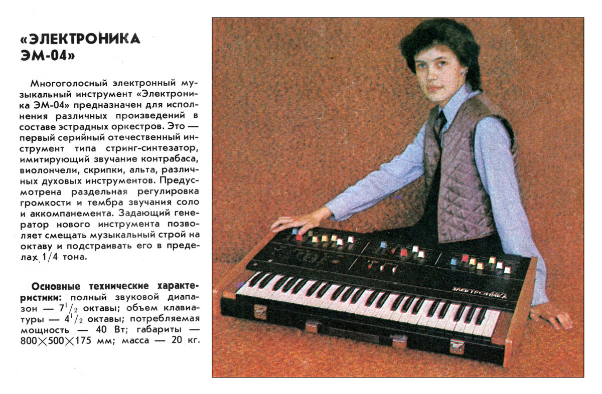 Многоголосный электронный музыкальный инструмент *Электроника ЭМ-04* выпускался возможно с 1986 года. Предназначен для исполнения произведений в составе ВИА и эстрадных оркестров. Это первый отечественный инструмент типа стринг-синтезатор, имитирующий звучание контрабаса, виолончели, скрипки, альта, духовых инструментов. Имеется регулировка громкости и тембра звучания соло и аккомпанемента. Задающий генератор инструмента позволяет смещать музыкальный строй на октаву и подстраивать его в пределах 1/4 тона. Полный звуковой диапазон 7-1/2 октавы; объём клавиатуры 4-1/2 октавы; количество хоров 10; количество перкуссионных регистров 7; количество синтезаторных регистров 7; уровень фона паузы -60 дБ. Потребляемая мощность 40 Вт. Габариты ЭМИ - 800х500х175 мм. Масса 23 кг. Цена ЭМИ - 1150 рублей.