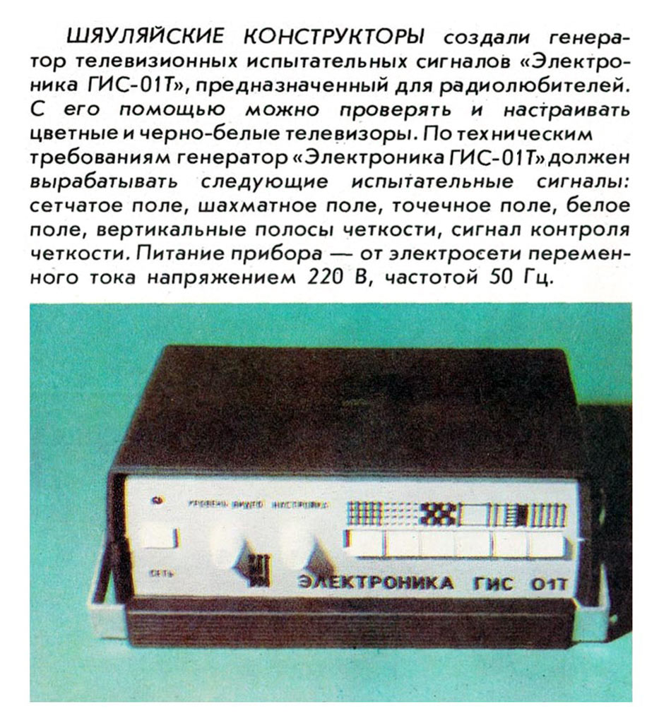 Генераторы телевизионных испытательных сигналов *Электроника ГИС-01Т*, *Электроника ГИС-01ТМ* и *Электроника ГИС-02Т* выпускались с 1984 года Шауляйским телевизионным заводом. Генераторы предназначены для настройки цветных и ч/б телевизионных приёмников при их ремонте и налаживании. Генератор *Электроника ГИС-01Т* отличается от генератора *Электроника ГИС-01ТМ* отсутствием разъёмов *ВЧ* и *Видео* на его передней панели, они находятся сзади и наличием регуляторов уровня сигнала и плавной настройка на 4-й или 5-й телевизионный канал, в модели *ТМ* каналы фиксированные. Впрочем в документации модели *ТМ* она часто именовалась как *Т*.