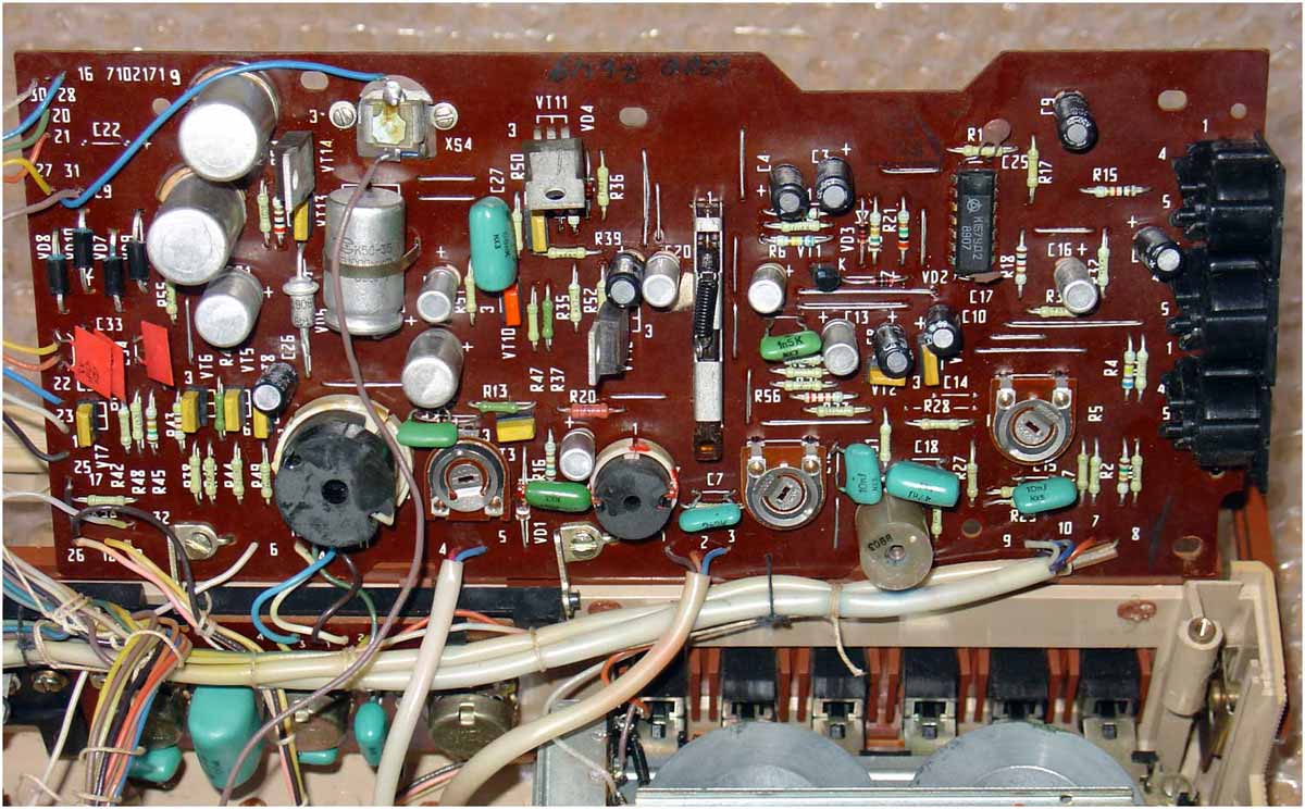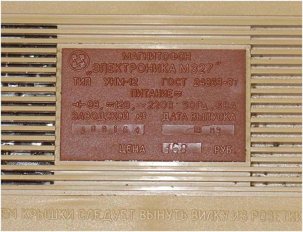 Магнитофон *Электроника М-327* с 1987 года выпускал Нововоронежский завод *Алиот*. **Электроника М-327** носимый двухдорожечный магнитофон третьей группы сложности с универсальным питанием. Он позволяет записывать речевые или музыкальные программы на магнитную ленту А4205-3Б и А4206-3Б, в кассетах типа МК-60 и МК-90 с последующим их воспроизведением. В аппарате имеется встроенный электретный микрофон, неотключаемая АРУЗ, автостоп, раздельная регулировка тембра по НЧ и ВЧ. Питание от сети, шести элементов А-343 или бортовой сети автомобиля напряжением 12 В. Скорость движения ленты 4,76 см/с. Коэффициент детонации 0,3 %. Диапазон рабочих частот на ЛВ - 40...10000 Гц. Номинальная выходная мощность 0,6 Вт, а максимальная 1,3 Вт. Относительный уровень шумов и помех -51 дБ. Потребляемая от сети мощность 6 Вт. Габариты магнитофона 330х157х88 мм. Вес 1,9 кг. Цена 168 рублей.
