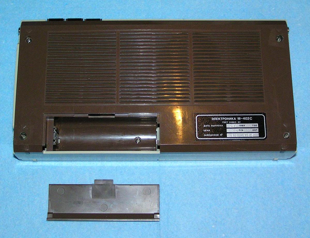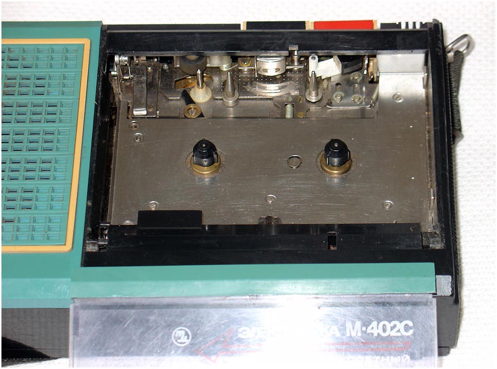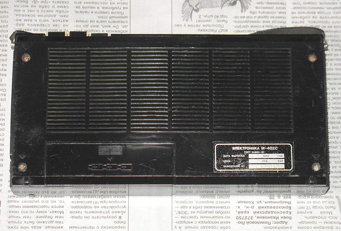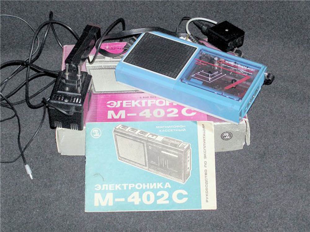 Кассетный стереофонический магнитофон *Электроника М-402С* с 1989 года выпускал Зеленоградский завод ТочМаш. Аппарат предназначен для записи фонограмм на магнитную ленту и их воспроизведения. Запись может производиться со встроенного микрофона или внешних источников. Прослушивание стереофонических фонограмм возможно на стереофонические телефоны или через внешний стереоусилитель с АС. В моно режиме для прослушивания фонограмм можно использовать встроенный громкоговоритель. В аппарате предусмотрены: автостоп при окончании ленты, возможность паузы в режимах записи и воспроизведения, световая индикация питания во всех режимах работы, переключение типа ленты в режиме воспроизведения, автоматическое переключение магнитофона из режима стерео (при работе со стереотелефонами) в режим моно (при работе на встроенный громкоговоритель). Питается магнитофон **Электроника М-402С** от 3-х элементов А-343 или от сети 220 В через БП типа **Электроника Д2-34-2**. Номинальная выходная мощность на стереотелефонах 3 мВт, на громкоговорителе 150 мВт; полный частотный диапазон при работе с лентой: МЭК-1 - 63...12500; взвешенное отношение сигнал/шум 44 дБ; время работы от свежего комплекта элементов не менее 5 часов; габариты магнитофона- 221х40х113 мм; масса без батарей и кассеты 1 кг.