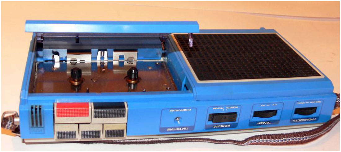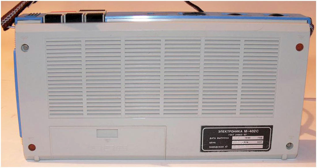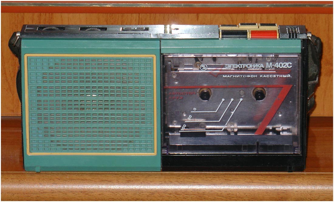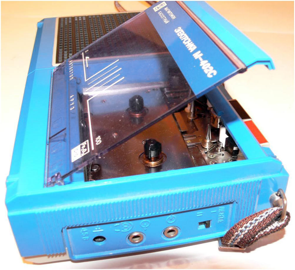 Кассетный стереофонический магнитофон *Электроника М-402С* с 1989 года выпускал Зеленоградский завод ТочМаш. Аппарат предназначен для записи фонограмм на магнитную ленту и их воспроизведения. Запись может производиться со встроенного микрофона или внешних источников. Прослушивание стереофонических фонограмм возможно на стереофонические телефоны или через внешний стереоусилитель с АС. В моно режиме для прослушивания фонограмм можно использовать встроенный громкоговоритель. В аппарате предусмотрены: автостоп при окончании ленты, возможность паузы в режимах записи и воспроизведения, световая индикация питания во всех режимах работы, переключение типа ленты в режиме воспроизведения, автоматическое переключение магнитофона из режима стерео (при работе со стереотелефонами) в режим моно (при работе на встроенный громкоговоритель). Питается магнитофон **Электроника М-402С** от 3-х элементов А-343 или от сети 220 В через БП типа **Электроника Д2-34-2**. Номинальная выходная мощность на стереотелефонах 3 мВт, на громкоговорителе 150 мВт; полный частотный диапазон при работе с лентой: МЭК-1 - 63...12500; взвешенное отношение сигнал/шум 44 дБ; время работы от свежего комплекта элементов не менее 5 часов; габариты магнитофона- 221х40х113 мм; масса без батарей и кассеты 1 кг.