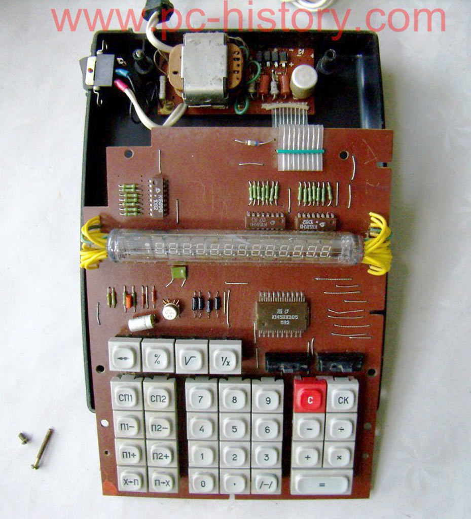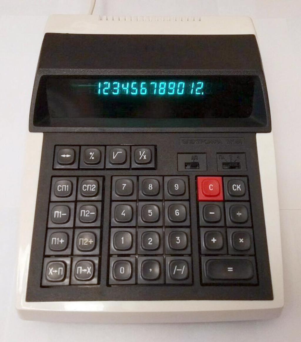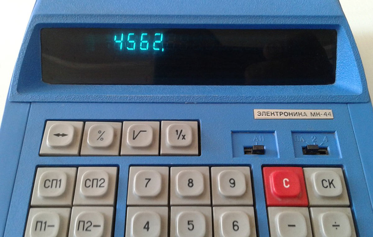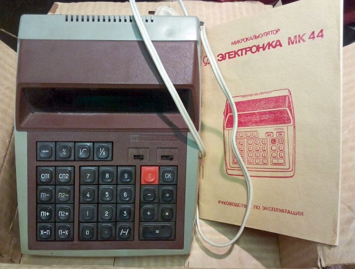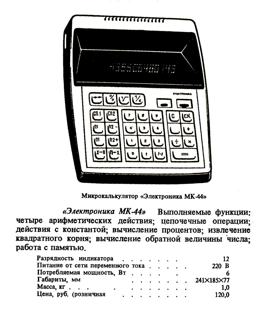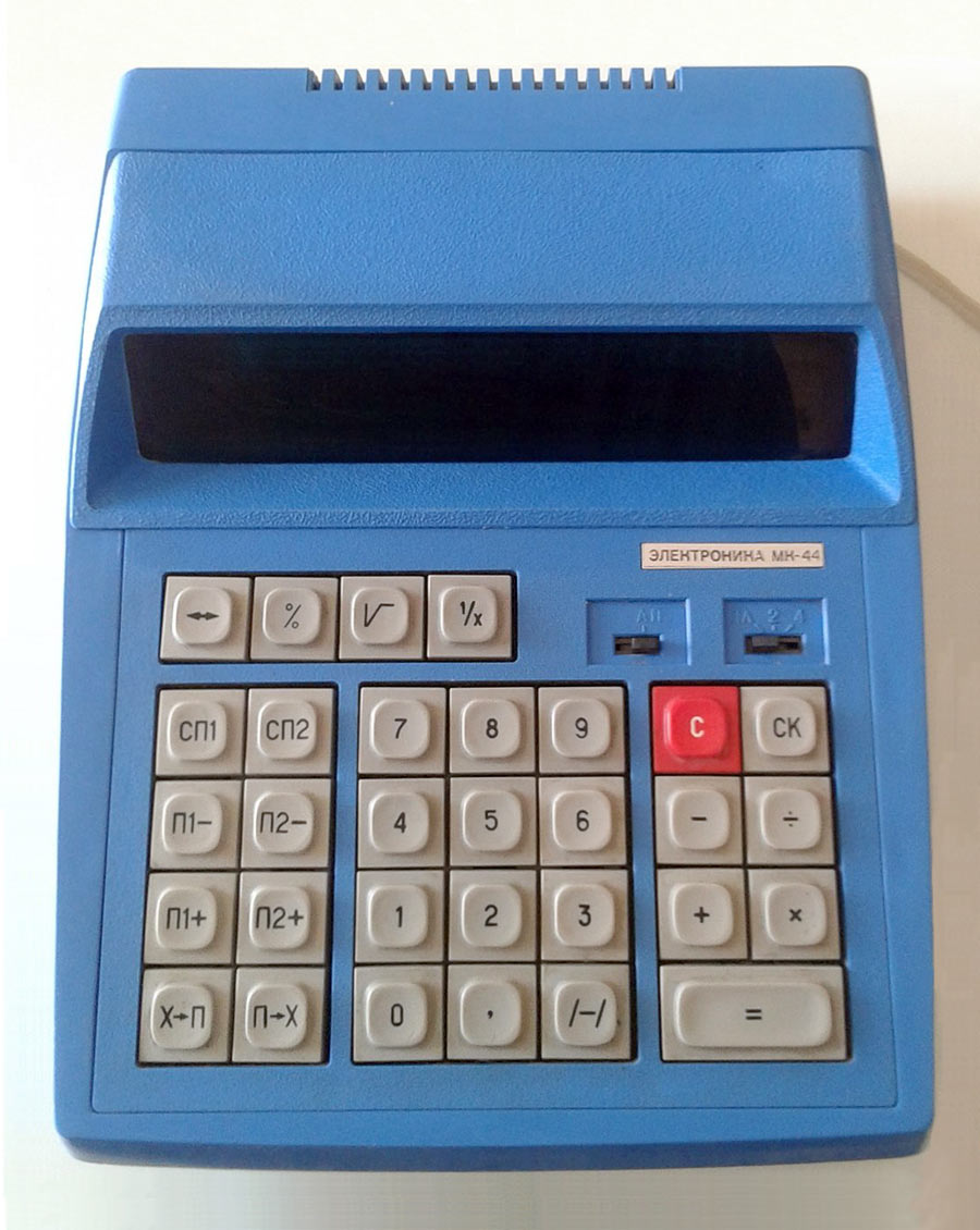 Настольный микрокалькулятор *Электроника МК-44* выпускался с 1982 года Фрязинским заводом имени 50-летия СССР. *Электроника МК-44* - это простой, двенадцатиразрядный микрокалькулятор с питанием от электрической сети. Предназначен для выполнения математических, экономических и бухгалтерских расчетов непрофессиональными счётными работниками. Выполняет четыре арифметические операции, цепочные вычисления, вычисления с константой, вычисление процентов, вычисление квадратного корня, вычисление обратной величины, изменение знака числа и операции с памятью 3 регистра памяти. Диапазон представляемых чисел: Режим с естественной запятой от ±10^11 до ± (10^12 — 1) Режим с фиксированной запятой от ± 10² до ± (10^10 — 0,01) — 2 разряда после запятой;от 10^4 до (10^8 — 0,0001) — 4 разряда после запятой. Габаритные размеры микрокалькулятора 241 х 183 х 77 мм. Масса 1 кг.