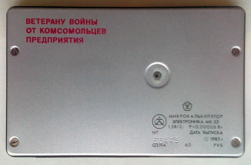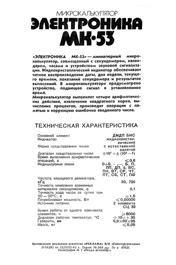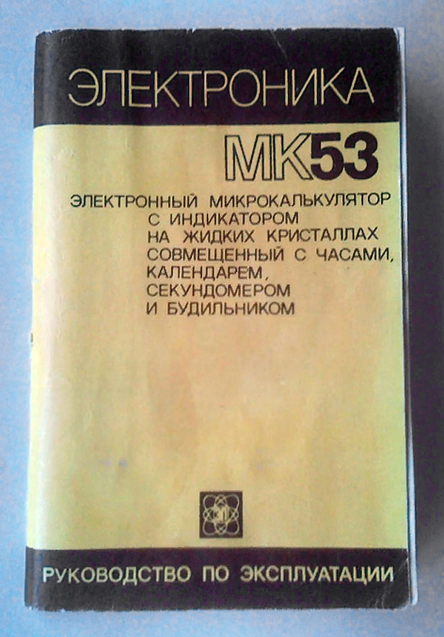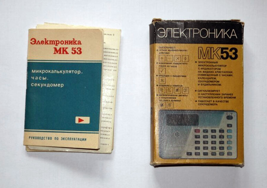 Электронный микрокалькулятор с индикатором на ЖК *Электроника МК-53*. Этот калькулятор - единственный в СССР калькулятор с часами, секундомером и неким подобие календаря. Предположительно с 1981 года выпускал Зеленоградский завод *Ангстрем*. Простой арифметический восьмиразрядный калькулятор c жидкокристаллическим экраном «Электроника МК-53» выпускался с 1986 года на заводе «Ангстрем» в Зеленограде и является первым калькулятором со встроенными секундомером, календарем, часами и будильником. Возможность работы с памятью и способность быстро решать математические задачи в сочетании с миниатюрными размерами делают данную модель незаменимым помощником всех школьников и студентов. Режим работы калькулятора изменяется с помощью трехпозиционного переключателя в правом верхнем углу:УТ — режим настройки часов, будильника и работы с секундомером;Т — режим просмотра времени (клавиатура при этом блокируется);МК — режим калькулятора и часов. По некоторым данным калькулятор является копией модели «Monroe M112». «Электроника МК-53» продавался и на экспорт, для чего информацию на задней стороне писали на английском языке, также переводилась и инструкция. Питание калькулятора осуществляется с помощью двух элементов типа СЦ-32 (современный аналог — LR-54). Время работа от одного комплекта элементов питания: более 8 000 часов.Габаритные размеры модели: 60×95×7 мм.Вес калькулятора: не более 50 г.