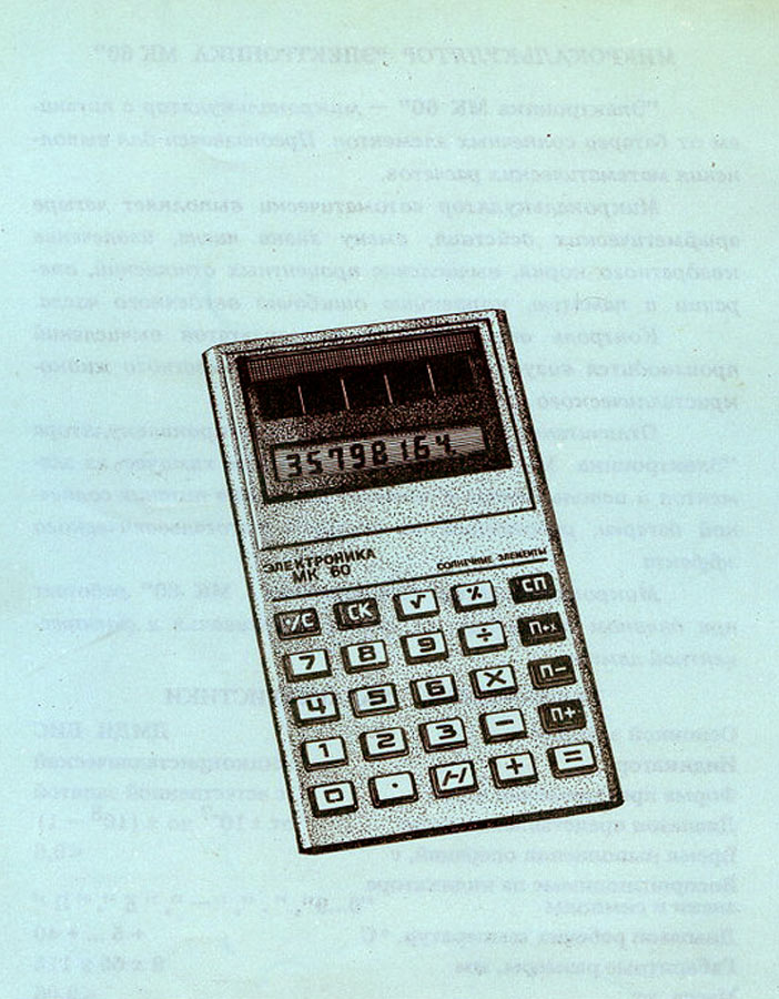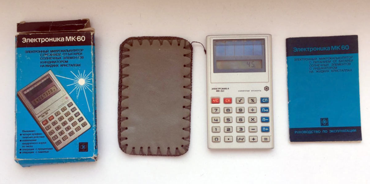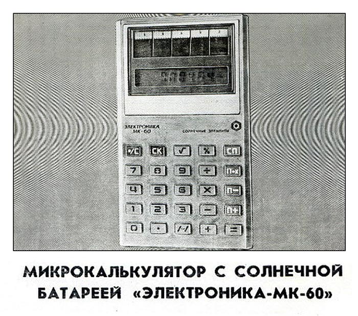Микрокалькулятор *Электроника МК-60* выпускался с 1982 года одним из Московских оборонных заводов. Это - первый отечественный калькулятор с питанием на солнечных элементах. Калькулятор выполняет четыре арифметические операции: это смена знака числа, извлечение квадратного корня, вычисление процентных отношений, операции с памятью, коррекцию ошибочно введенного числа. Предусмотрено отключение через 10 минут простоя. Цена МК до 1991 года - 45 рублей. Калькулятор является первой моделью, в которой источником питания выступают солнечные элементы. В качестве индикатора используется восьмиразрядный жидкокристаллический дисплей, корпус модели выполнен из металла. «Электроника МК-60» относится к классу простых арифметических и умеет выполнять автоматически 11 операций, каждая операция выполняется менее чем за 0,6 секунды. «Микрокалькулятор выполнен на однокристальной БИС, содержащей 8 тысяч транзисторов и работает как при естественном освещении, так и при искусственном — от лампы накаливания мощностью 100 Вт на расстоянии не более 2 м. Отличительной особенностью микрокалькулятора „Электроника МК-60“ является наличие устройства автоматического отключения питания через 10–12 минут после последней операции» — так описывал калькулятор ЦНИИ (Центральный научно-исследовательский институт) «Электроника» в брошюре «Новости бытовой электронной техники». Существует также и модификация «Электроника МК-60М» функционально ничем не отличающаяся от рассматриваемой модели. Также у калькулятора была и экспортная модель — «ELORG-60». Габаритные размеры калькулятора: 115,2×65,2×9 мм.Вес калькулятора: не более 60 г.