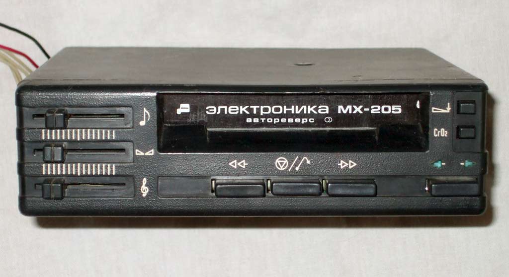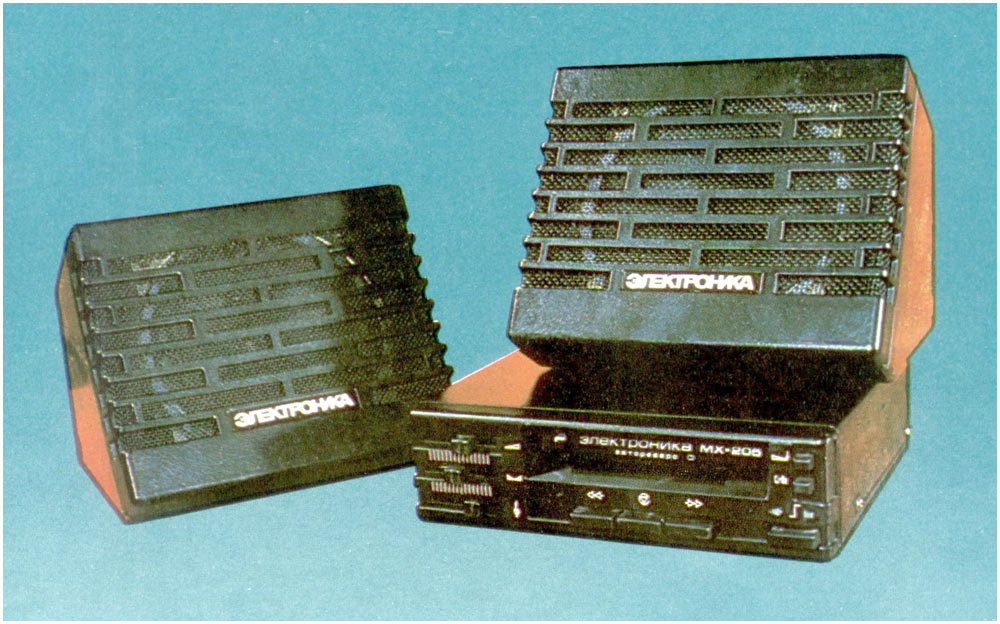 Автомобильное воспроизводящее устройство **Электроника МХ-205 стерео** выпускалось с I-кв 1985 года. АВУ предназначено для установки в отечественные легковые автомобили и обеспечивает; воспроизведение моно и стерео фонограмм звука; световую индикацию направления движения ленты; снижение ВЧ шумов; применения магнитной ленты из двуокиси хрома; автоматическое воспроизведение после перемотки кассеты. Номинальная выходная мощность 2x3 Вт. Потребляемая мощность (при номинальной выходной) 16 Вт. Диапазон рабочих частот на выходе к АС - 63...10000 Гц. Коэффициент детонации 0,3%. Относительный уровень шумов и помех с системой шумопонижени 54, без 48 дБ. Габариты АВУ - 190x170x55 мм. Габариты одной АС - 174x140x145. Масса АВУ - 2 кг. Масса одной АС - 1,05 кг. Цена комплекта АВУ - 250 рублей.