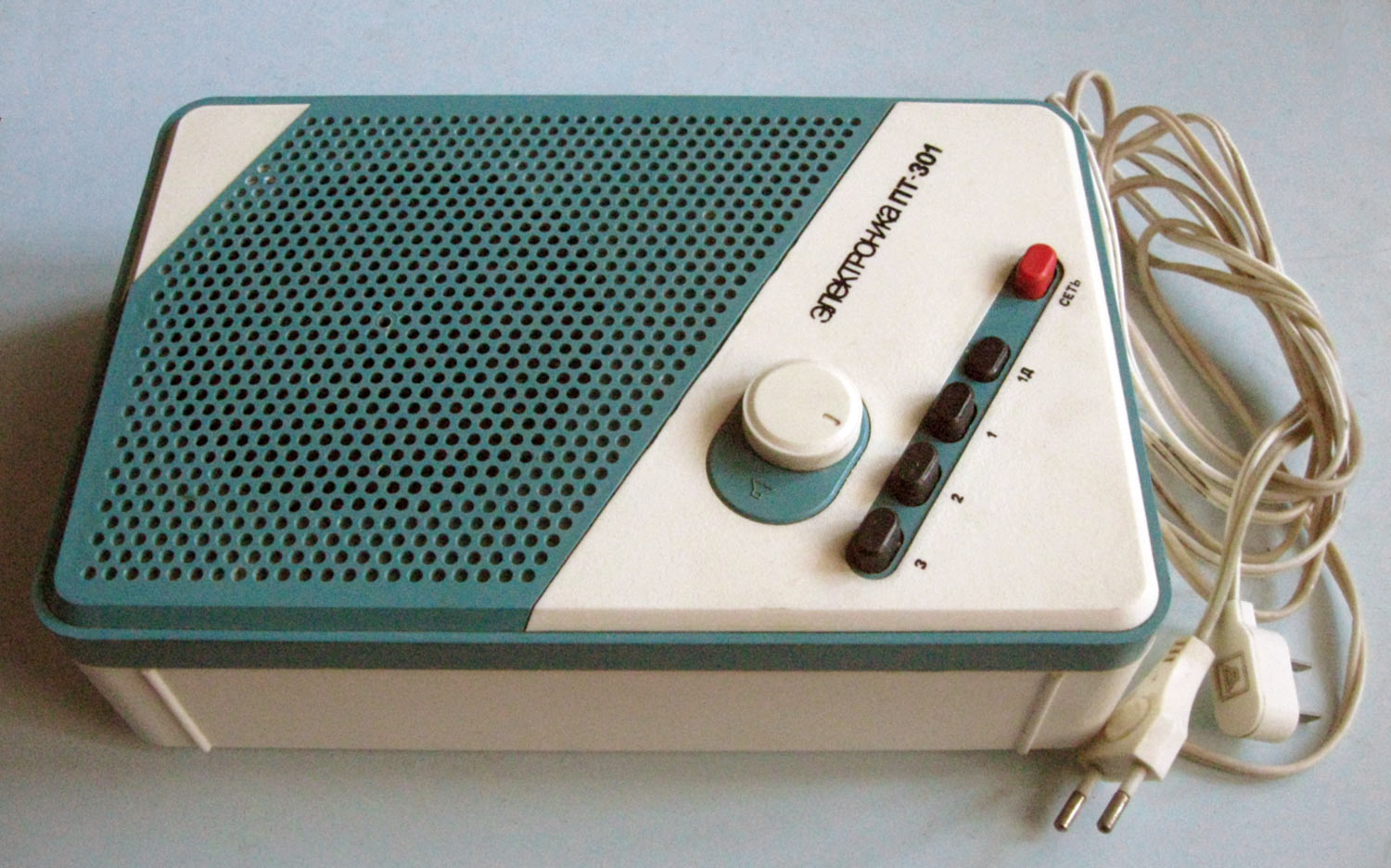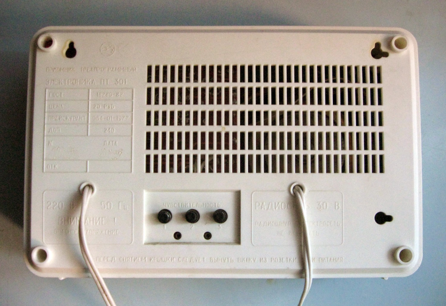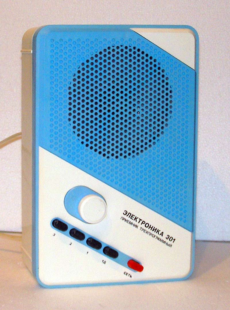 Приёмник трёхпрограммный *Электроника-301* с 1985 года выпускал Ставропольский завод *Изумруд*. ПТ предназначен для работы в радиосети трехпрограммного вещания с напряжением 30 вольт, обеспечивая приём НЧ программы с усилением и без и двух ВЧ программ. ПТ имеет гнездо для записи программ на магнитофон. Диапазон воспроизводимых звуковых частот по НЧ и ВЧ каналам - 160...6300 Гц. Номинальная выходная мощность 0,5 Вт. Потребляемая от сети мощность 4 Вт. С начала 1987 года приёмник трёхпрограммный именовался как *Электроника ПТ-301*.