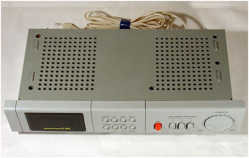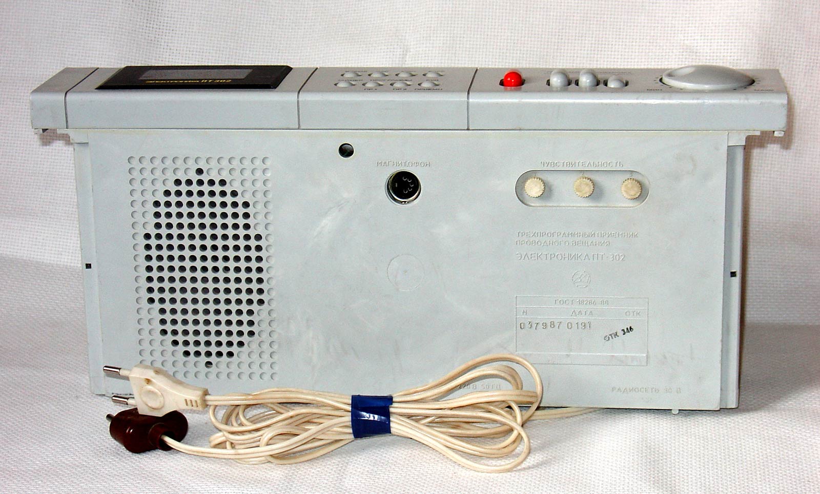 Приёмник трёхпрограммный *Электроника ПТ-302** с 1989 года выпускал Ставропольский завод *Изумруд*. ПТ предназначен для работы от сети трехпрограммного проводного вещания с напряжением НЧ тракта 30 вольт. ПТ обеспечивает приём сигнала ЗЧ с усилением и без и 2-х ВЧ сигналов с несущими частотами 78 кГц (II программа) и 120 кГц (III программа). ПТ имеет выход для записи на магнитофон. Диапазон частот по НЧ каналам 160...6300 Гц, по ВЧ - 160...6300 Гц. Номинальная выходная мощность 0,5 Вт. Мощность, потребляемая от сети 4 Вт. ПТ имеет встроенные электронные часы и таймер, позволяющий включать его в заранее установленное время.