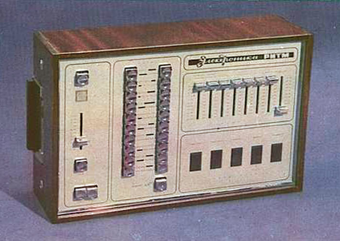 Ритмический электромузыкальный инструмент *Электроника-Ритм* выпускался с 1981 года. Он предназначен для ритмичного сопровождения танцевальных мелодий и используется в составе эстрадных инструментов, ансамблей и оркестров. *Электроника Ритм* это аналоговый драм бокс с 30-ю пресетными стилями и базовыми звуками, такими как: большой барабан, малый, рим, том, тарелки с некоторой перкуссией. Барабанные звуки имеют индивидуальный контроль (8 ползунков), также имеются 5 конопок (пэдов) для реальной игры. Ручки управления: общая громкость, темп, старт/стоп, 3/4, 4/4. Отдельная громкость для большого барабана, малого, рим, том, ковбэл, тарелок, перкуссии, общая. Пресетные ритмы: Свинг, Латин, Вестерн, Ча-ча-ча, Рок, Румба, Ритм блюз, Калипсо, Полька, Мамбо, Танго, Джаз, Вальс, Боссанова, Рок 6/8, Бегин, Вальс, Самба, Рок баллада. Питание - сеть 220 В. Потребляемая мощность 20 Вт. Габариты инструмента 500x320x180 мм. Масса 9 кг. Цена 290 рублей.