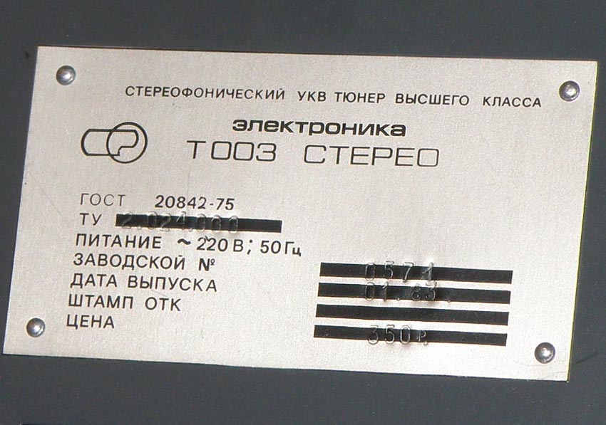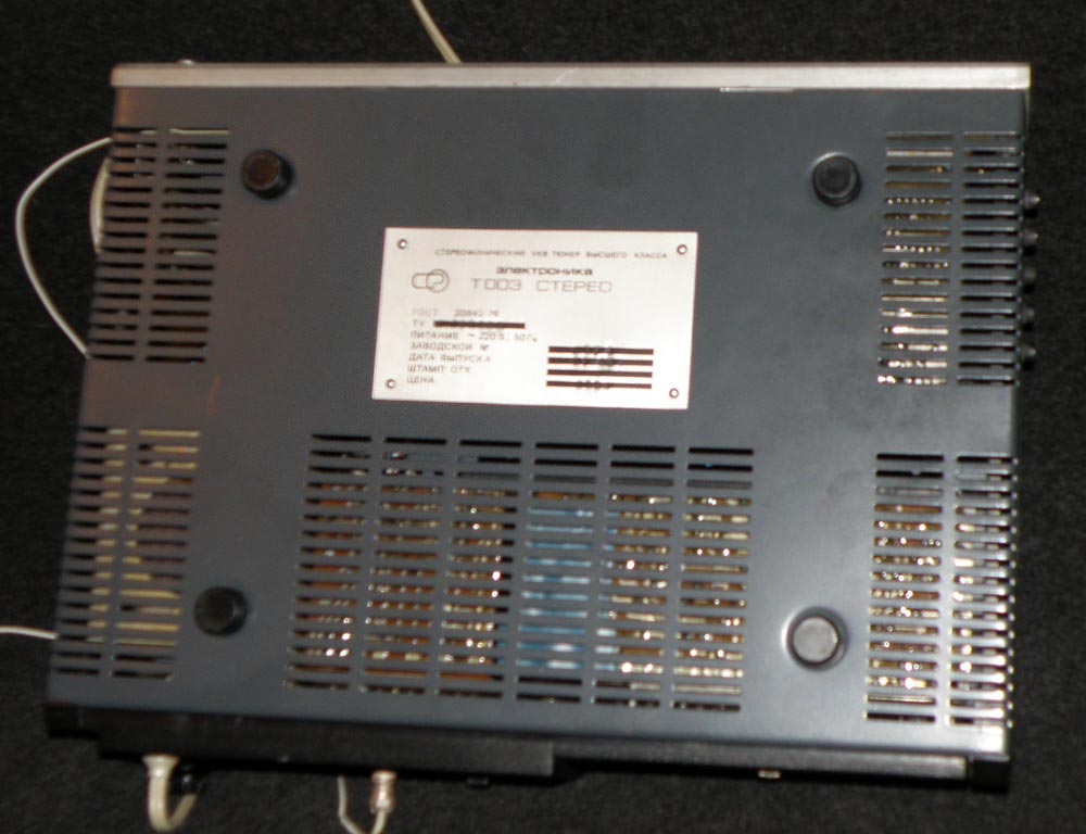 Стационарный транзисторный тюнер *Электроника Т-003-стерео* с 1983 года выпускал Горьковский завод *Орбита*. Тюнер входил в стереокомплекс *Электроника Т1-003-стерео*, но продавался и отдельно. Тюнер предназначен для высококачественного приёма моно и стереофонических радиостанций в диапазоне УКВ-ЧМ с использованием внешнего высококачественного стереофонического усилителя с АС или головных стереотелефонов. Особенностями тюнера являются: квазисенсорное переключение режимов работы и каналов; цифровая индикация частоты; автоматически отключаемая при перестройке система АПЧ; система БШН; электронный индикатор уровня принимаемого сигнала; индикатор наличия стереопередачи; автоматический переход из режима **моно** в **стерео** при приёме стереопрограмм; возможность ручного переключения режимов моно - стерео; модульная конструкция, малые габариты. Тюнер снабжен гнёздами для внешней антены 75 Ом; усилителя, телефонов и магнитофона на запись; индикатора многолучевого приёма. Основные характеристики тюнера: Диапазон принимаемых частот 65,8...73,0 МГц. Чувствительность 10 мкВ. Селективность по зеркальному и дополнительным каналам приёма 80 дБ. Порог срабатывания стерео-индикатора 2,5 мкВ. Коэффициент гармоник 1%. Переходные затухания между стереоканалами 28 дБ. Выходное напряжение на выходах для подключения усилителя 650 мВ, на выходах для подключения магнитофона 30 мВ. Максимальное отношение сигнал/шум в стереорежиме 60 дБ. АЧХ на выходе для подключения магнитофона в стереорежиме 31,5...15000 Гц. Погрешность измерения принимаемой частоты ±10 кГц. Напряжение питающей сети переменного тока 220 ±10% В. Потребляемая мощность - 14 Вт. Габариты тюнера - 300x224x66 мм. Его масса - 4 кг.