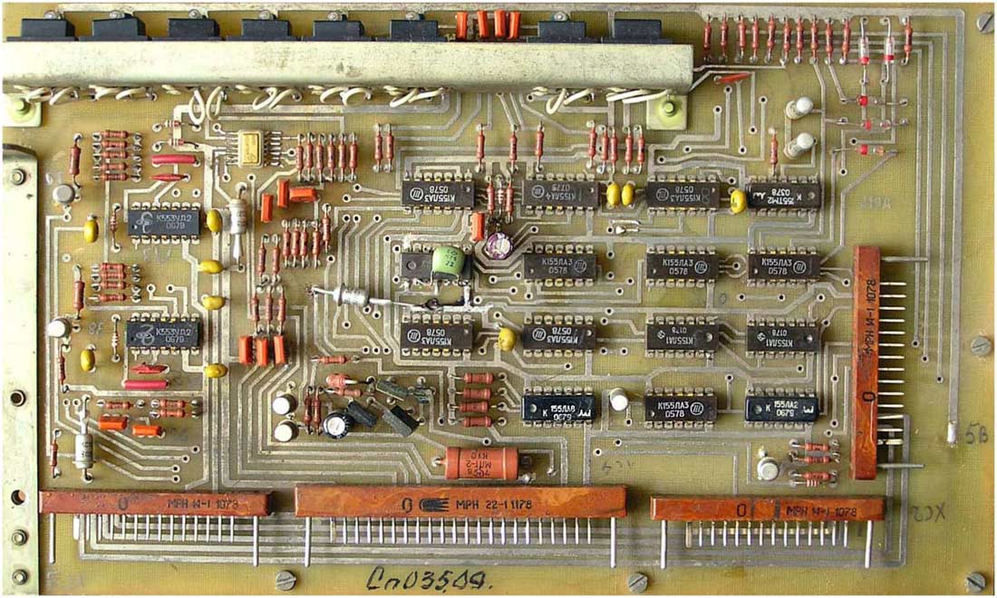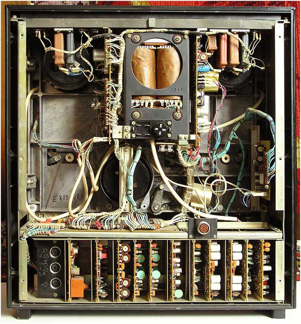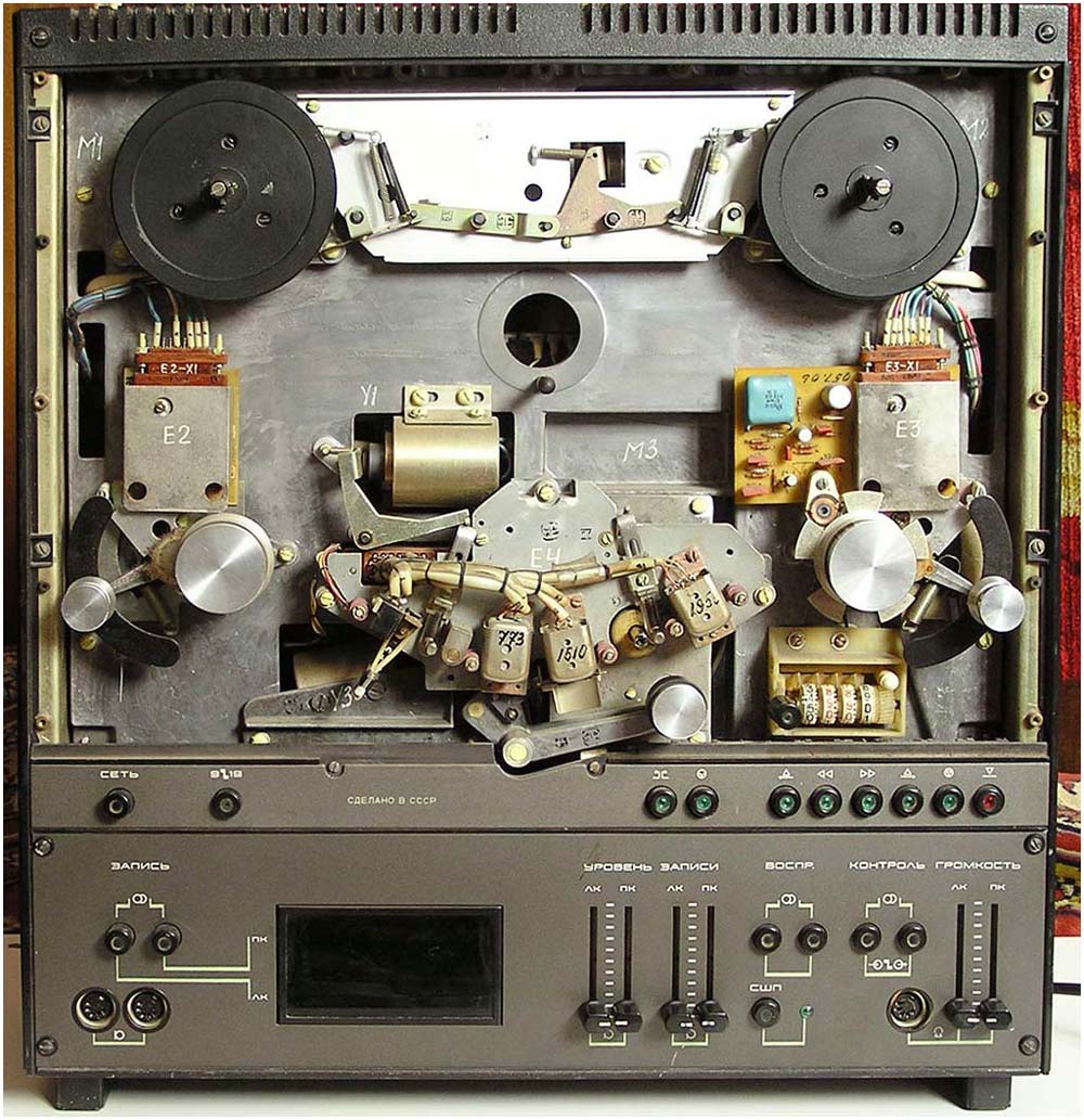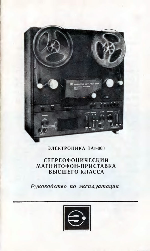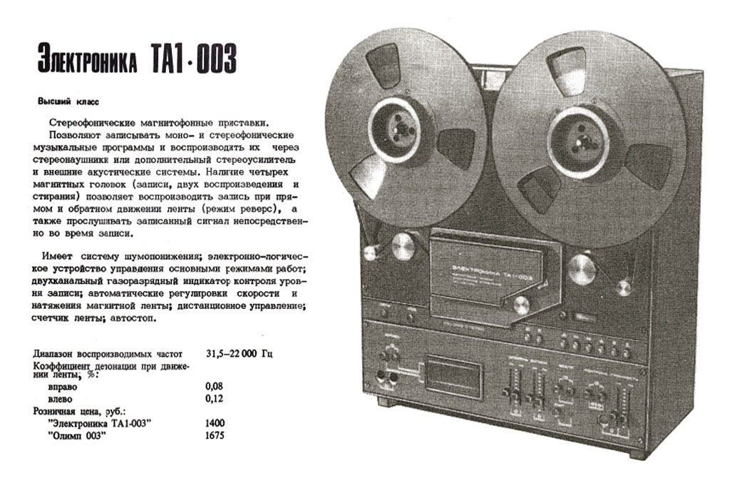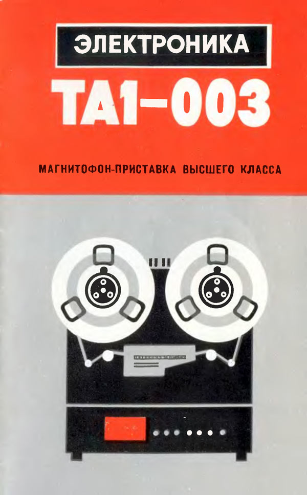 Стереофонический магнитофон-приставка *Электроника ТА1-003* с 1979 года выпускалась Фрязинским заводом *Рений* при НПО *Исток*, а с 1980 года и Кировским электромашиностроительным производственным объединением имени Лепсе. МП со сквозным каналом *Электроника ТА1-003* предназначена для высококачественной записи фонограмм на магнитные ленты типа А4409-6Б и А4309-6Б с последующим или одновременным воспроизведением через внешний усилитель с АС или на стереофонические телефоны. От подобных аппаратов высшего класса эту модель отличает блочно-модульная конструкция, широкое использование электронной коммутации и высокая автоматизация 3-х двигательного блока ЛПМ. В МП имеется: система автоматического управления ведущим двигателем прямого привода; устройство для электронного торможения; система стабилизации натяжения магнитой ленты во всех режимах работы; фотоэлектрический автостоп. Имеются следующие режимы: воспроизведение вперед и назад (реверс); ускоренная перемотка ленты в обоих направлениях; *Запись*; *Стоп*; *Пауза*; *Откат*. Перевод из одного режима в другой осуществляется электронным устройством с псевдосенсорным управлением, исключающим деформацию ленты при нажатии кнопки выбранного режима, минуя кнопку *Стоп* при случайном нажатии на несколько кнопок и в других случаях. Имеется: система шумопонижения, работающая в сквозном канале; 4-х разрядный счетчик ленты с автономным датчиком; газоразрядный индикатор уровня записи и воспроизведения; беспровоной пульт ДУ с подключением стереотелефонов. МП собрана на 40 микросхемах, 132 транзисторах, 80 диодах, 4 оптронах и 2 симисторах. Краткие характеристики: диаметр катушки 270 мм; скорость ЛПМ - 19,05; 9,53 см/сек; коэффициент детонации при скорости ленты 19,05 см/сек - ±0,08%, 9,53 см/сек - ±0,15%; рабочий диапазон частот на ЛВ при скорости ленты 19,05 см/сек - 31,5...22000 Гц; 9,53 см/с - 31.5...16000 Гц; относительный уровень помех в канале воспроизведения -53 дБ; записи/воспроизведения -62 дБ; снижение относительного уровня помех при включении СШП до 8 дБ; коэффициент гармоник 1,2%; номинальное напряжение сигнала на ЛВ - 0,4...0,6 В; номинальная выходная мощность усилителей стереотелефонов на нагрузке 8 Ом - 1 мВт; потребляемая мощность 130 Вт. Габариты МП - 491х220х456 мм, масса 27 кг.