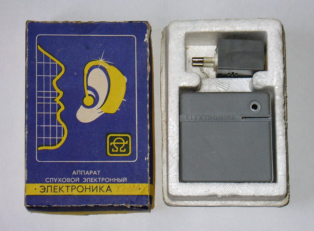 Аппарат слуховой электронный *Электроника У-2М1* или У-2М4 выпускался с 1990 года. Аппарат предназначен для компенсации слабых и средних потерь слуха. Акустическое усиление аппарата *Электроника У-2М1* - 50 дБ, *Электроника У-2М4* - 40 дБ. Уровень выходного звукового давления 90 и 86 дБ. Диапазон рабочих звуковых частот - 300...3000 Гц. Напряжение питания 1,2 В. Продолжительность непрерывной работы около 20 часов.