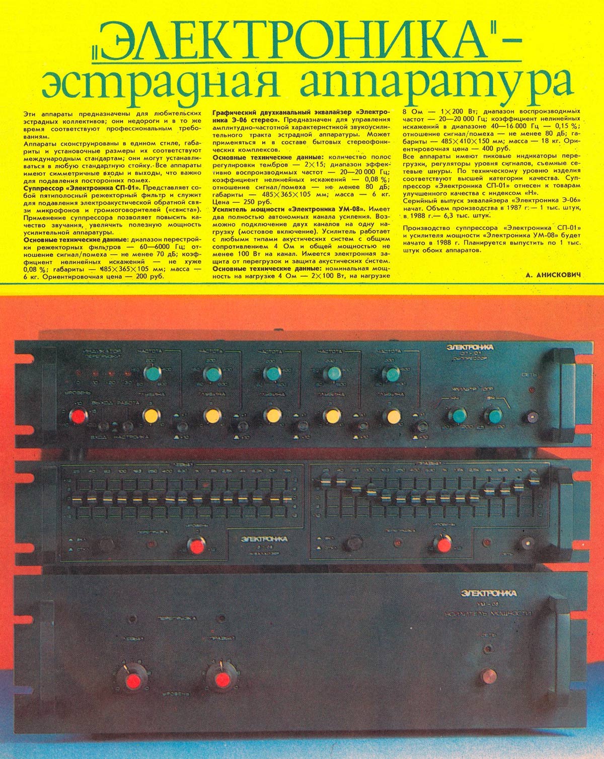 Двухканальный усилитель мощности *Электроника УМ-08* планировалось выпускать с 1988 года Брянским заводом полупроводниковых приборов. УМ предназначен для работы с любыми акустическими системами с электрическим сопротивлением 4 Ом и мощностью не менее 100 Вт. Усилитель мощности предназначен для любительских эстрадных коллективов, совместно с эквалайзером *Электроника Э-06* и режектроным фильтром *Электроника СП-01*. Технические характеристики УМ: диапазон воспроизводимых частот - 20...20000 Гц; отношение сигнал/помеха - 80 дБ; номинальная выходная мощность - 2x100 Вт; коэффициент гармоник - 0,15 %. Размеры УМ - 485x410x150 мм. Масса 18 кг.