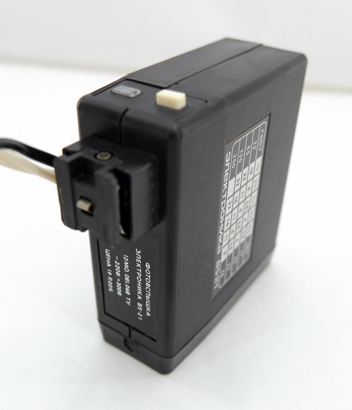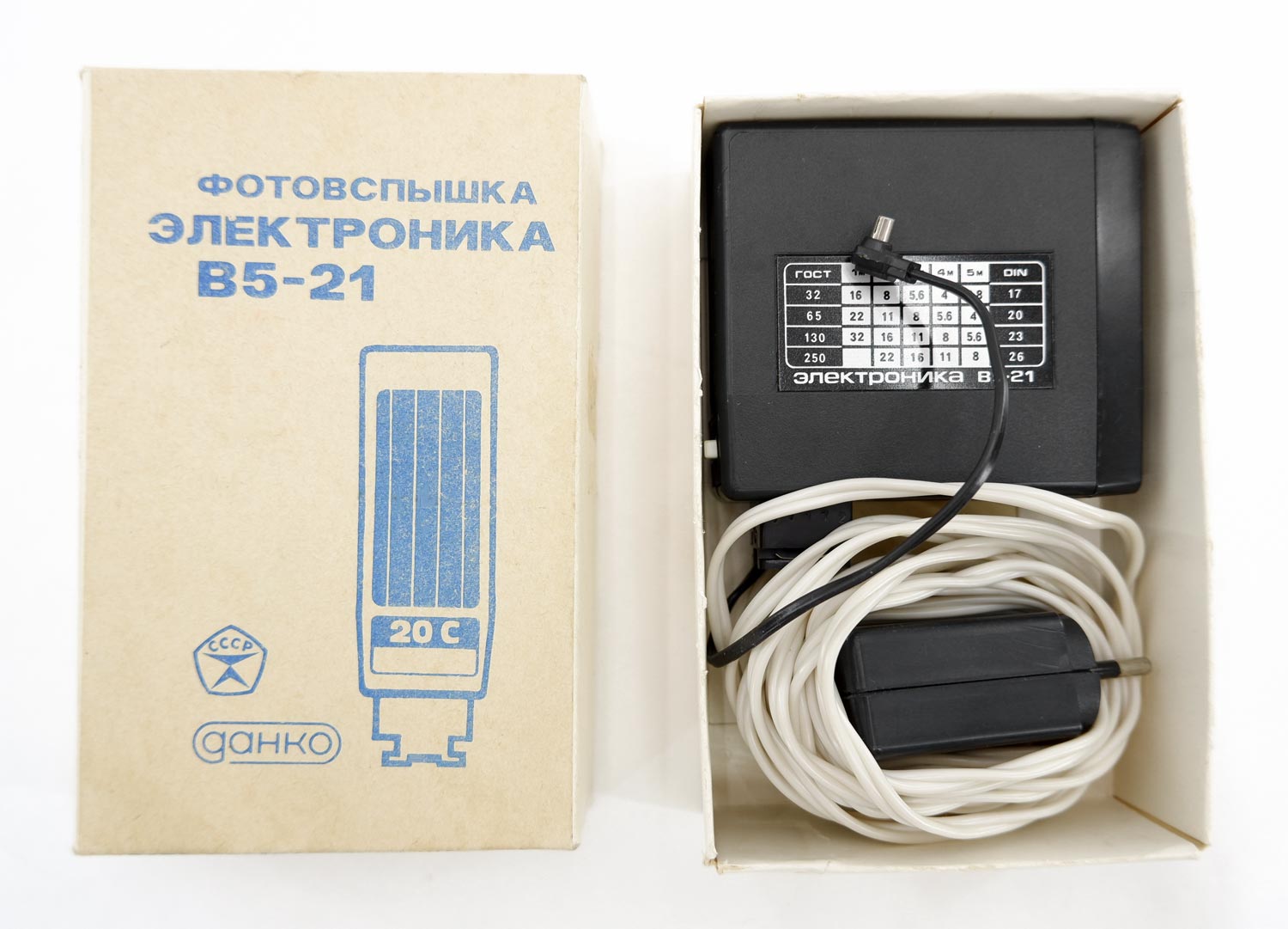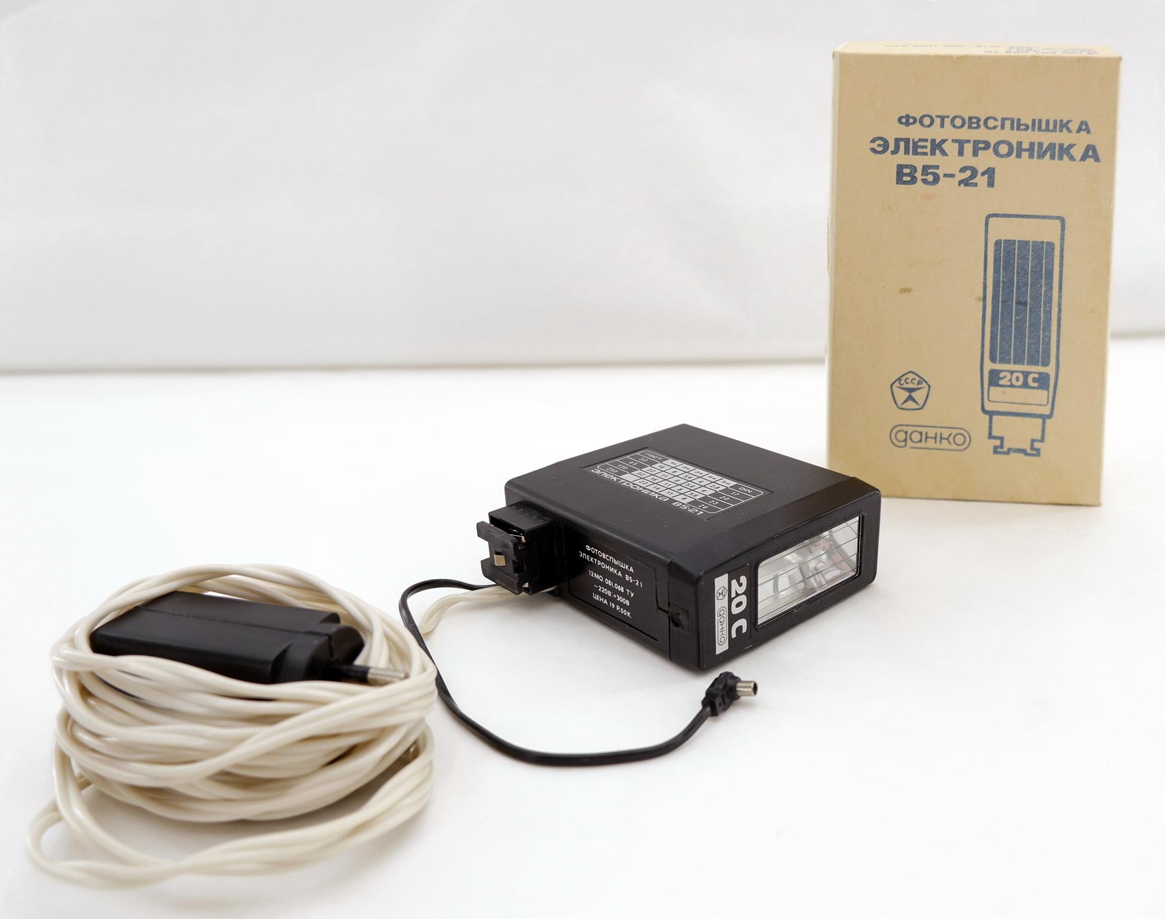Фотовспышка *Электроника В5-21* выпускалась с 1979 года предприятием, с товарным знаком *Данко-20*. Фотовспышка предназначена для мгновенного освещения объектов при фотографировании на цветную и чёрно-белую фотопленку. Фотовспышка может работать с фотоаппаратами, имеющими гнездо для синхроконтакта или обойму с электрическим контактом для крепления различных фотопринадлежностей. Питание от электрической сети. Длина шнура питания 3,5 метра. Ведущее число для плёнки чувствительностью 65 ед, ГОСТ 5554-70 20. Электрическая энергия вспышки 38 Дж. Углы излучения в горизонтальной и вертикальной плоскостях 50...70 градусов. Интервал между вспышками от 15 до 60 секунд. Габариты фотовспышки 35x95x91 мм. Масса 320 грамм. Цена фотовспышки в разное время 16 и 19 рублей.