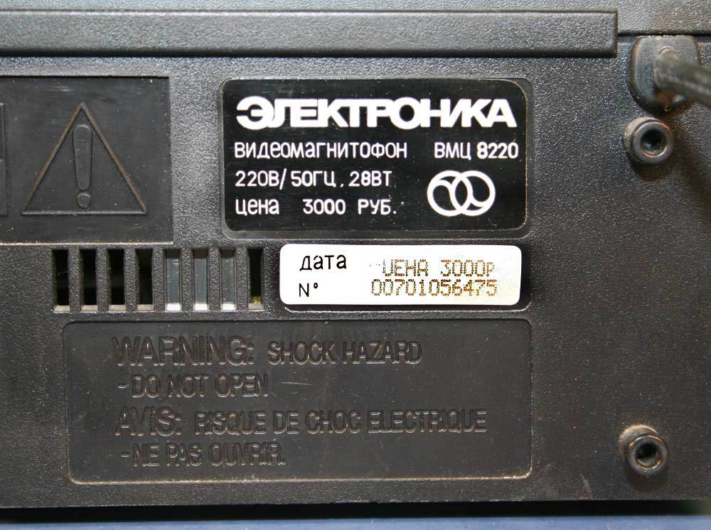Кассетный видеомагнитофон *Электроника ВМЦ-8220* с 1987 года выпускал Воронежский завод *Видеофон*. Кассетный видеомагнитофон *Электроника ВМЦ-8220* - копия видеомагнитофона *Samsung VX-8220*. Видеомагнитофон позволяет: Воспроизведение ранее записанных видеокассет. Просмотр ТВ программы при одновременной записи другой программы. Запись и воспроизведение в течение четырёх часов на видеокассете типа Е-240. Запись программ с помощью таймера в течении 2 недель. Оперативную запись. Быстрый поиск изображения при перемотке вперед и обратной перемотке. Воспроизведение остановленного изображения. Дистанционное управление ВМ (22 команды). Частотно-синтезирующий тюнер принимает 69 каналов в варианте 6,5 МГц и 80 каналов в 5,5 МГц. ВМ имеет три автоматические системы: Автоматическое включение питания сети, автоматическое воспроизведение, автоматическая обратная перемотка). ВМ имеет повышенную четкость изображения с помощью системы HQ. Технические данные ВМ: Стандарт VHS. Система записи двумя вращающимися головками, наклонострочная. Телевизионная система CCIR, OIRT. Система цвета ПАЛ, СЕКАМ, МЕСЕКАМ. Ширина ленты 12,65 мм. Скорость движения ленты 23,39 мм/сек. Время записи (воспроизведения) 4 часа на кассете типа Е-240. Время перемотки не более 6 минут на кассете Е-180. Отношение сигнал/шум не менее 40 дБ. Разрешающая способность по горизонтали не менее 240 линий. Полоса воспроизводимых частот звука 100...8000 Гц. Каналы приёмника МВI, МВIII, ДМВ. Антенна - 75 Ом. Радиочастотный выход CCIR на ДМВ с 30 по 39 канал. Питание ВМ от электросети. Потребляемая мощность 28 Вт, в выключенном режиме 7 Вт. Габариты видеомагнитофона 420х345х93 мм. Масса 6,6 кг.