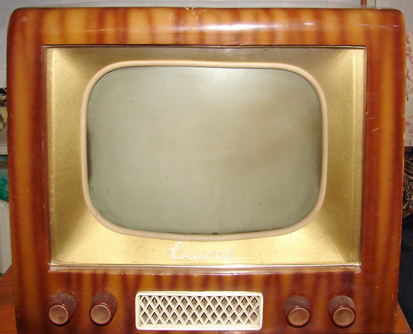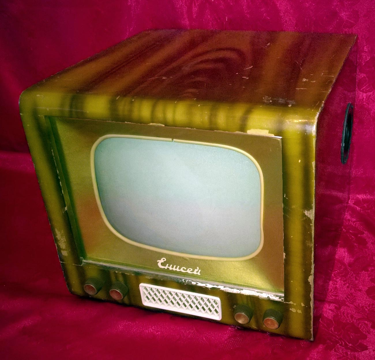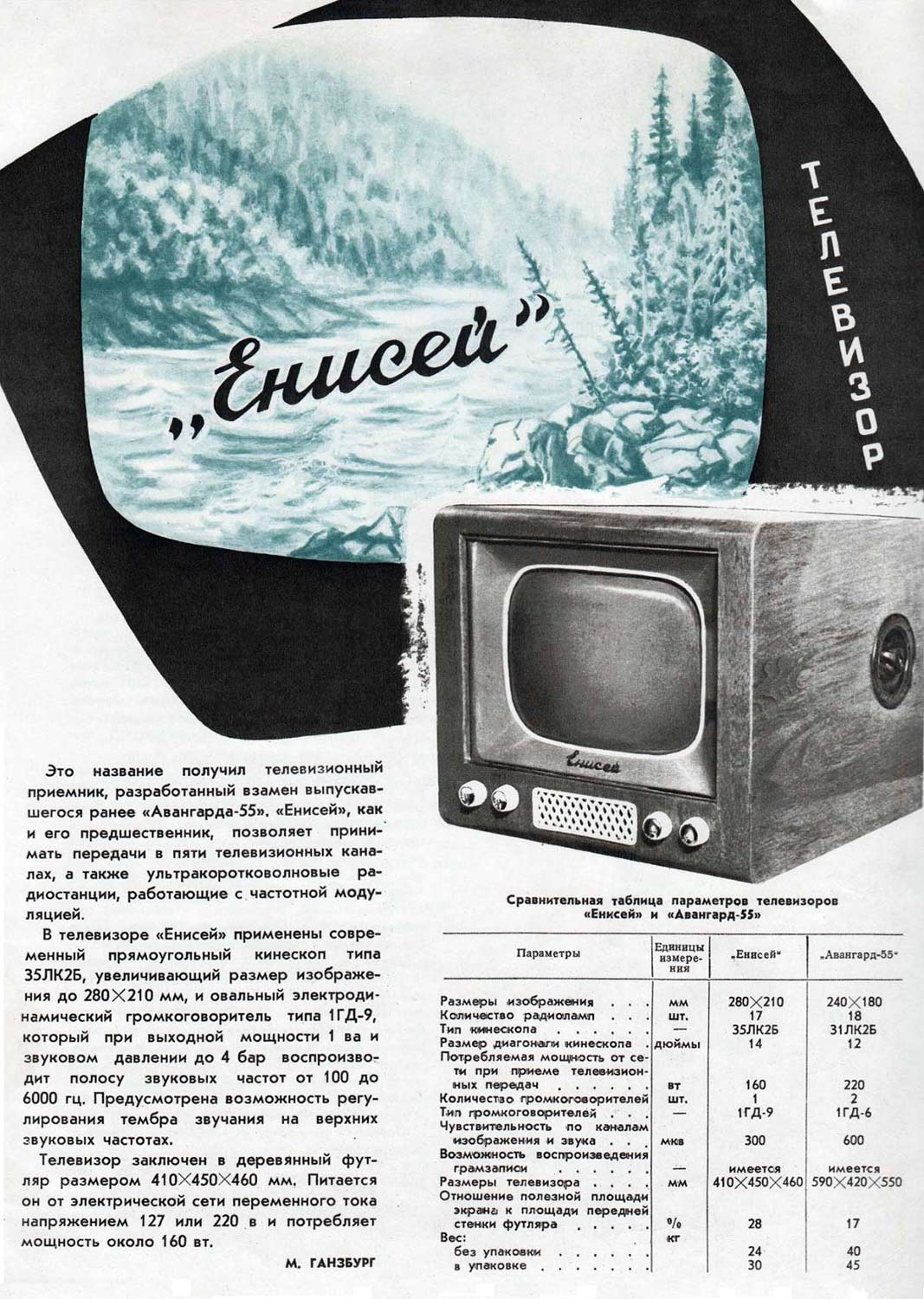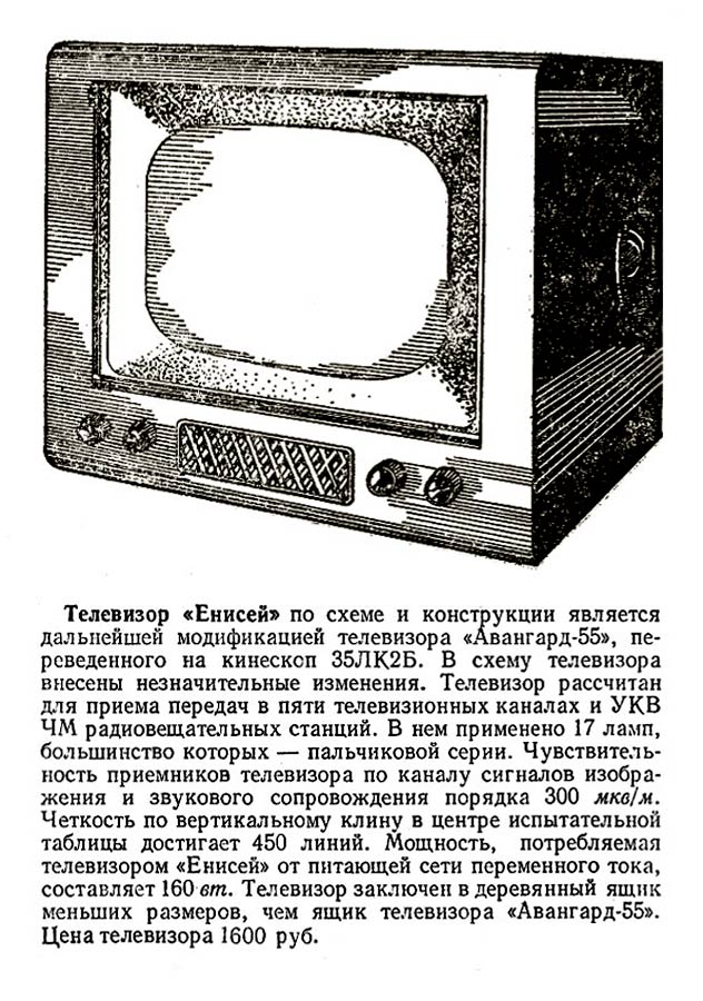Телевизор *Енисей* с 1958 года выпускал Красноярский завод телевизоров. Телевизор предназначен для приёма телевизионных программ на любом из 5 телевизионных каналов, прослушивания ЧМ станций, а также грамзаписи с помощью от внешнего ЭПУ. Применено 17 радиоламп, 8 диодов, кинескоп 35ЛК2Б. Чувствительность 300 мкВ. Номинальная выходная мощность 1 Вт. Полоса воспроизводимых звуковых частот 100...6000 Гц. Питание от сети 127 или 220 вольт. Потребляемая мощность 145 Вт, при приёме ЧМ - 90 Вт. На лицевую панель выведены ручки громкости, яркости, тембра, контрастности и выключателя сети. Сзади на шасси находятся регуляторы линейности, размера, частоты кадров, строк, гнёзда антенн, звукоснимателя, сетевые предохранители, переключатель сети. Блок питания собран по автотрансформаторной схеме на диодах, поэтому заземление к телевизору подключать нельзя. Габариты модели - 415 х 450 х 525 мм. Масса 24 кг. Цена 192 рубля с 1961 года. Футляр деревянный, с имитацией ценных пород. Всего выпущено около 60 тысяч телевизоров *Енисей*. Радио №2/1966, ст.25 Нарушена кадровая синхронизация. Изображение перемещается по вертикали в такт со звуковым сопровождением. Во время пауз изображение устойчиво. При проверке оказалось, что узлы кадровой развертки и синхронизации полностью исправны. Причина неисправности заключалась в выходе из строя электролитического конденсатора С17—100 мкфХ20 в. После замены его телевизор стал работать нормально.