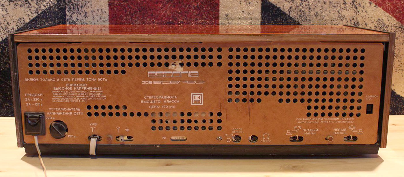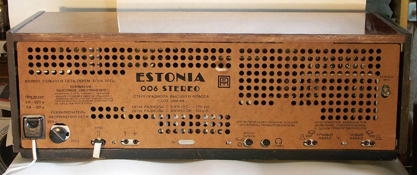 Радиола сетевая ламповая *Эстония-006-стерео* с 1973 года выпускалась Таллинским заводом Пунане-РЭТ. Разработана на основе радиолы **Эстония-стерео** и имеет ряд эксплуатационных преимуществ. Ламповый усилитель заменен транзисторным. Электромоторная система АПЧ в диапазоне УКВ заменена электронной. Использованы широкополосные малогабаритные АС *10МАС-1*. Радиола состоит из всеволнового вещательного приёмника, электропроигрывающего устройства II-ЭПУ-52С и двух АС. Приёмник работает в диапазонах ДВ, СВ, КВ и УКВ-ЧМ. Чувствительность с антенны в диапазонах АМ - 50 мкВ, ЧМ - 5 мкВ. Избирательность в диапазонах АМ 60 дБ. Ослабление сигнала зеркального канала в диапазонах ДВ 60 дБ, СВ 50 дБ, KB 26 дБ и УКВ 30 дБ. АРУ позволяет получить изменение выходного сигнала не более 6,5 дБ при изменении входного сигнала на 60 дБ. Номинальная выходная мощность - 2х10 Вт при КНИ - 2%, максимальная - 2х25 Вт. Диапазон частот по звуковому давлению 63...16000 Гц при неравномерности АЧХ 14 дБ. Пределы регулировки тембра 14 дБ. Уровень фона со входа УНЧ не хуже 60 дБ. Переходные затухания между каналами 30 дБ с антенного входа и 40 дБ со входа УНЧ. ЭПУ имеет 3 скорости 33, 45 и 78 об/мин, автостоп и микролифт. Размеры радиоприёмника 790х270х340 мм, масса 25 кг, размеры ЭПУ 450х160х330 мм, масса 10 кг, размеры одной АС 420х247х270 мм, масса одной АС - 9 кг. Цена комплекта - 470 рублей. Реклама РЛ в Радио №1 за 1973 год.
