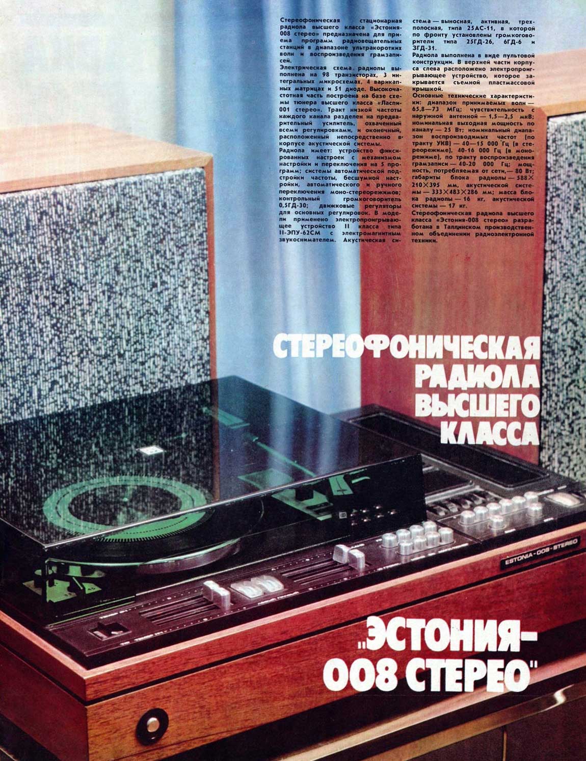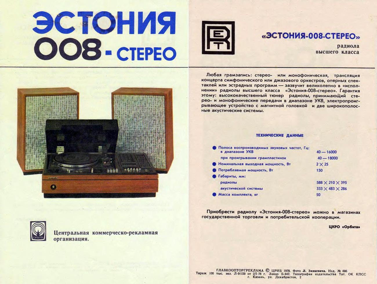 Стереофоническая радиола высшего класса *Эстония-008-стерео* с 1979 года выпускалась Таллинским заводом *Пунане-РЭТ*. Радиола принимает моно и стереофонические передачи в диапазоне УКВ, воспроизводит моно и стереофонические грампластинки. К ней можно подключать магнитофон на записи с тюнера или ЭПУ и воспроизведения фонограмм. Есть АПЧ, БШН, фиксированная настройка на пять радиостанций, регулировка тембров, отключаемая система тонкомпенсации, регулировка стереобаланса. Для контроля есть стрелочный и световой индикаторы настройки, индикатор стереопередачи, два индикатора уровня выходной мощности в трактах НЧ, контрольный динамик. В радиоле применены активные АС. Диапазон 65,8...73 МГц. Чувствительность 2,5 мкВ. Номинальная выходная мощность 2х25, максимальная 2х35 Вт. Диапазон рабочих частот при приёме в режимах: *стерео* - 40...15000 Гц, *моно* - 40...16000 Гц, при работе ЭПУ - 40...20000 Гц. Потребляемая мощность 80 Вт. Габариты РЛ - 588x210x395 мм, одной АС - 330х483х386 мм. Масса радиолы 16 кг, АС 17 кг.