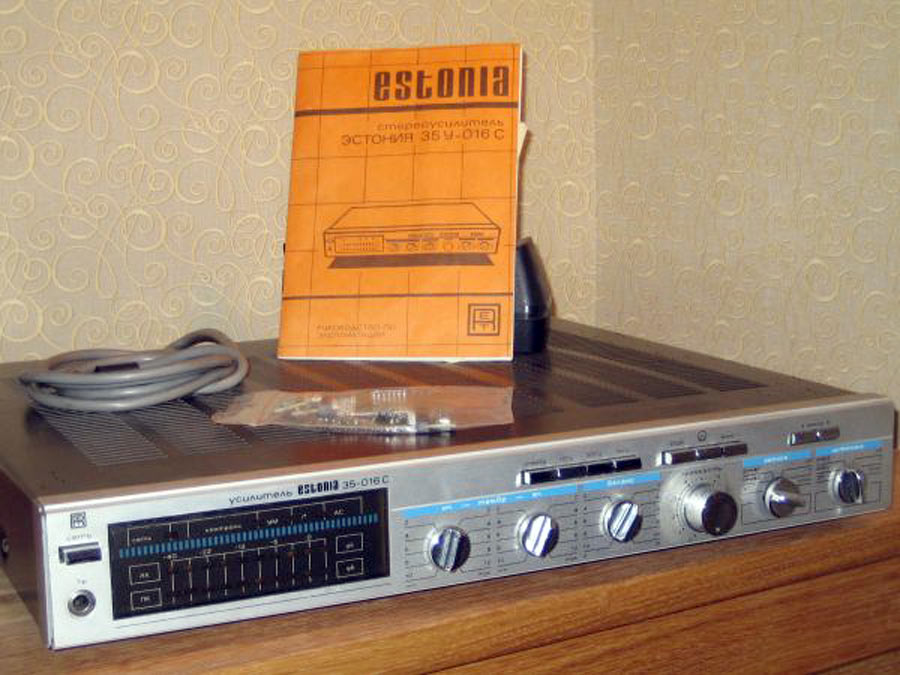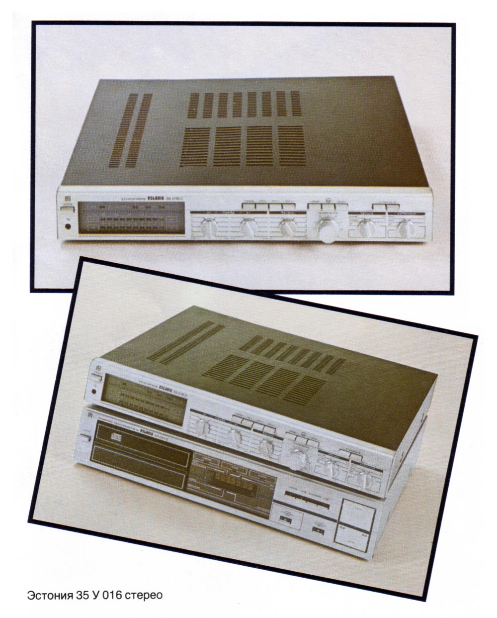 Стереофонический полный усилитель *Эстония 35У-016-стерео* с 1987 года выпускал Таллинский завод *Пунане РЭТ*. Усилитель предназначен для высококачественного усиления звуковых фонограмм с различных источников. В усилителе применены: индикаторы перегрузки; фильтры ограничения высоких и низких частот; селектор входов; отключаемая тонкомпенсация; устройство защиты УМ от короткого замыкания, перегрева и постоянного напряжения на выходе; электронные индикаторы выходной мощности; встроенный корректирующий усилитель для подключения электропроигрывателя. Технические характеристики: номинальная выходная мощность 2х35 Вт; диапазон воспроизводимых частот 20...25000 Гц; коэффициент нелинейных искажений 0,04%; уровень фона -85 дБ. Потребляемая мощность 130 Вт. Габариты усилителя 430х80х360 мм. Вес 11 кг.