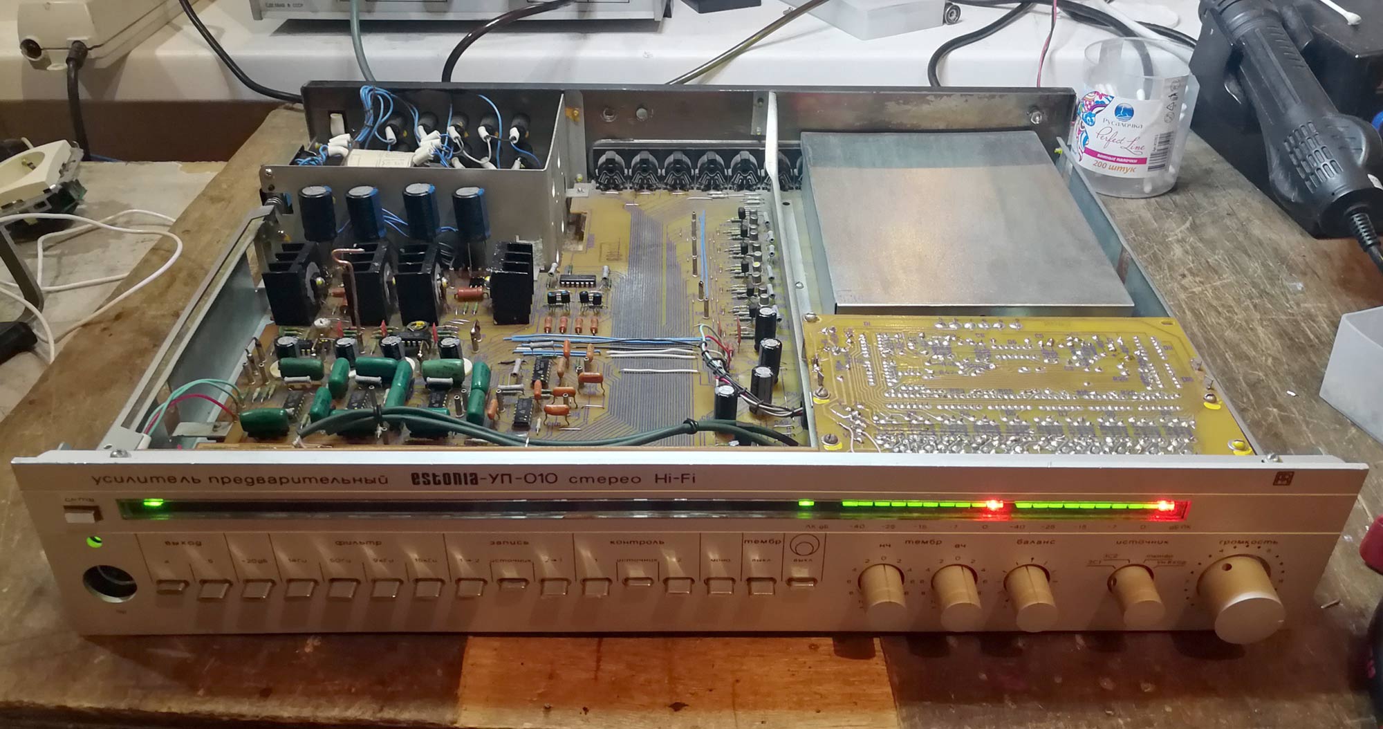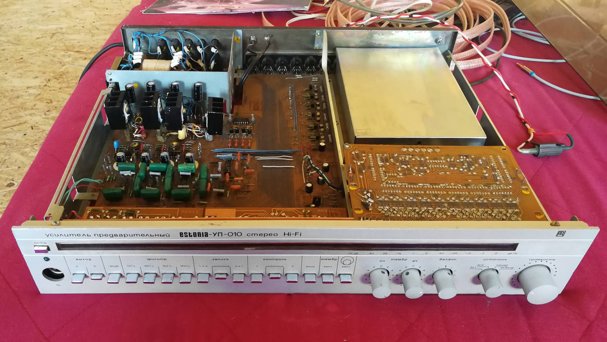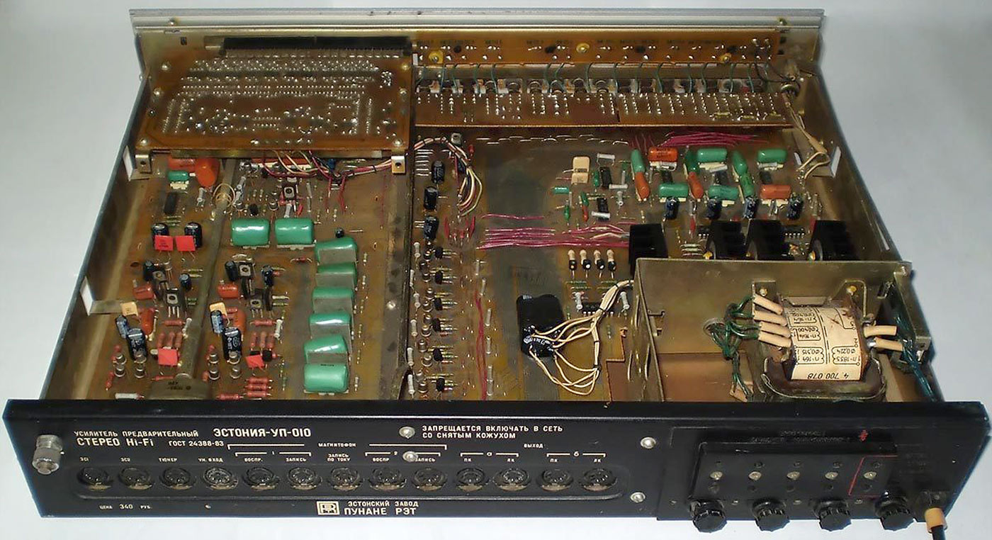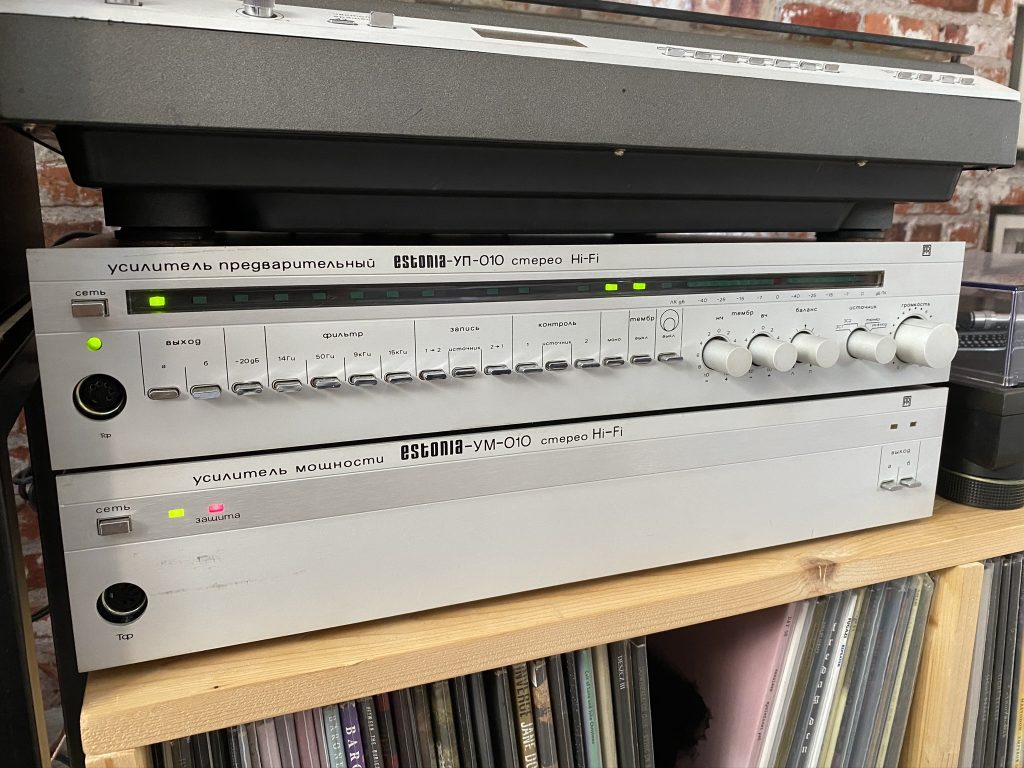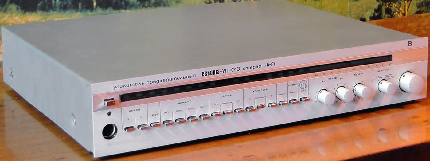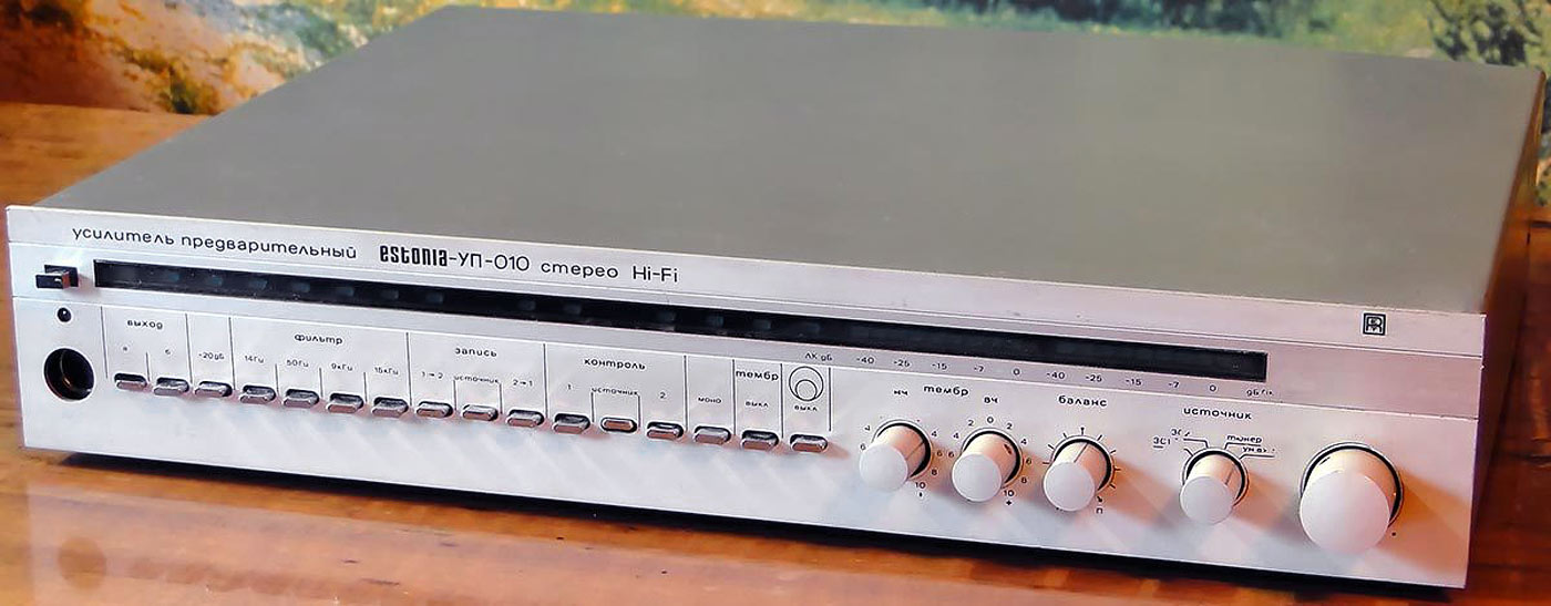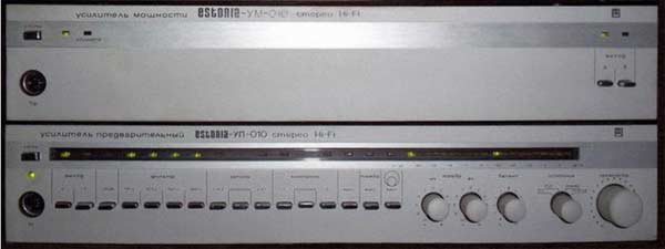 Стереофонический усилитель предварительный "Эстония-УМ-010-стерео" с 1987 года выпускал Таллиннский завод "Пунане-РЭТ". УМ предназначен для усиления сигналов 3Ч, поступающих от однотипного или другого предварительного усилителя. УМ имеет: светодиодные индикаторы режимов работы; электронную защиту от перегрузок; стереотелефоны; две пары АС. Номинальная выходная мощность 2х50 Вт, музыкальная 2х85 Вт. Диапазон воспроизводимых частот 20...25000 Гц. Коэффициент гармоник на частоте 1 кГц - 0,005%, 20 кГц 0,03%. Отношение сигнал/взвешенный шум 105 дБ. Переходное затухание между каналами 56 дБ. Потребляемая мощность 150 Вт. Габариты УМ - 460х360х80 мм. Масса 12,2 кг.