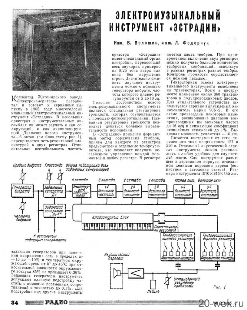 Электромузыкальный инструмент *Эстрадин* с 1965 года выпускал Житомирский завод *Электроизмеритель*. *Эстрадин* представляет собой многоголосый клавишный инструмент на транзисторах и предназначенный для исполнения произведений в небольших оркестров или инструментальных коллективах. Радио №2/1965, ст.34