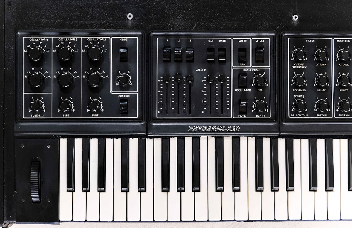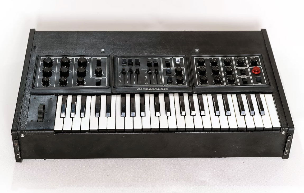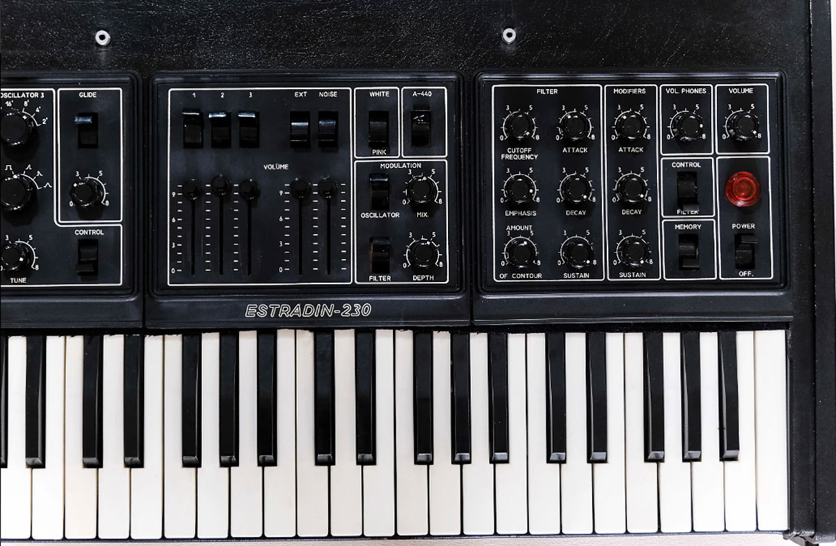 Электронный музыкальный синтезатор *Эстрадин-230* с 1984 года выпускался Житомирским заводом *Электроизмеритель*. Монофонический синтезатор *Эстрадин-230* содержит четыре основных источника звука, три тональных генератора и источник шума, допускает подключение внешнего источника (электрогитары, электрооргана). Фильтр нижних частот синтезатора, предназначенный для изменения гармонического состава сигналов звуковой частоты в режиме самовозбуждения играет роль дополнительного, 5-го источника звука. Имеется возможность управлять параметрами таких переходных процессов формирования звуков, как атака, затухание и поддержка. Предусмотрен эффект скользящего перехода от одного звука к другому. Инструмент ЭМС имеет устройство памяти, позволяющее сохранять звучание тона после снятия пальца с клавиши, а также устройство глиссандо (питч-бэнд), модуляционный микшер, фильтр, управляемый с клавиатуры. Частотный диапазон инструмента 1:20000Гц. Для настройки имеется внутренний генератор тона <ля> (440Гц).