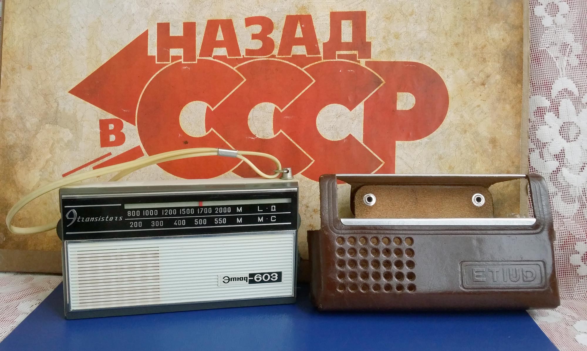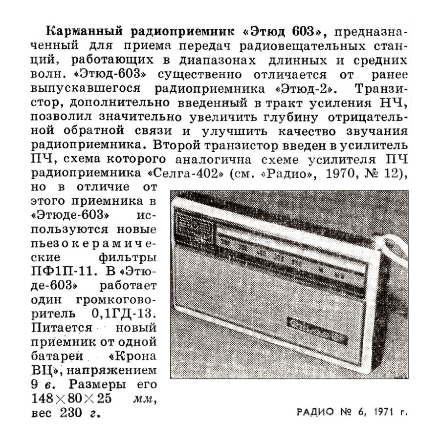 Портативный транзисторный радиоприёмник *Этюд-603* с октября 1971 года выпускал Минский радиозавод. Сначала приёмник назывался **Этюд-3**, по варианту разработки, позже **Этюд-603**. Цифры 603, означают что приёмник вне класса. Радиоприёмник является модернизацией модели **Этюд-2**, но его схема отличается от предшественника. Для переноски применён ремень в виде петли одеваемой на кисть руки. В приёмнике использованы новые кремниевые транзисторы КТ315 и пьезокерамический фильтр ПФ1П-11. Схема представляет возможность в дальнейшем перейти на интегральные МС (не сложилось). Диапазоны ДВ и СВ. Чувствительность 3,0 и 2,5 мВ/м. Селективность 16 дБ. Номинальная мощность УЗЧ - 60 мВт. Громкоговоритель 0,1ГД-13. Питание от батареи *Крона*. Ток покоя 10 мА. Габариты модели 148х80х25 мм. Масса 230 гр. Экспортный приёмник назывался *COMIX-102*.