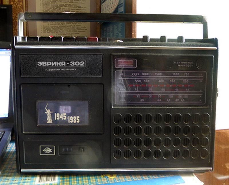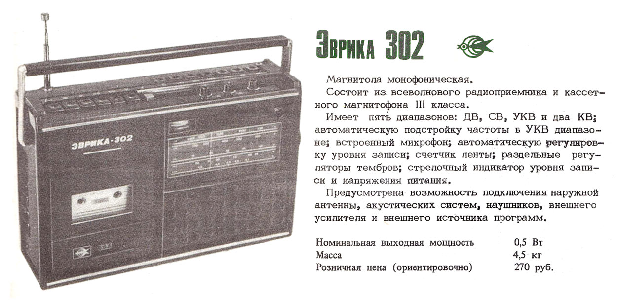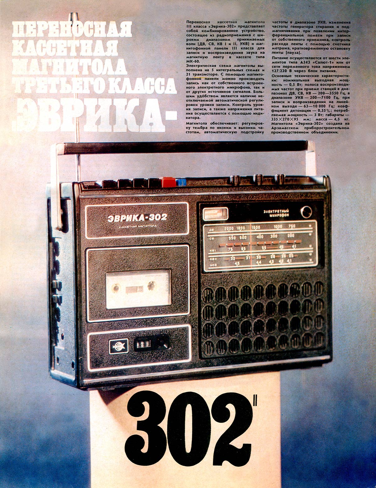 Переносная кассетная магнитола *Эврика-302* с 1980 года выпускалась Арзамасским приборостроительным производственным объединением. Магнитола 3-й группы сложности с AM-ЧМ трактами 3-й группы сложности и магнитофонной панелью 4-й группы сложности предназначена для приёма в диапазонах ДВ, СВ, KB и УКВ и для записи и воспроизведения звука с применением кассет типа МК. Магнитола позволяет производить запись с встроенного микрофона, внешнего микрофона, приёмника, телевизора, радиолинии, звукоснимателя или внешнего магнитофона. Качественную запись обеспечивает неотключаемая система АРУЗ. Уровень напряжения питания контролируется индикатором. Расход ленты осуществляется счётчиком. В модели имеется устройство временной остановки ленты. К магнитоле можно подключить усилитель с АС. В ДВ, СВ приём ведется на внутреннюю магнитную антенну, в KB и УКВ на телескопическую. Имеется гнездо для подключения внешней антенны. Питание магнитолы осуществляется от 6-ти элементов А-343 или от сети через БП. Время работы магнитолы от комплекта батарей ~ 10 часов. Номинальная выходная мощность 0,5 Вт, максимальная 0,8 Вт. Диапазон принимаемых волн: ДВ - 2027...1050 м, СВ - 571,4...186,7 м, KB-1 - 75,9...40,5 м, КВ-2 31,9...24,8 м, УКВ - 4,56...4,06 м. Чувствительность в диапазонах ДВ - 2,2 мВ/м, СВ - 1,2 мВ/м, KB-1,2 - 0,5 мВ/м, УКВ - 0,1 мВ/м. Диапазон воспроизводимых частот в диапазонах АМ - 200...3550 Гц, УКВ-ЧМ - 200...7100 Гц. Диапазон воспроизводимых частот при работе МП на линейном выходе 63...10000 Гц. Скорость протяжки ленты 4,76 см/с. Коэффициент детонации 0,4%. Габариты модели - 335х270х95 мм. Масса 4,5 кг. Цена магнитолы 250 рублей.