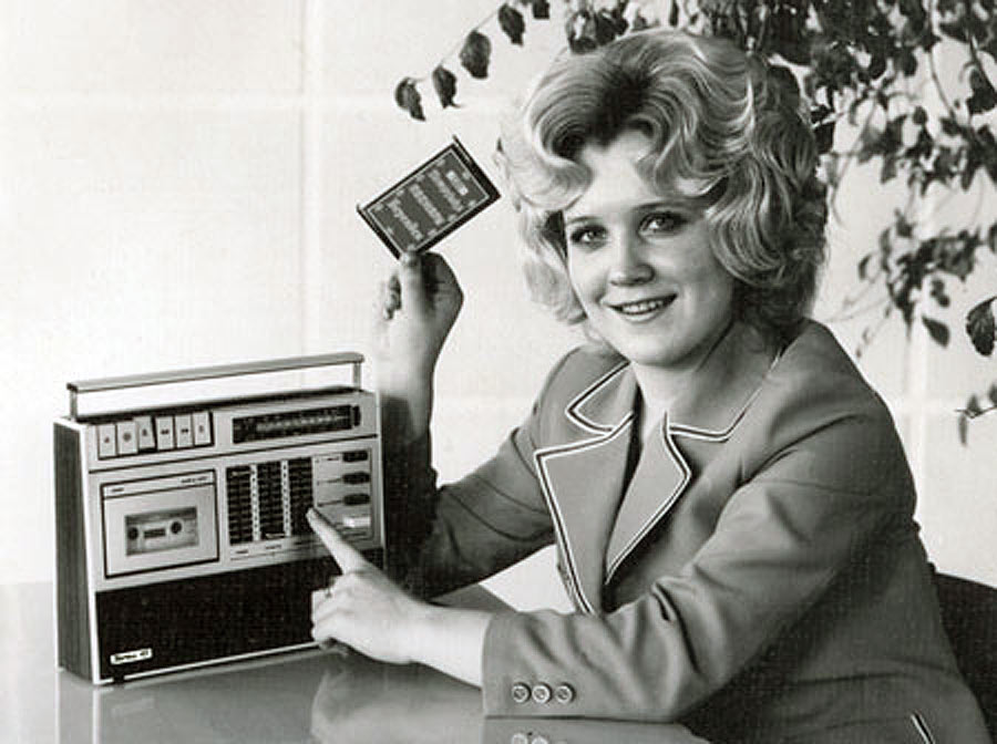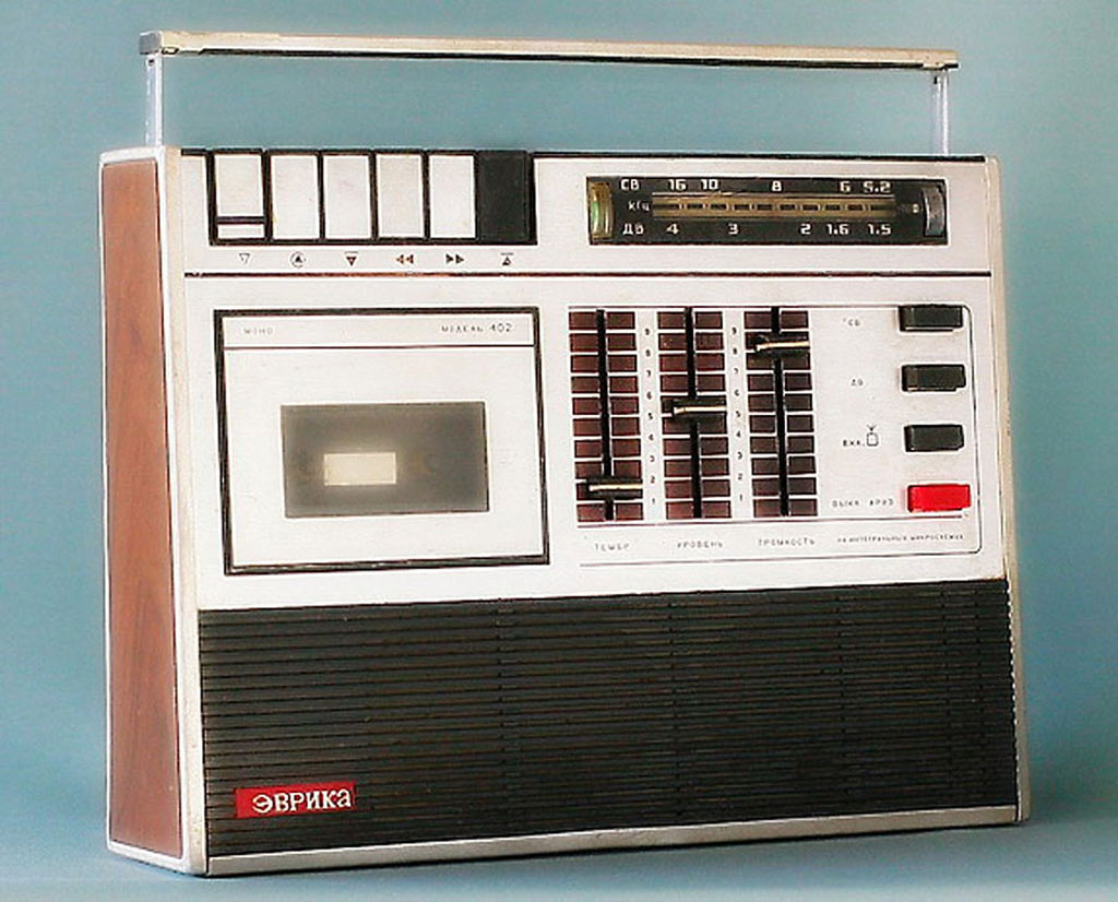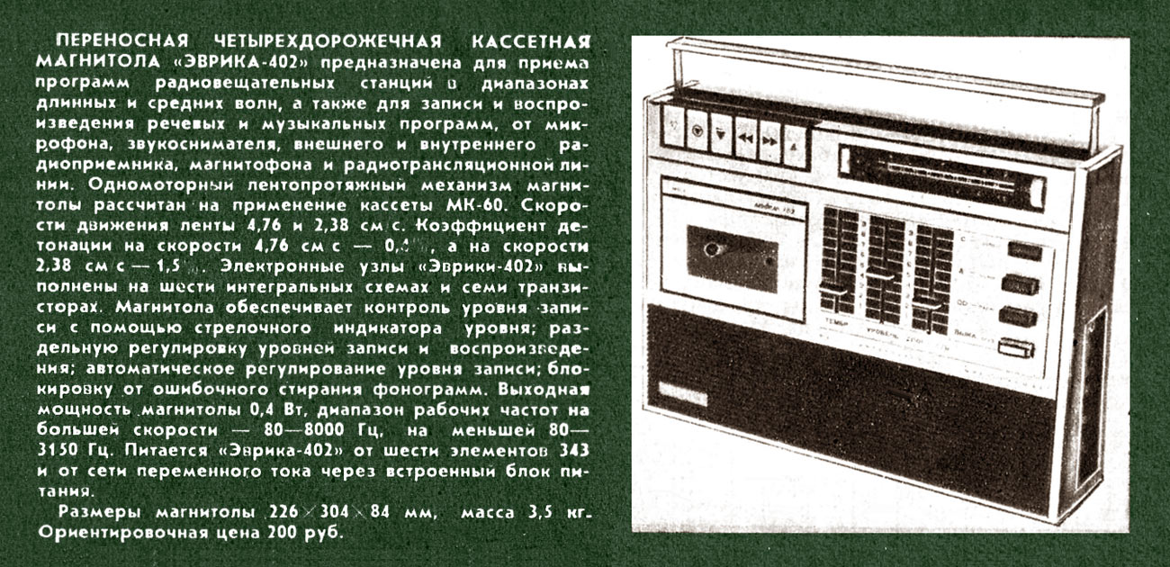 Переносная кассетная магнитола *Эврика-402* с 1975 года выпускалась Арзамасским приборостроительным заводом имени 50-летия СССР. Магнитола предназначена для радиоприёма в диапазонах ДВ, СВ и для записи фонограмм с микрофона, звукоснимателя, внешнего и внутреннего радиоприёмника, магнитофона, радиолинии и других устройств, с последующим воспроизведением фонограмм через встроенные громкоговорители. Одномоторный ЛПМ рассчитан на применение кассеты МК-60. Скорости движения магнитной ленты 4,76 и 2,38 см/с. Коэффициент детонации 0,4 и 1,5%. Электронные узлы магнитолы выполнены на 6 интегральных микросхемах и 7 транзисторах. Магнитола обеспечивает: контроль уровня записи стрелочным индикатором; раздельную регулировку уровней записи и воспроизведения; автоматическое регулирование уровня записи; блокировку кассет от ошибочного стирания фонограмм. Номинальная выходная мощность усилителя магнитолы 0,4 Вт. Диапазон рабочих звуковых частот на линейном выходе на большей скорости 80...8000 Гц, на меньшей 80...3150 Гц. На встроенных громкоговорителях нижний предел частот начинается с 200 Гц. Питается магнитола от шести элементов А-343 или от сети переменного тока, через встроенный блок питания. Размеры магнитолы 226х304х84 мм. Масса 3,5 кг. Цена 200 рублей.