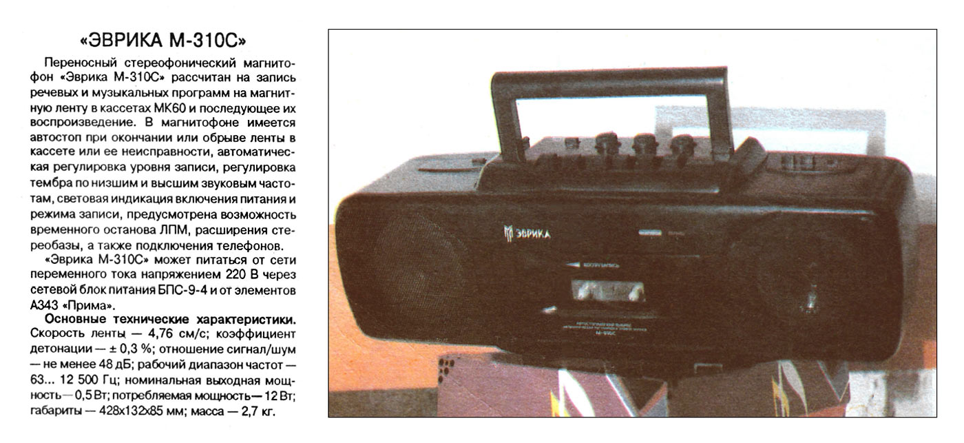 Стереофонический магнитофон *Эврика М-310С* с 1992 года выпускал Махачкалинский завод радиотоваров. В магнитофоне имеется автостоп при окончании и обрыве ленты в кассете и её заедании, АРУЗ, регулировка тембров, световая индикация включения питания и режима записи, пауза, расширения стереобазы, подключение стереотелефонов. Питание от сети через выносной БП или от элементов А-343. Коэффициент детонации ± 0,3 %. Диапазон частот на ЛВ - 63...12500 Гц. Номинальная выходная мощность 0,5 Вт. Потребляемая от сети мощность 12 Вт. Габариты магнитофона - 428 х 132 х 85 мм. Масса - 2,7 кг.